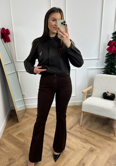 Klasyczne, eleganckie czarne spodnie, które podkreślają sylwetkę i świetnie sprawdzą się zarówno w stylizacjach biznesowych, jak i wieczorowych. Model posiada wysoki stan, który pięknie wysmukla talię, oraz proste, lekko rozszerzane nogawki, dodające nogom długości i proporcji. Spodnie zostały wykonane z miękkiego, komfortowego materiału, który układa się idealnie i nie gniecie się w ciągu dnia. Zapinane…