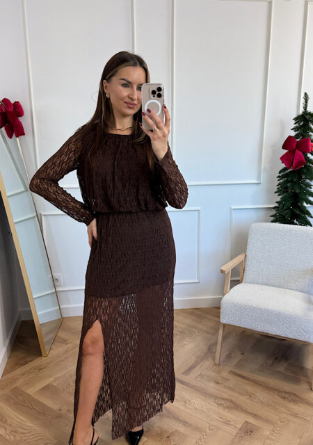 Sukienka midi Luna. Ta elegancka sukienka koronkowa to propozycja stworzona z myślą o wyjątkowych okazjach. Uszyta z pięknej, ażurowej koronki w głębokim, czekoladowym odcieniu, subtelnie podkreśla sylwetkę, jednocześnie pozostając bardzo kobieca i szykowna. Model ma dopasowany krój, który delikatnie opina talię i biodra, a długi rękaw dodaje całości elegancji. Z przodu znajduje się zmysłowe rozcięcie…