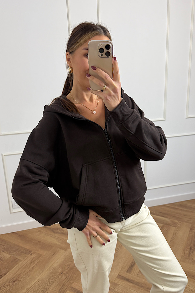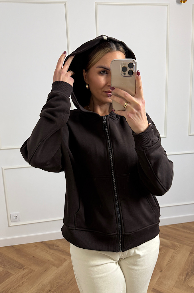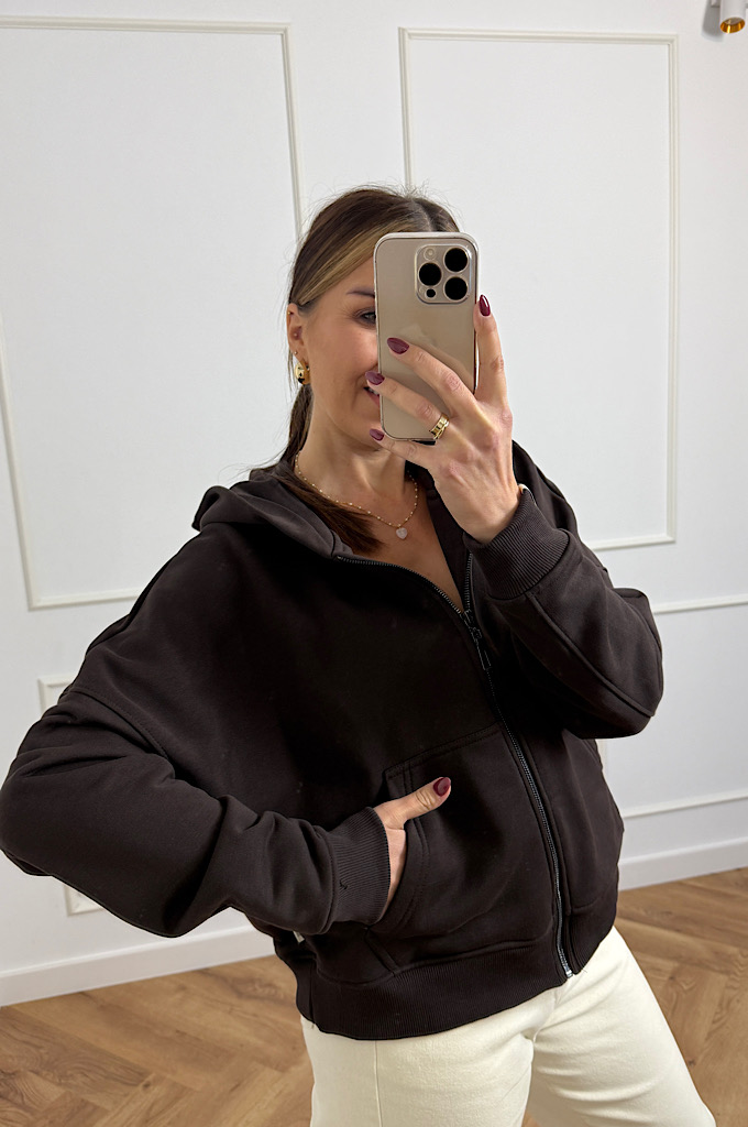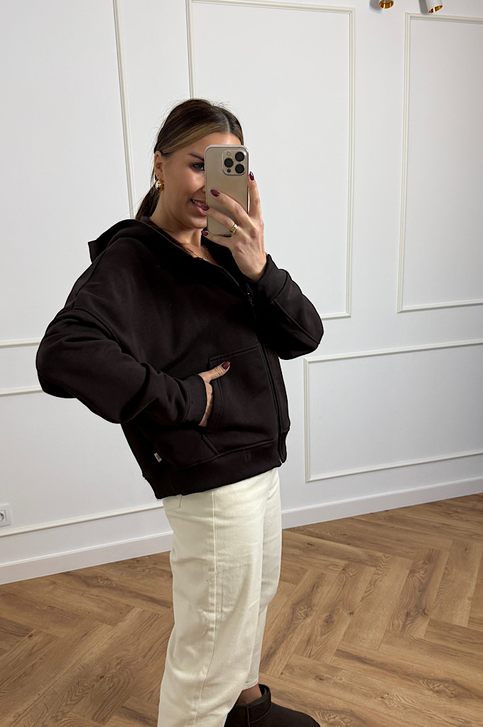 Bluza czekoladowa zapinana na zamek błyskawiczny. Typ lekko  oversize krótka, wykonana z wysokiej jakości- mięsistej pętelkowej ciepłej bawełny. Modny krój, lekko opuszczony rękaw oraz dół bluzy wykończone ściągaczem. Bluza posiada kaptur oraz kieszenie z przodu bluzy.