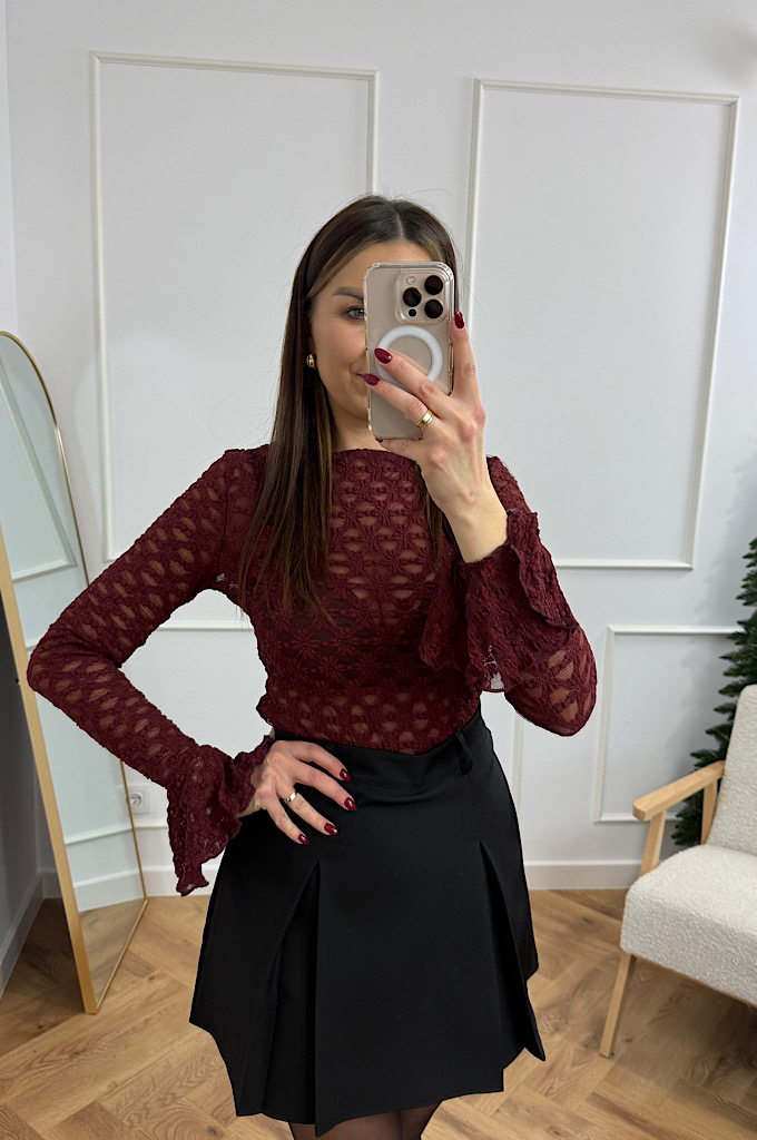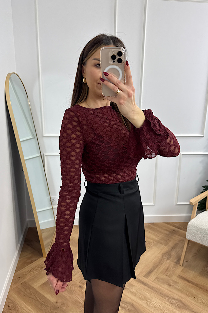 Ta burgundowa bluzka wykonana z delikatnej, ażurowej koronki to model, który podkreśla kobiecość w najpiękniejszym wydaniu. Jej dopasowany fason w połączeniu z transparentnymi, długimi rękawami tworzy efekt subtelnej zmysłowości, a jednocześnie pełnej klasy elegancji.