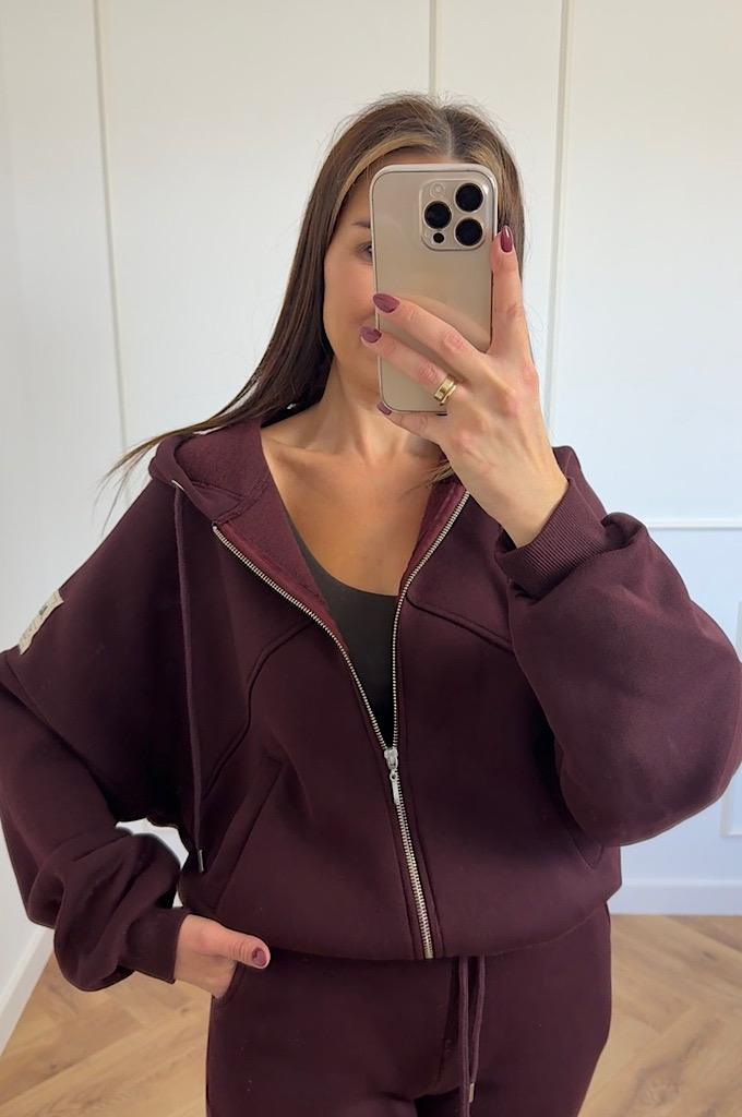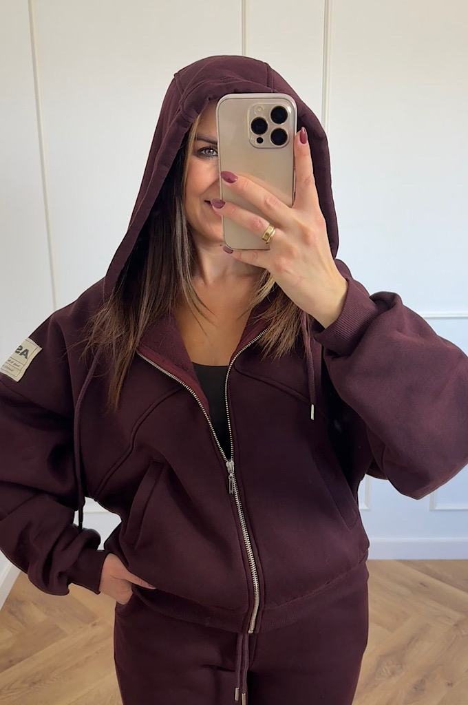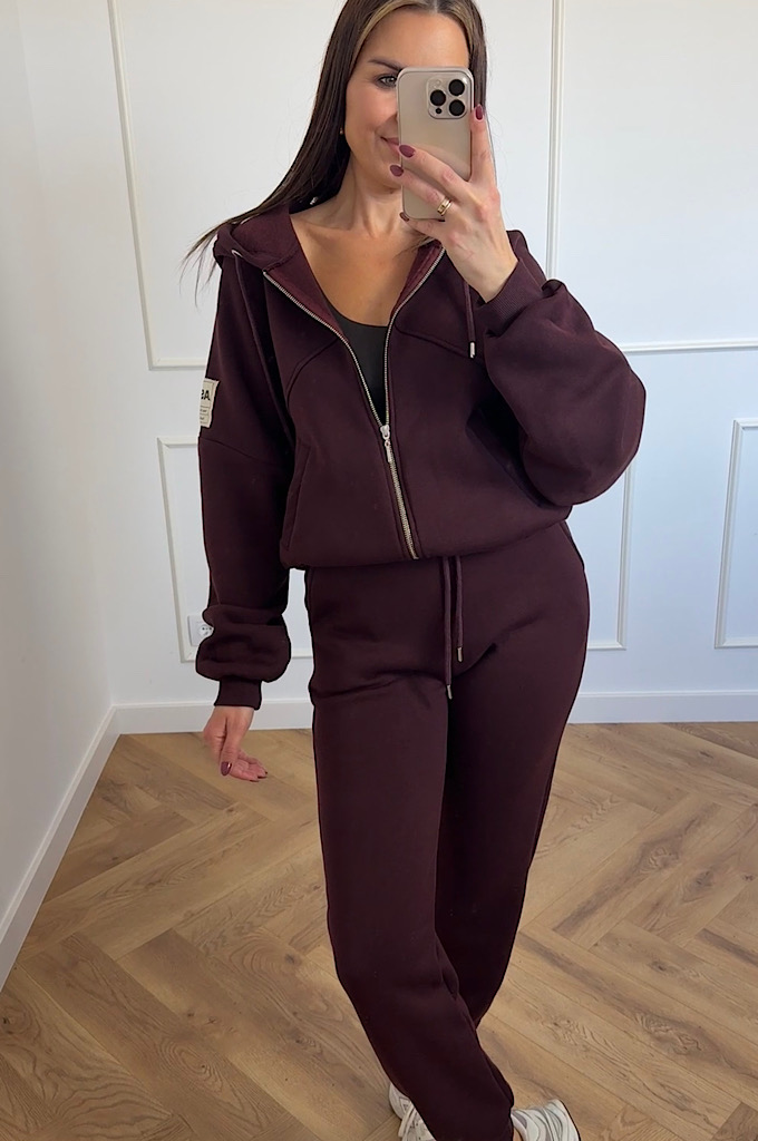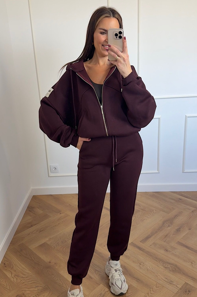 Kolor głębokiego burgundu dodaje elegancji, dzięki czemu ten komplet możesz śmiało założyć także na miasto — w połączeniu z modnymi sneakersami lub płaszczem stworzy stylowy, casualowy look.