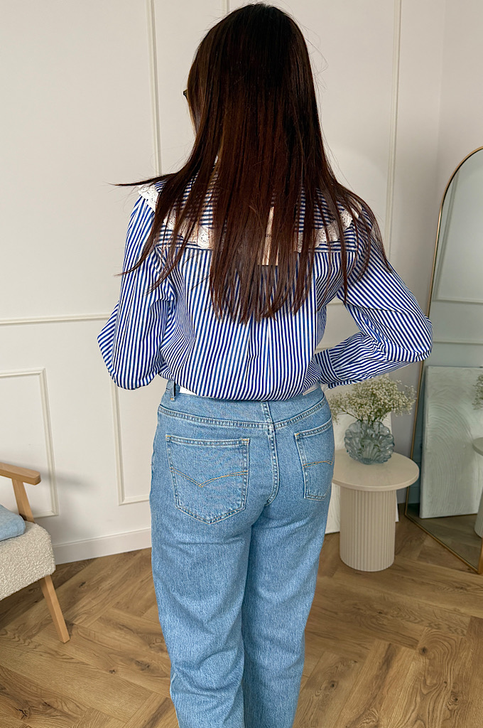 Koszula w klasyczne, granatowo-białe paski została uzupełniona efektownym, koronkowym kołnierzykiem w stylu retro oraz delikatnym wykończeniem mankietów. To model, który pięknie łączy klasykę z subtelną kobiecością.