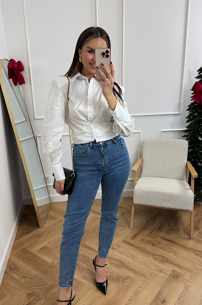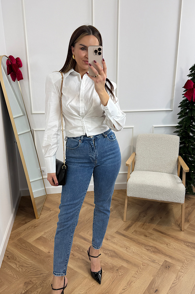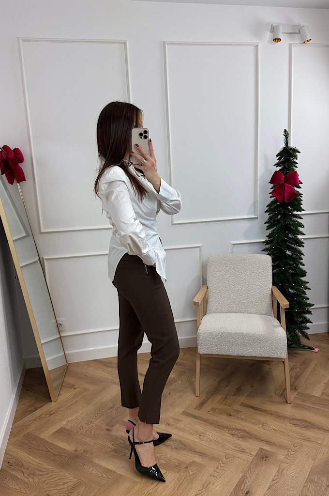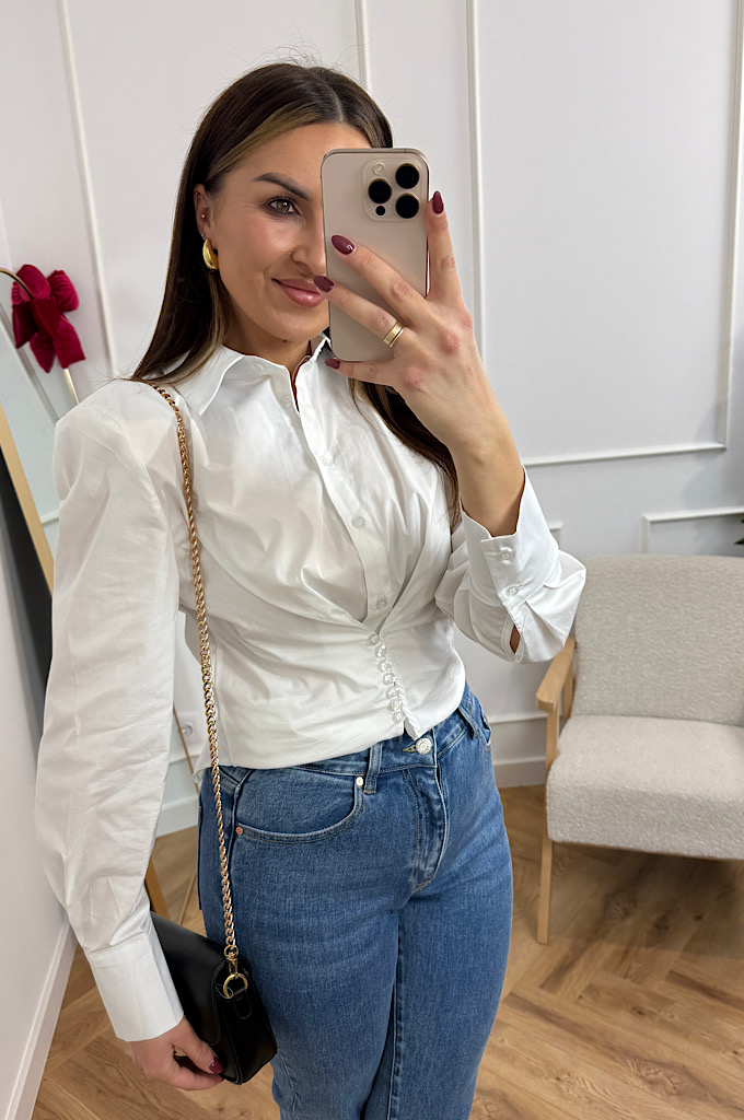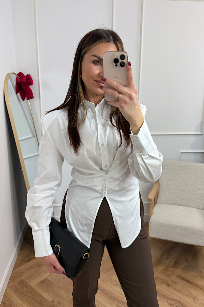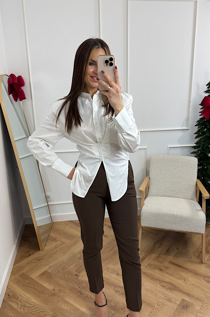 Stylowa, klasyczna koszula w nowoczesnym wydaniu. Model wykonany z gładkiego, lekko sztywnego materiału, który pięknie trzyma formę. Największym atutem koszuli jest wyprofilowane taliowanie oraz dekoracyjne marszczenie z guzikami, które podkreśla sylwetkę i dodaje całości wyjątkowego charakteru.