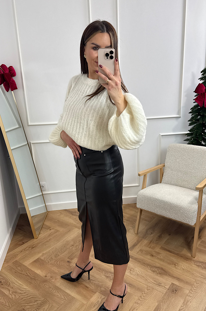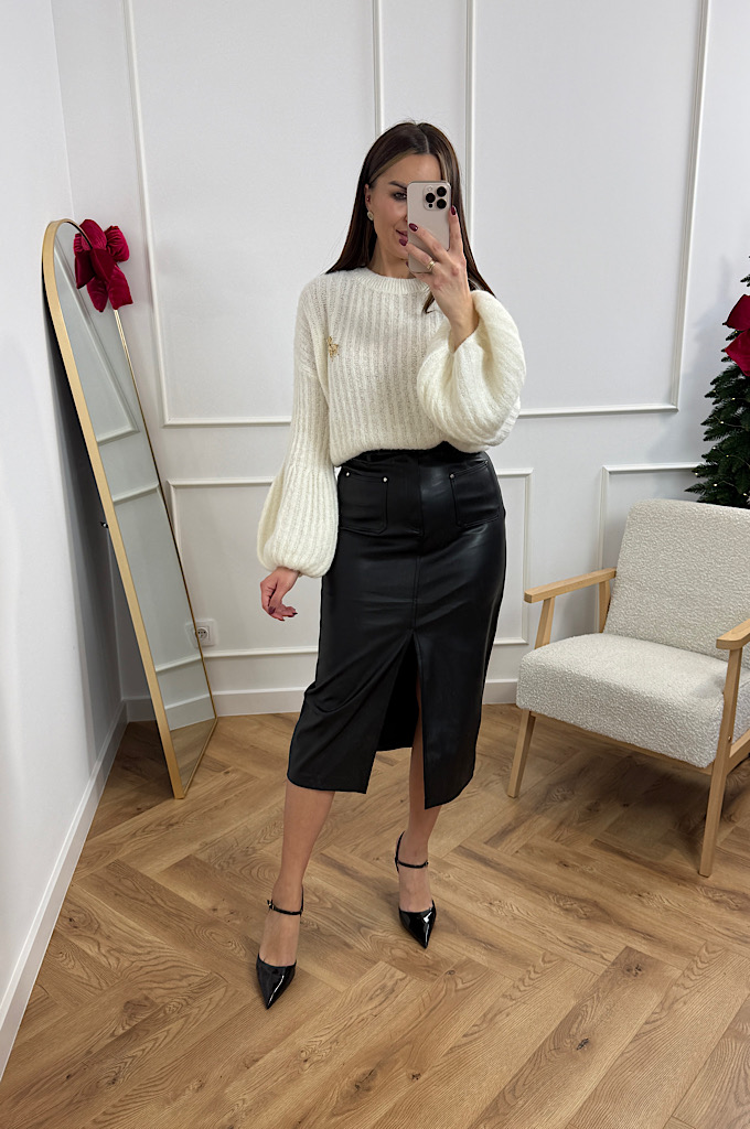 Spódnica midi z ekoskóry w rozmiarówce S-L. Spódnica posiada guzik i zamek, dół spódnicy z lekkim rozporkiem. Spódnica jest lekka, wygodna, uciągliwa. W zestawie pasek.
