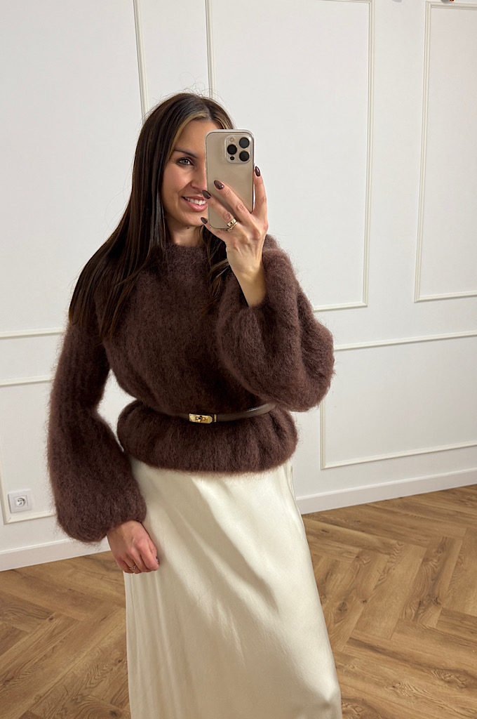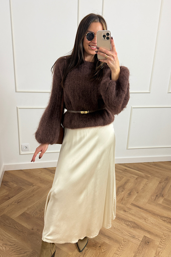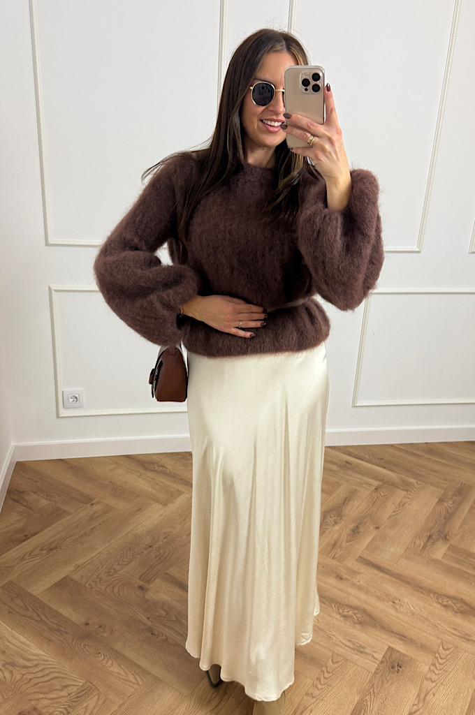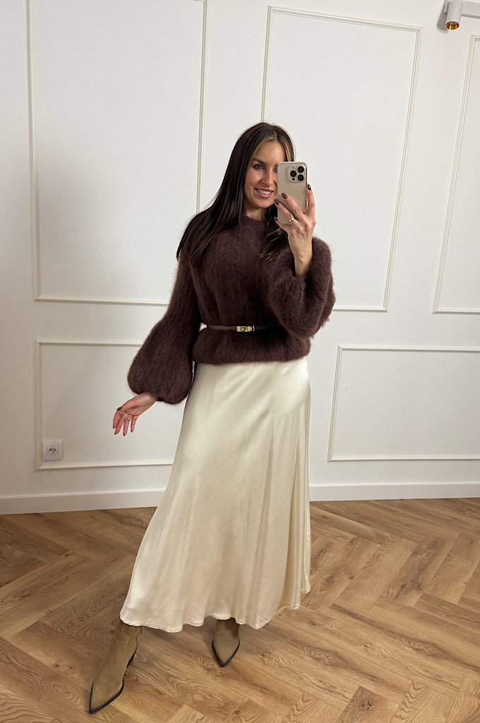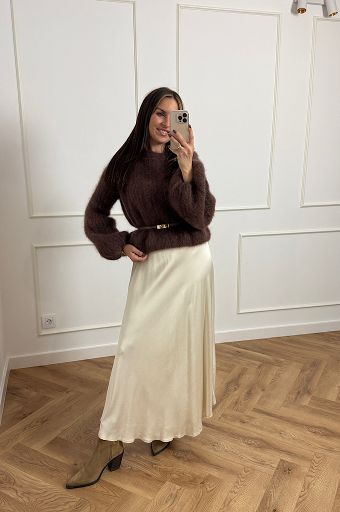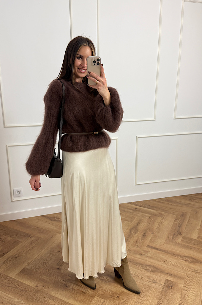 Spódnica z wiskozy i jedwabiu z lekkim połykiem satynowym. Spódnica posiada gumkę w pasie.