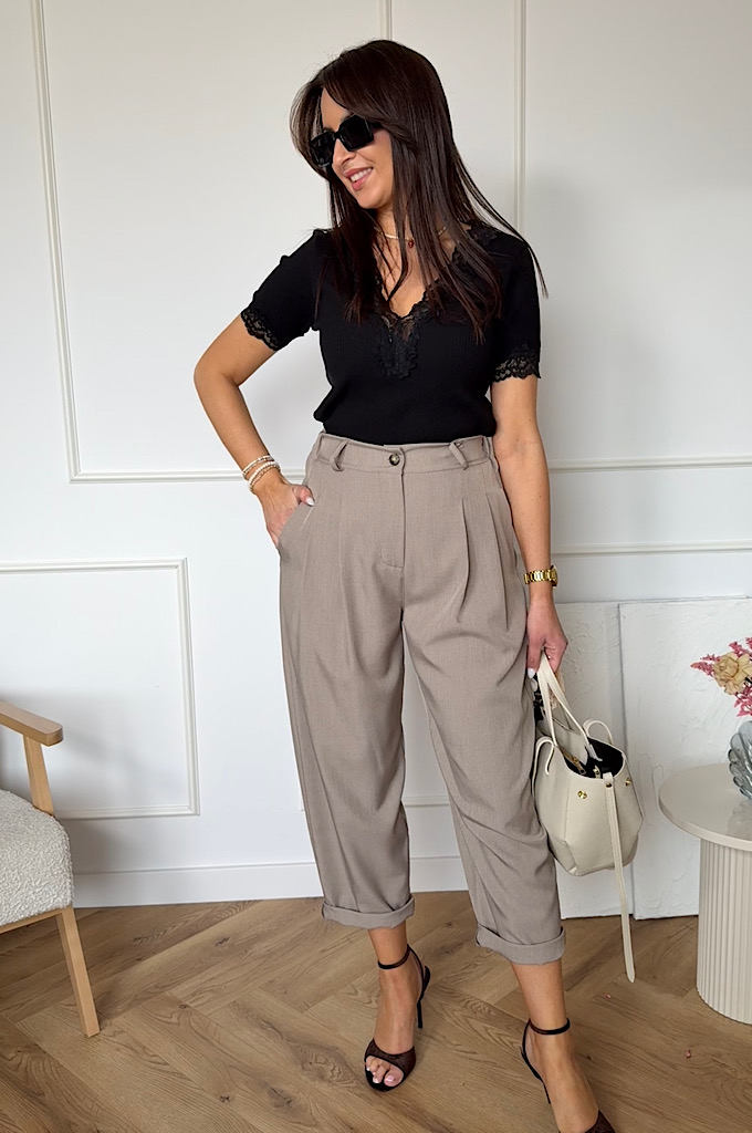 Stylowe spodnie o ponadczasowym kroju, które łączą elegancję z codziennym komfortem. Wysoki stan pięknie podkreśla talię, a lekko zwężane nogawki wysmuklają sylwetkę. Model wyposażony w elastyczną gumę w pasie, co zapewnia idealne dopasowanie i wygodę noszenia przez cały dzień.