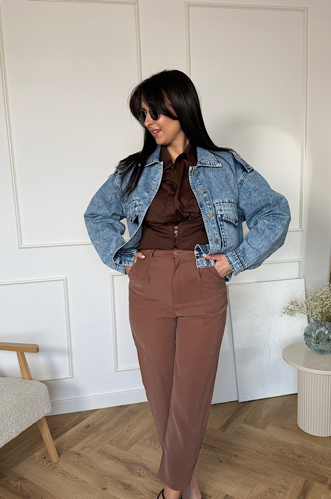 Spodnie jeans typ balloon. Spodnie posiadają wysoki stan, zapinane na zamek i guzik. Ten model spodni łączy wygodę z wyrazistym stylem. Charakteryzują się luźniejszym krojem w biodrach i udach, który delikatnie zaokrągla sylwetkę, a jednocześnie zwęża się ku dołowi, tworząc charakterystyczny „balonowy” kształt nogawki. Wysoki stan podkreśla talię i dodaje kobiecych proporcji, a klasyczny denim sprawia, że spodnie są ponadczasowe i łatwe do stylizacji. Idealne zarówno do casualowych zestawów z t-shirtem, jak i bardziej wyrazistych stylizacji z obcasami czy crop topem.
