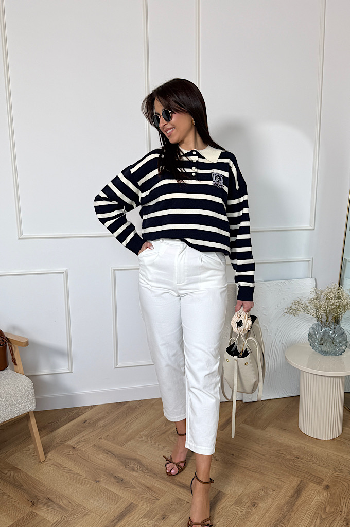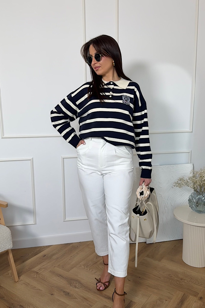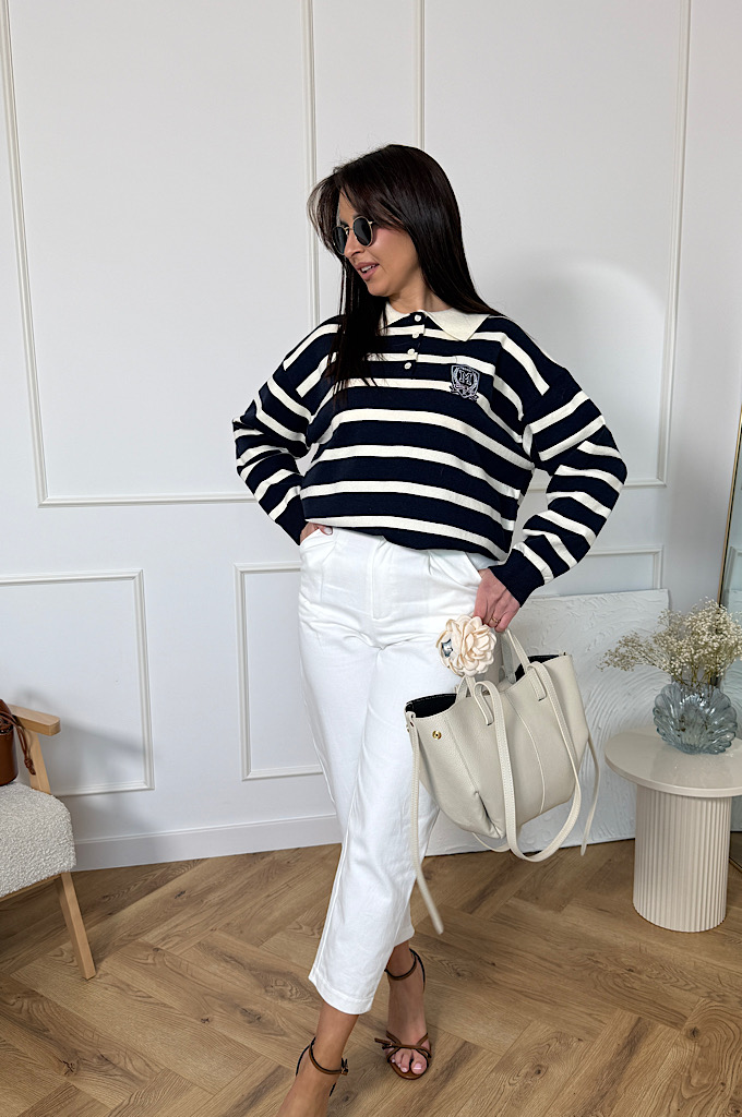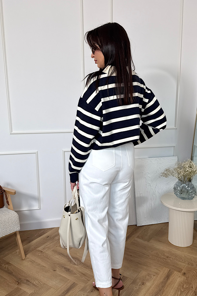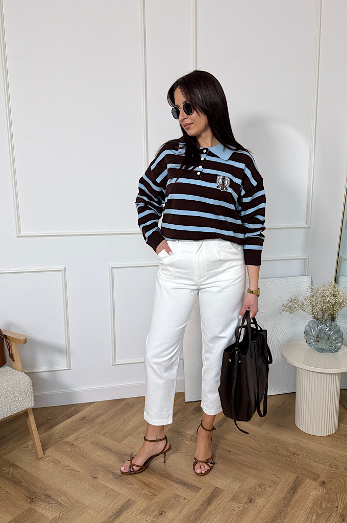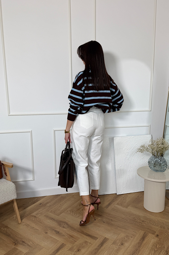 Spodnie jeans typ balloon. Spodnie posiadają wysoki stan, zapinane na zamek i guzik. Ten model spodni łączy wygodę z wyrazistym stylem. Charakteryzują się luźniejszym krojem w biodrach i udach, który delikatnie zaokrągla sylwetkę, a jednocześnie zwęża się ku dołowi, tworząc charakterystyczny „balonowy” kształt nogawki. Wysoki stan podkreśla talię i dodaje kobiecych proporcji, a klasyczny denim sprawia, że spodnie są ponadczasowe i łatwe do stylizacji. Idealne zarówno do casualowych zestawów z t-shirtem, jak i bardziej wyrazistych stylizacji z obcasami czy crop topem.