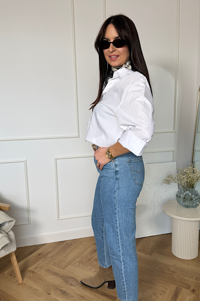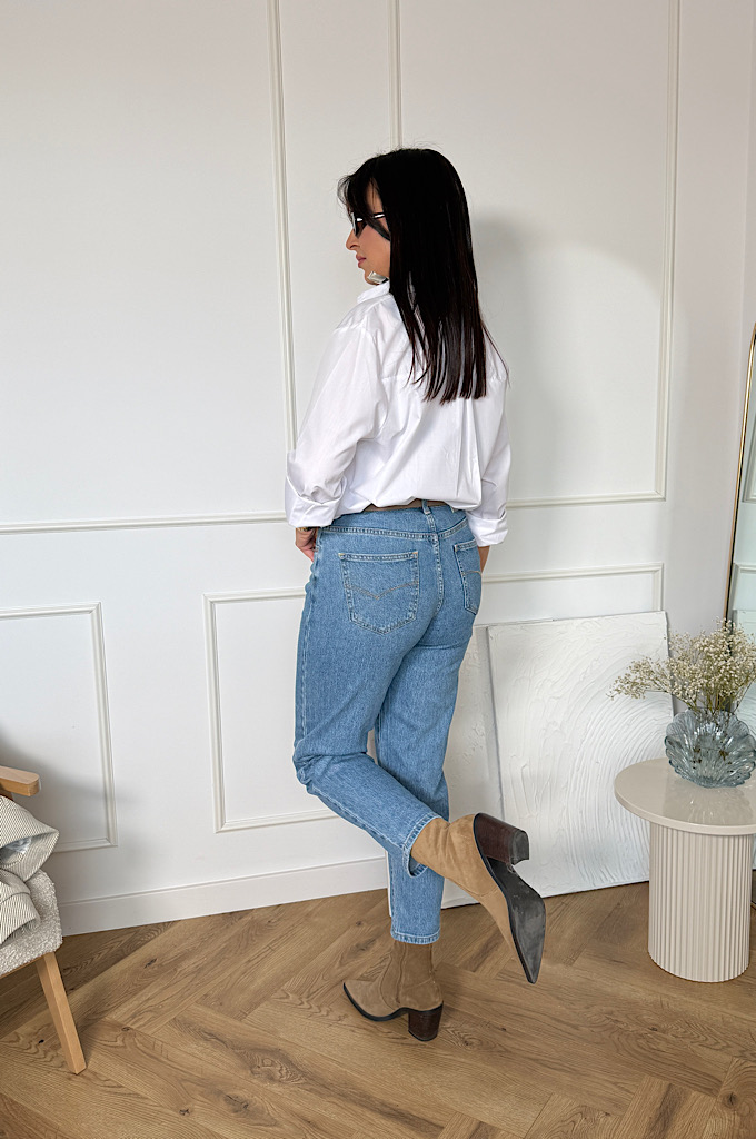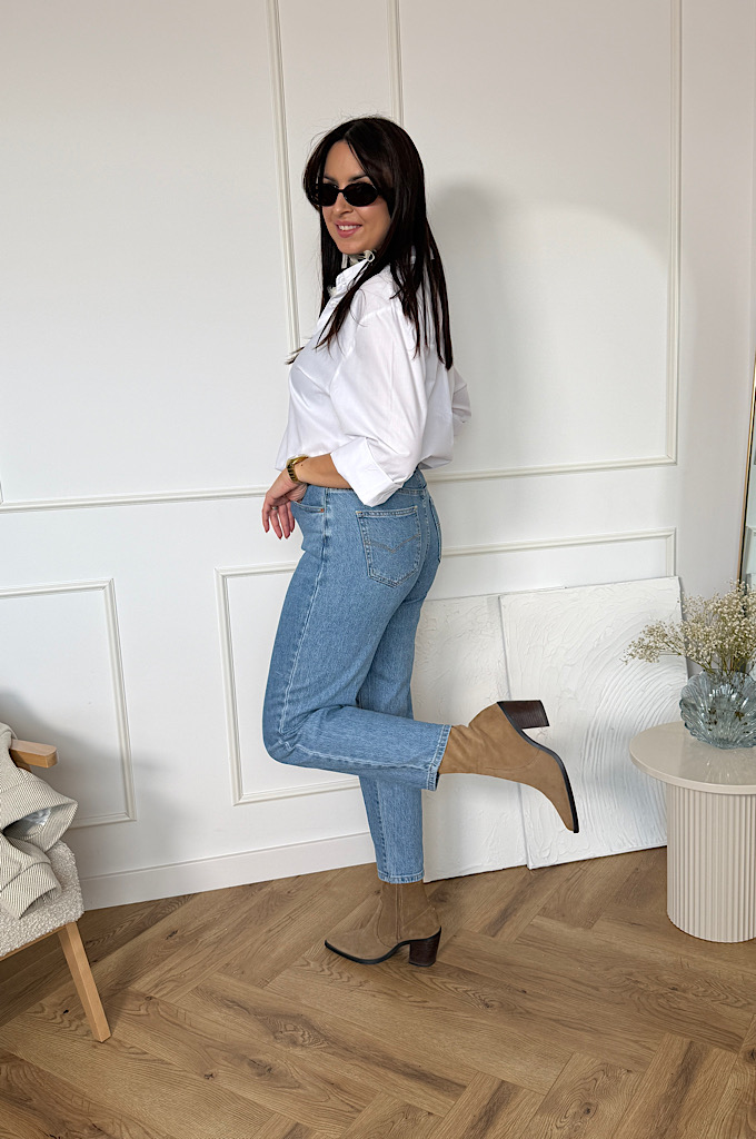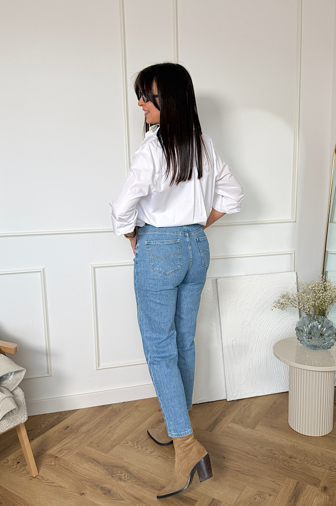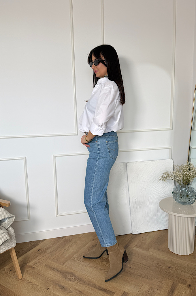 Spodnie jeans o kroju mom fit. Spodnie są bardzo rozciągliwe i wypadają w rozmiar. Modne jeansy z nogawkami o długości 7/8. Ten model jest bardzo kobiecy, a przy tym wygodny i stylowy. Spodnie damskie zostały uszyte z wysokiej jakości denimu, żebyś mogła cieszyć się komfortem noszenia. Jeansy z wyższym stanem to prawdziwy must-have w Twojej szafie.