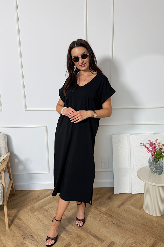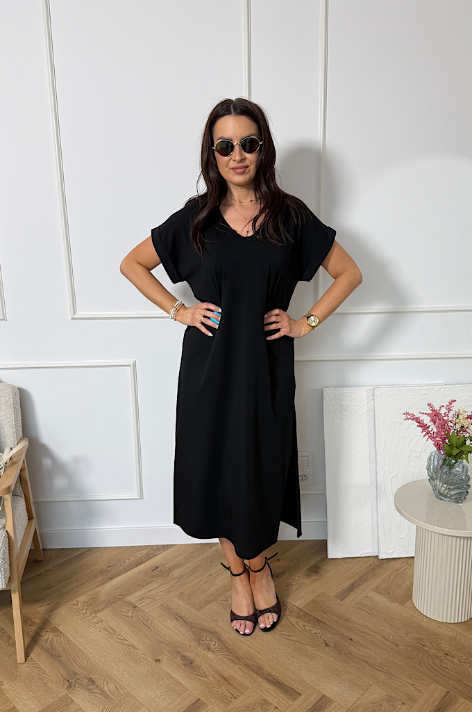 Elegancka sukienka midi to idealna propozycja dla kobiet ceniących minimalizm i wygodę w stylowym wydaniu. Prosty, lekko oversize’owy krój z lekko zarysowaną linią ramion nadaje sylwetce nowoczesnego charakteru. Model bez rękawów, wykonany z przyjemnego w dotyku materiału, zapewnia komfort noszenia nawet w upalne dni. Długość za kolano oraz subtelne rozcięcia po bokach podkreślają kobiecą sylwetkę, jednocześnie gwarantując swobodę ruchów. Sukienka świetnie sprawdzi się zarówno na co dzień, jak i na letnie wyjścia — wystarczy zmienić dodatki.