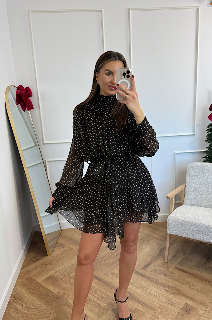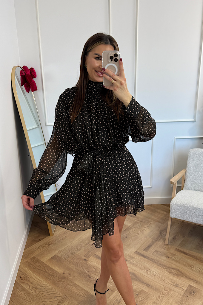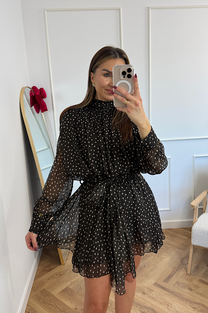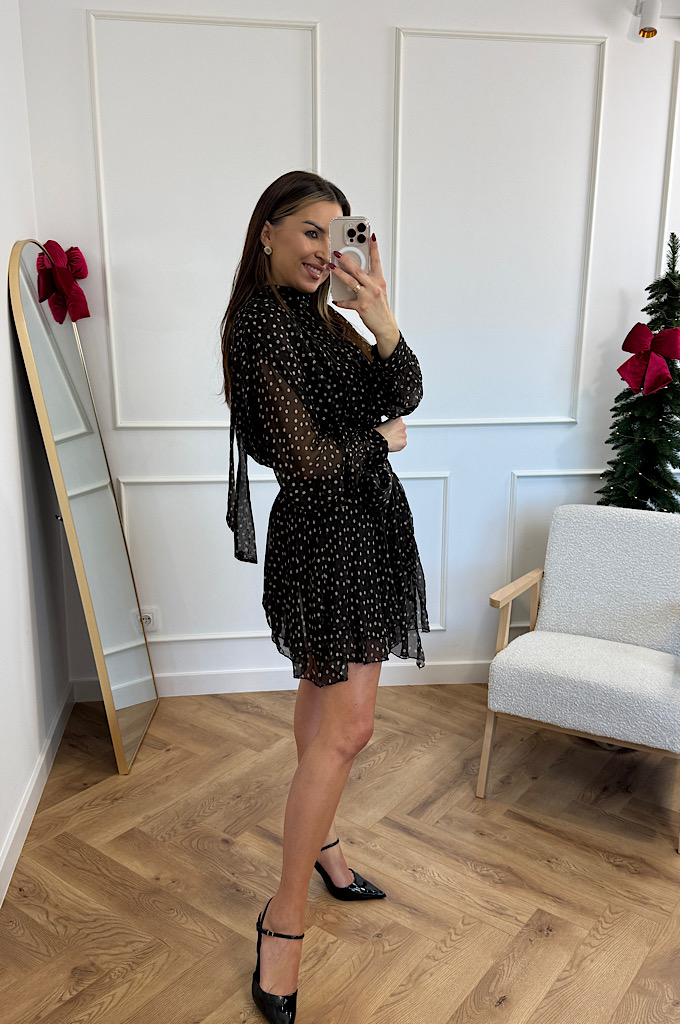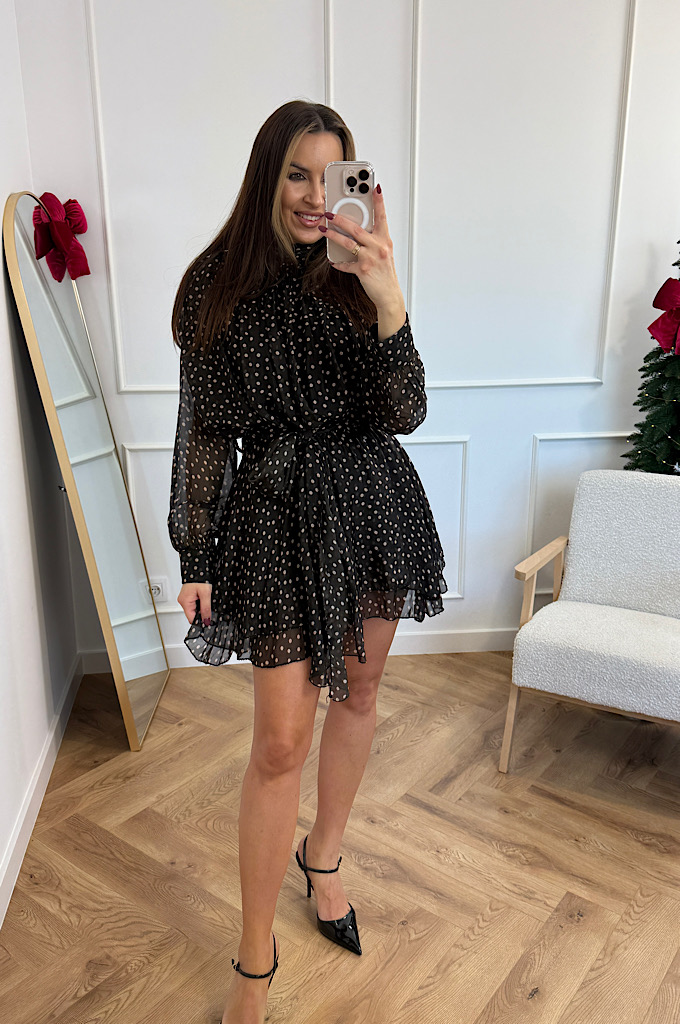 Zachwycająca, zwiewna sukienka mini w czarne tło z delikatnym, jasnym groszkiem. Wykonana z lekkiego, półtransparentnego materiału, który pięknie układa się podczas ruchu. Model posiada: