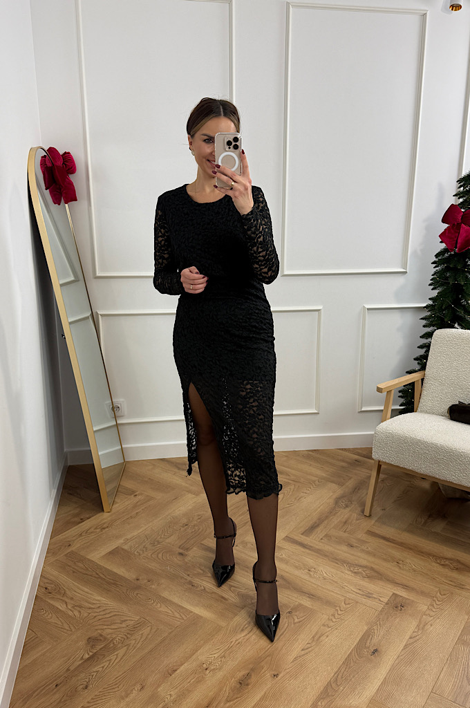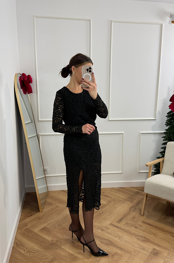 Sukienka midi Luna. Ta elegancka sukienka koronkowa to propozycja stworzona z myślą o wyjątkowych okazjach. Uszyta z pięknej, ażurowej koronki w głębokim, czekoladowym odcieniu, subtelnie podkreśla sylwetkę, jednocześnie pozostając bardzo kobieca i szykowna. Model ma dopasowany krój, który delikatnie opina talię i biodra, a długi rękaw dodaje całości elegancji. Z przodu znajduje się zmysłowe rozcięcie odsłaniające nogę — idealny detal, który nadaje kreacji lekkości i wieczorowego charakteru. Sukienka sprawdzi się na świąteczne spotkania, uroczystości rodzinne i eleganckie przyjęcia, gwarantując efekt „wow”