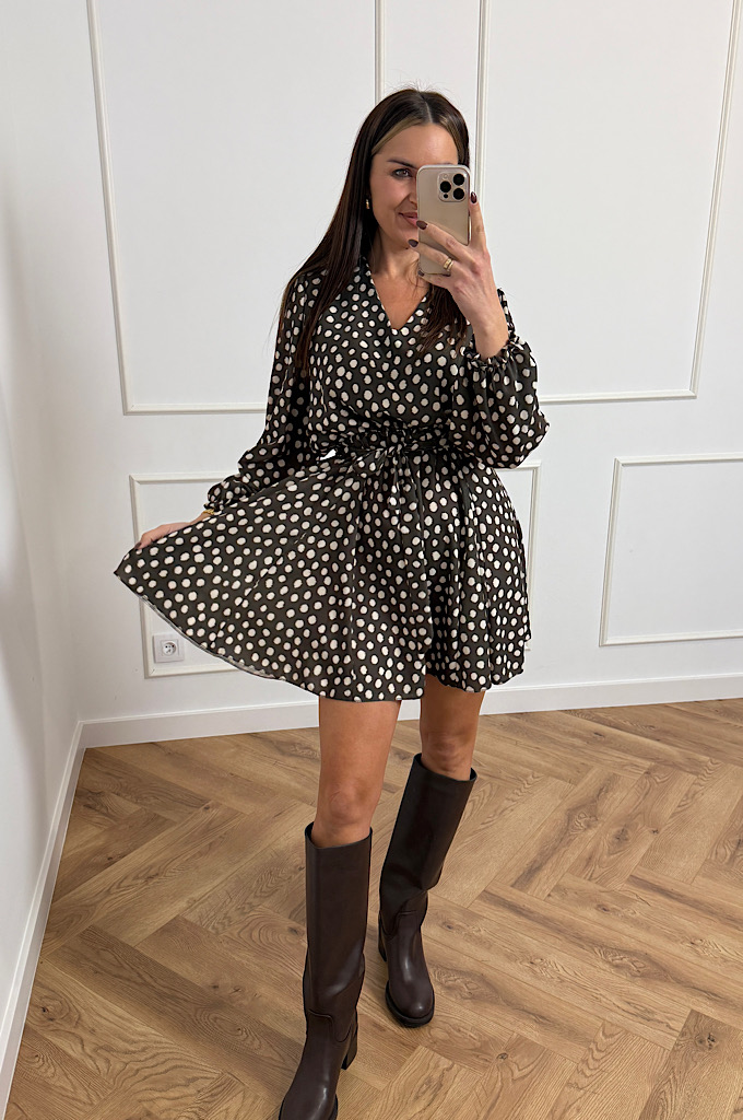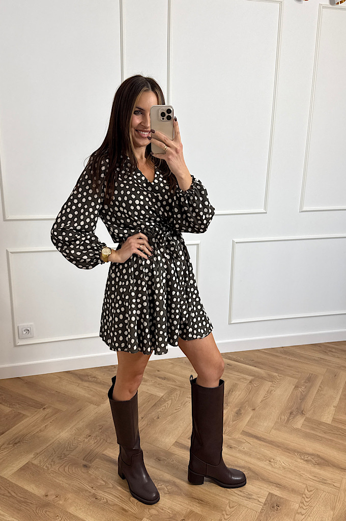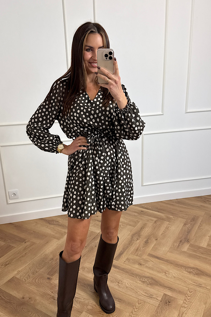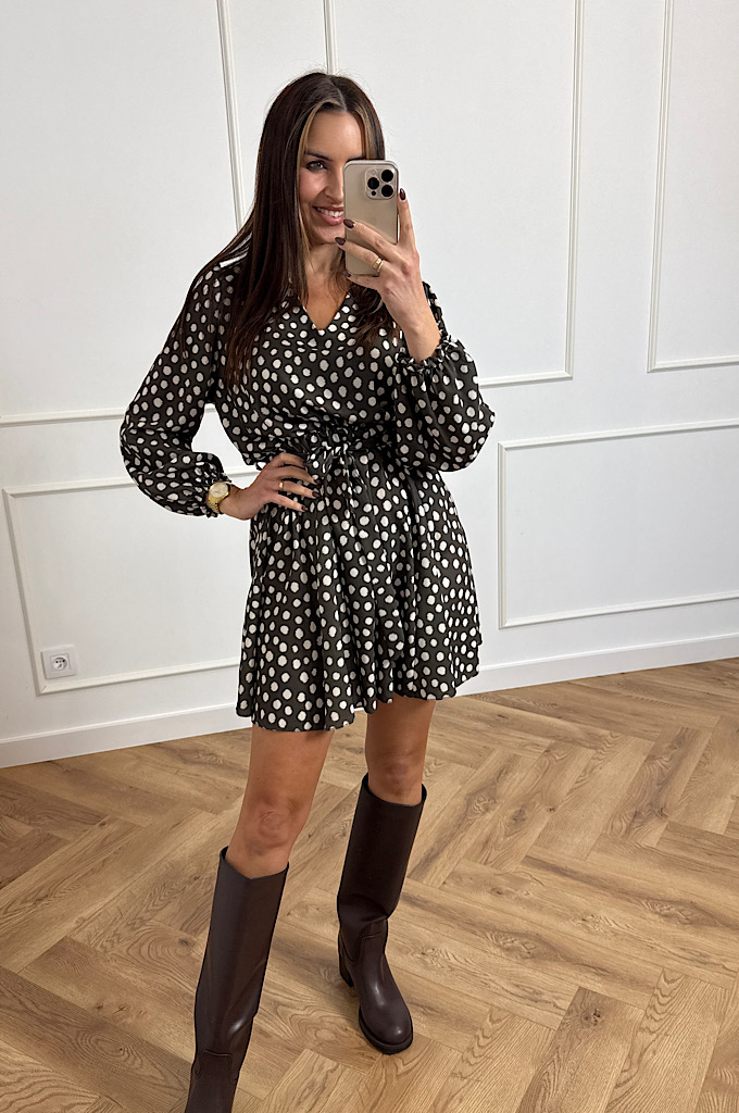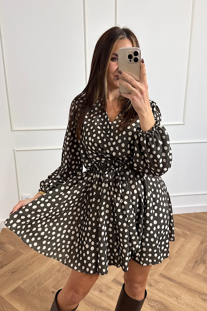 Sukienka w rozmiarze uniwersalnym. Świetnie się sprawdzi dla kobiet w ciąży. Będzie dobra na wiele rozmiarów od XS do XL. Biust w literę V. W pasie gumka, dodatkowo pasek do związania. Rękawek zakończony gumką.