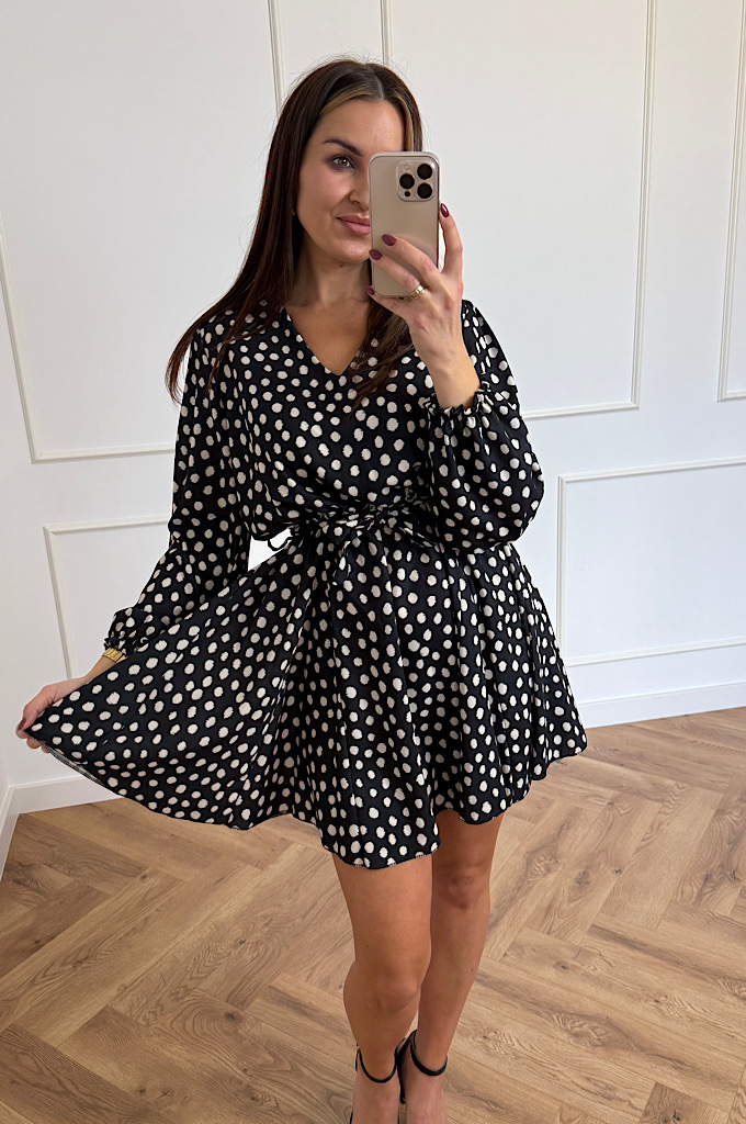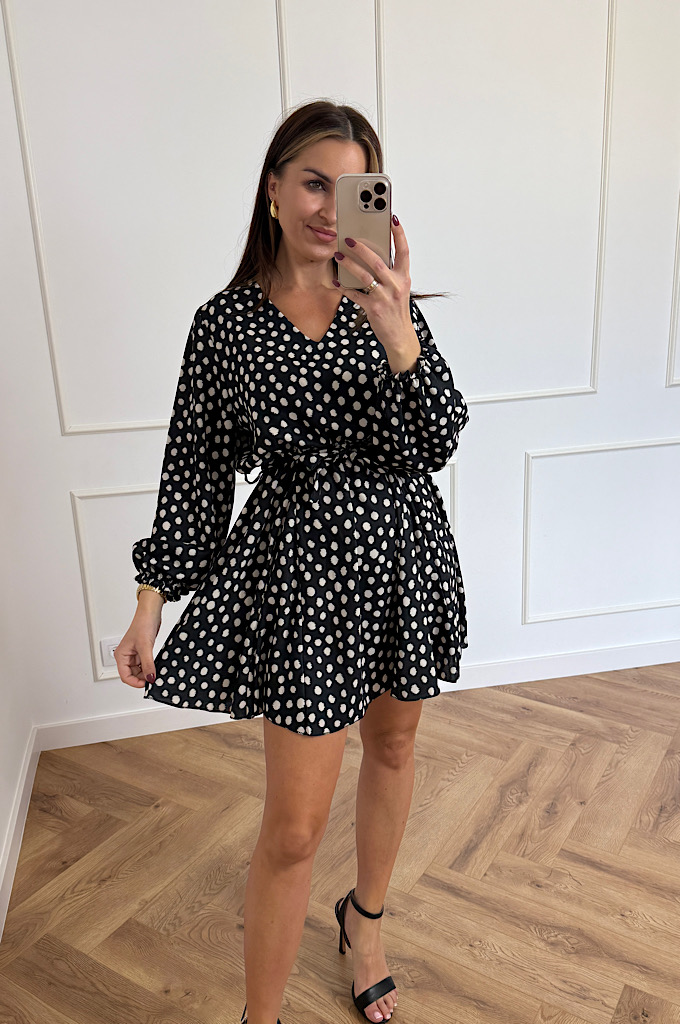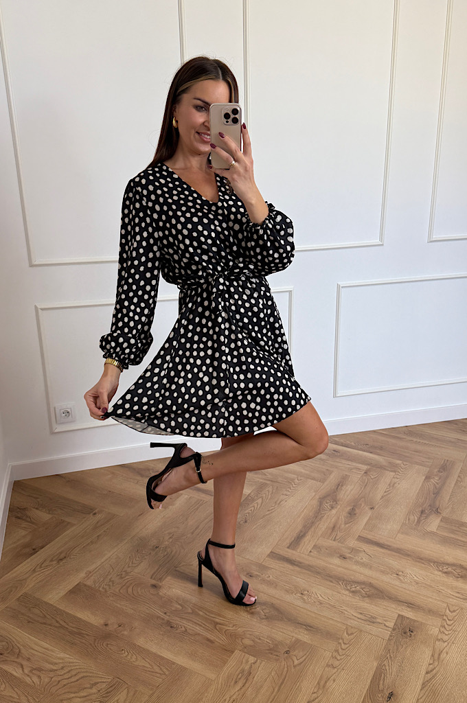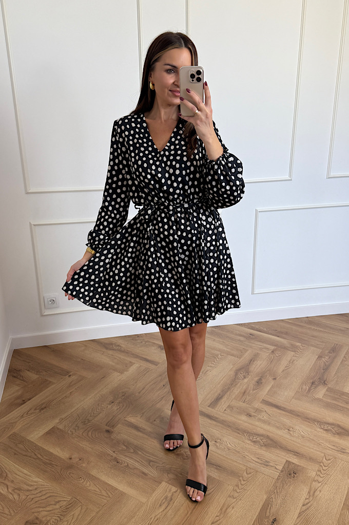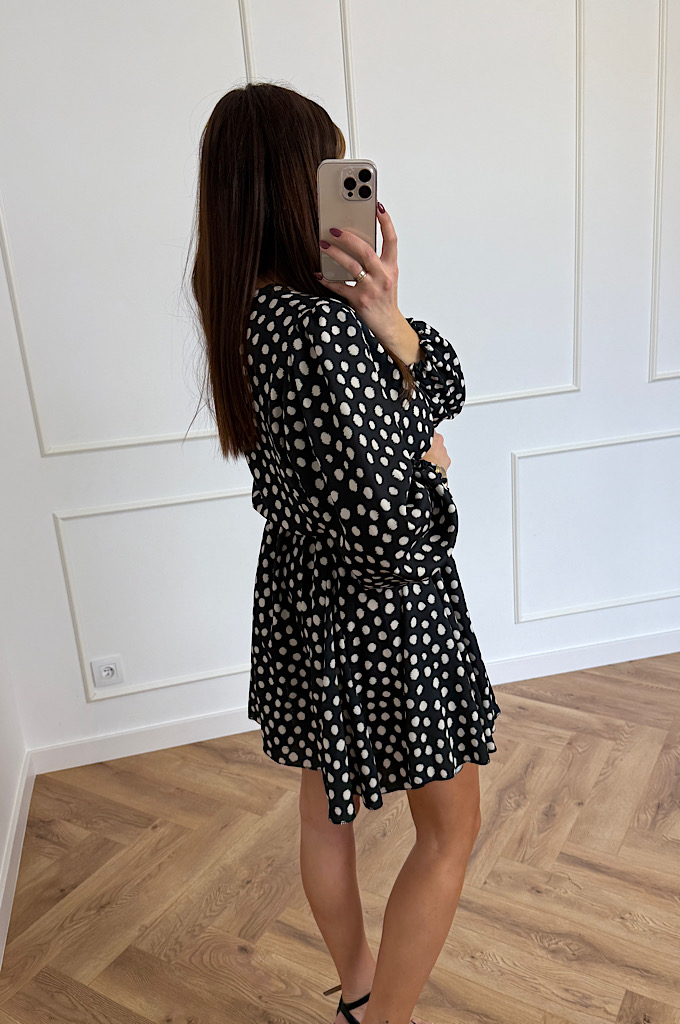 Sukienka w rozmiarze uniwersalnym. Świetnie się sprawdzi dla kobiet w ciąży. Będzie dobra na wiele rozmiarów od XS do XL. Biust w literę V. W pasie gumka, dodatkowo pasek do związania. Rękawek zakończony gumką.