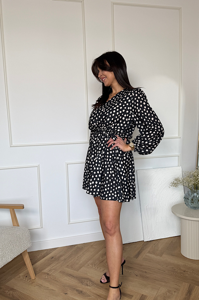 Sukienka w rozmiarze uniwersalnym. Świetnie się sprawdzi dla kobiet w ciąży. Będzie dobra na wiele rozmiarów od XS do XL. Biust w literę V. W pasie gumka, dodatkowo pasek do związania. Rękawek zakończony gumką.