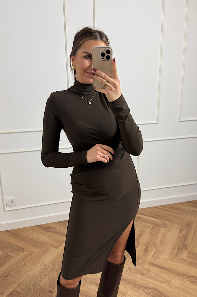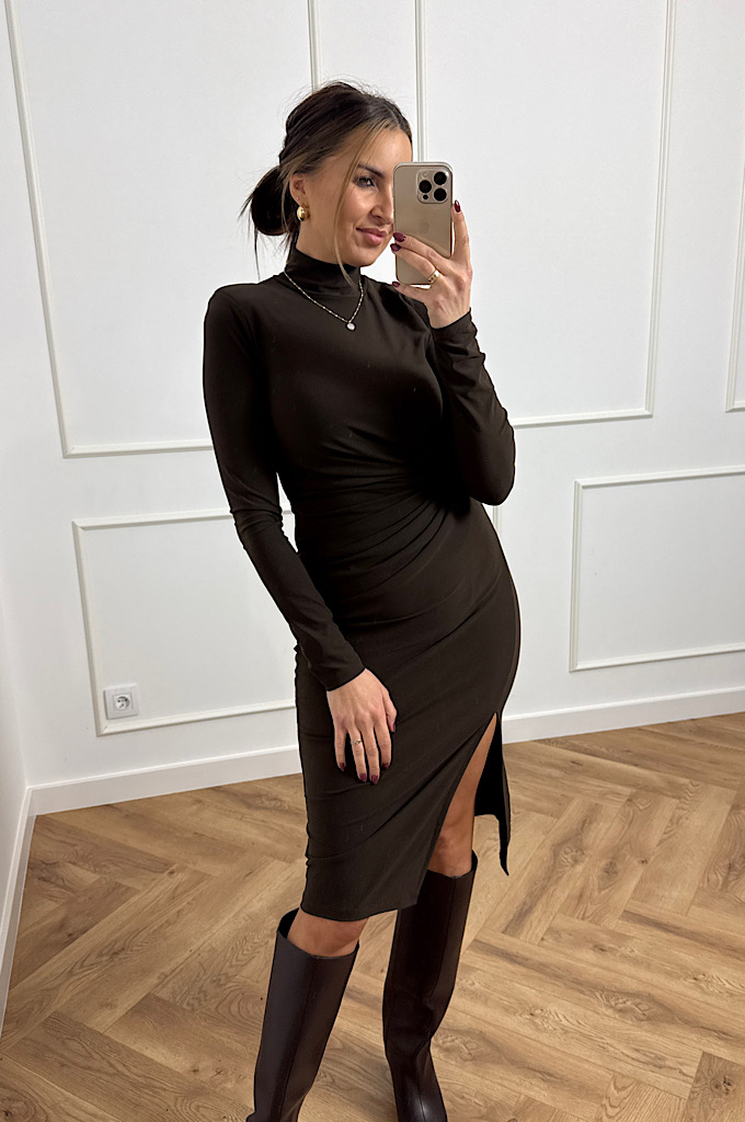 Elegancka, dopasowana sukienka midi w odcieniu głębokiej czekolady to połączenie klasy i kobiecości w najlepszym wydaniu.