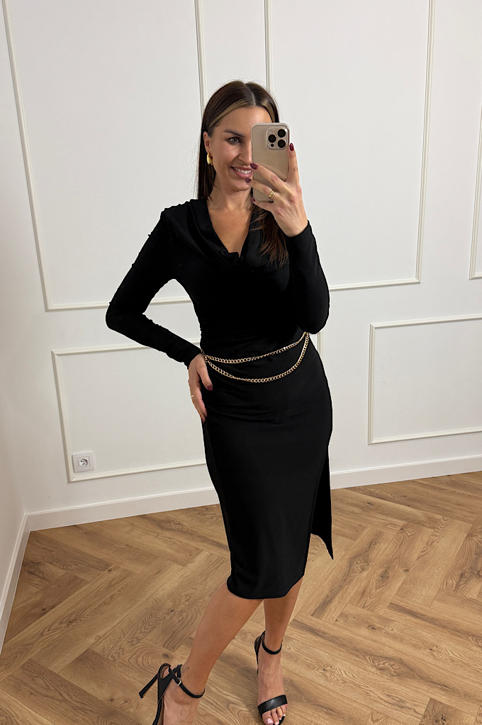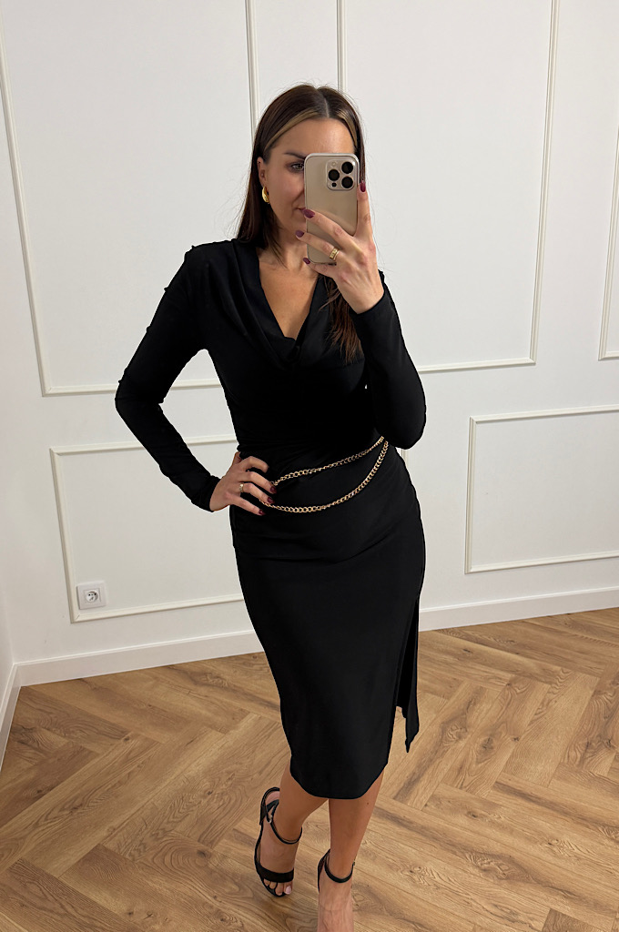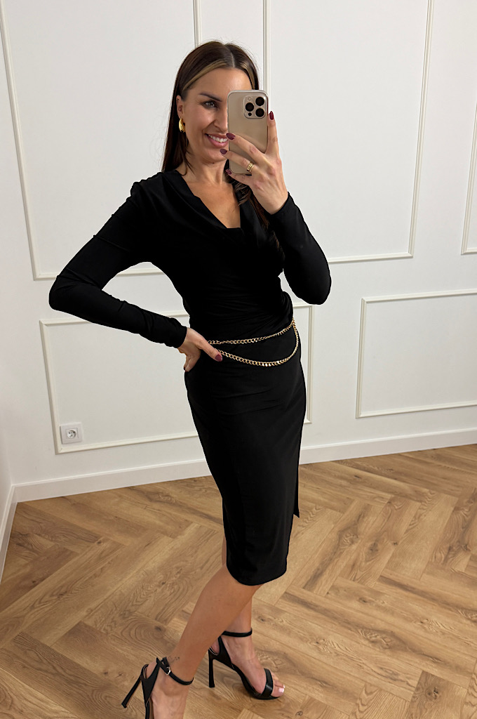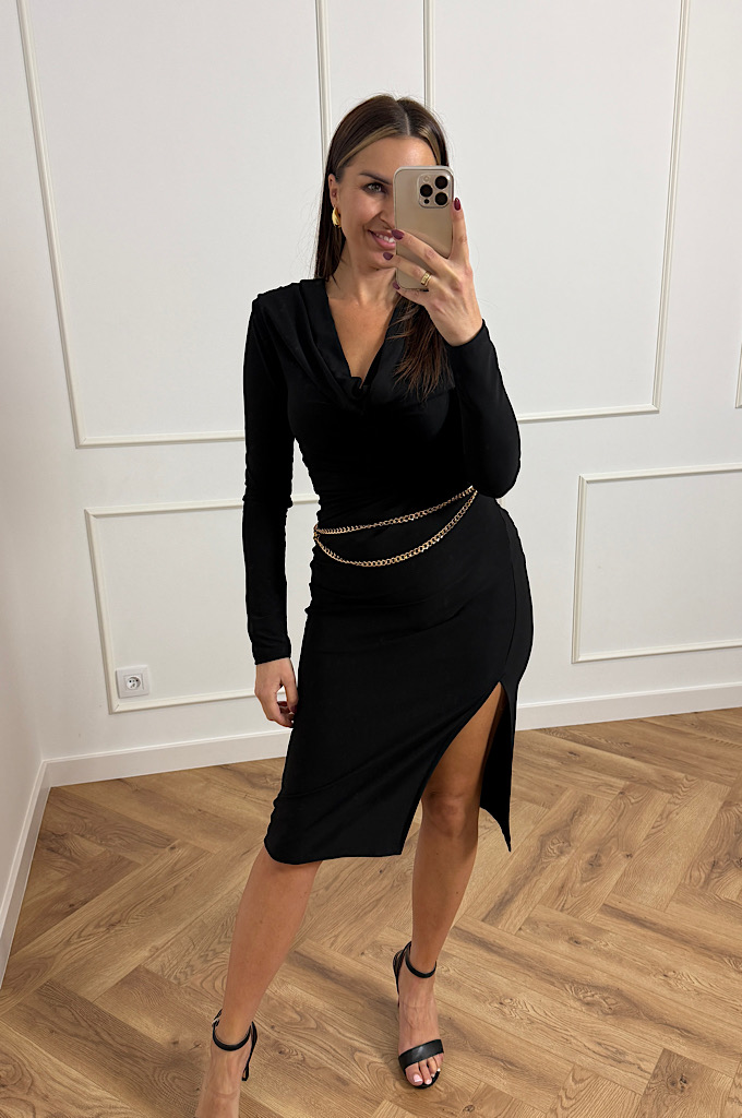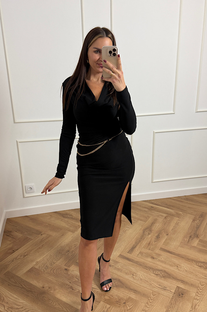 Elegancka i kobieca sukienka w głębokim odcieniu bordo to idealna propozycja na wyjątkowe okazje — wesele, kolację, randkę czy świąteczne przyjęcie. Model o dopasowanym kroju pięknie podkreśla sylwetkę, a delikatne drapowanie w okolicy dekoltu dodaje jej subtelnego, zmysłowego charakteru. Sukienka posiada: długie rękawy, kopertowy, miękko układający się dekolt, efektowne rozcięcie na nodze, długość za kolano. Uszyta z elastycznego, przyjemnego w dotyku materiału, który doskonale dopasowuje się do ciała i zapewnia komfort noszenia przez cały wieczór. Stylizuj ją z klasycznymi szpilkami i złotą biżuterią, aby stworzyć elegancki, wieczorowy look.