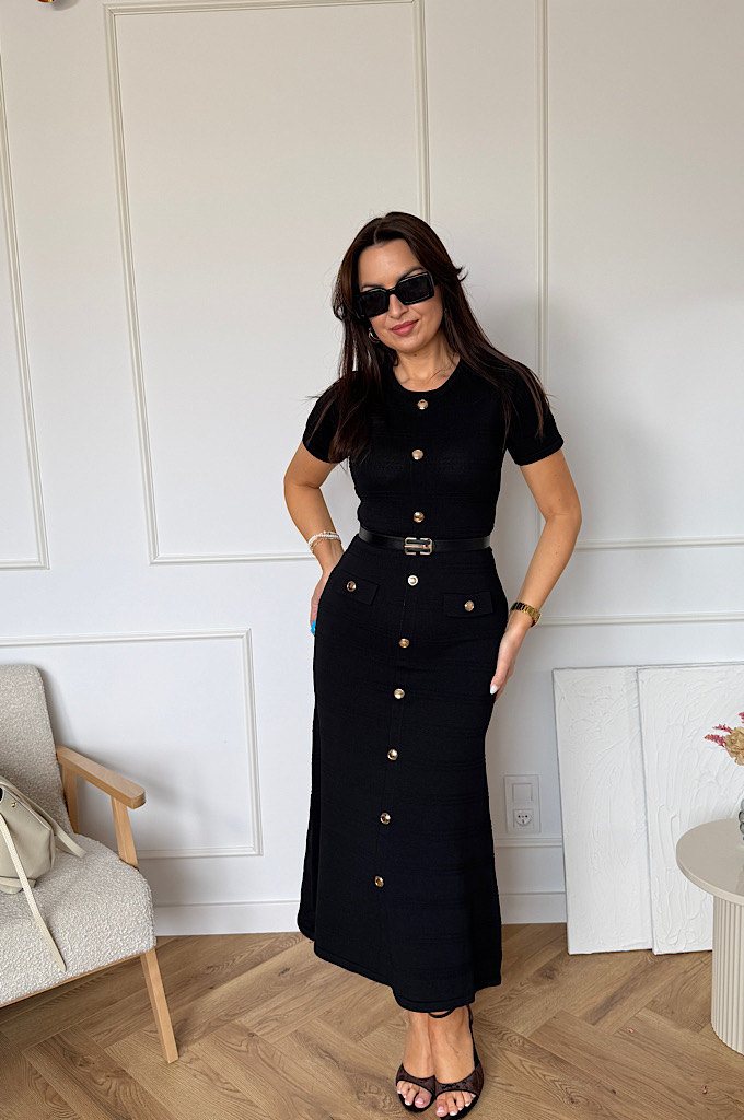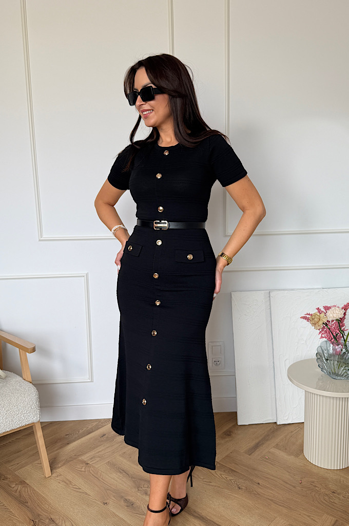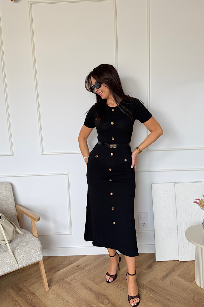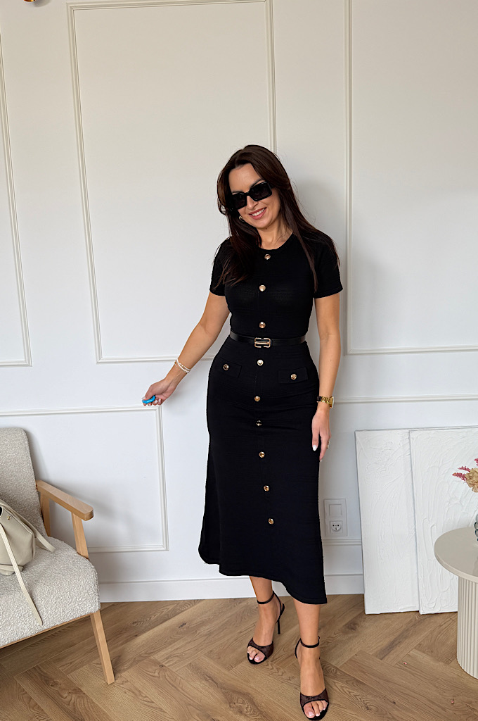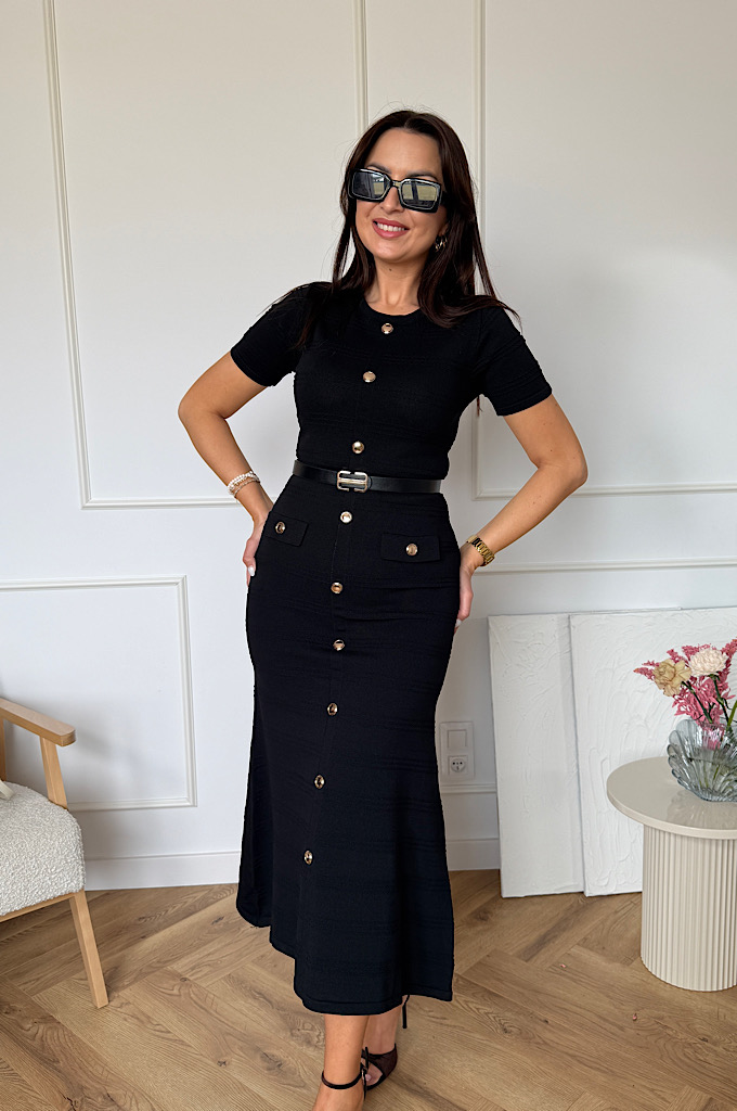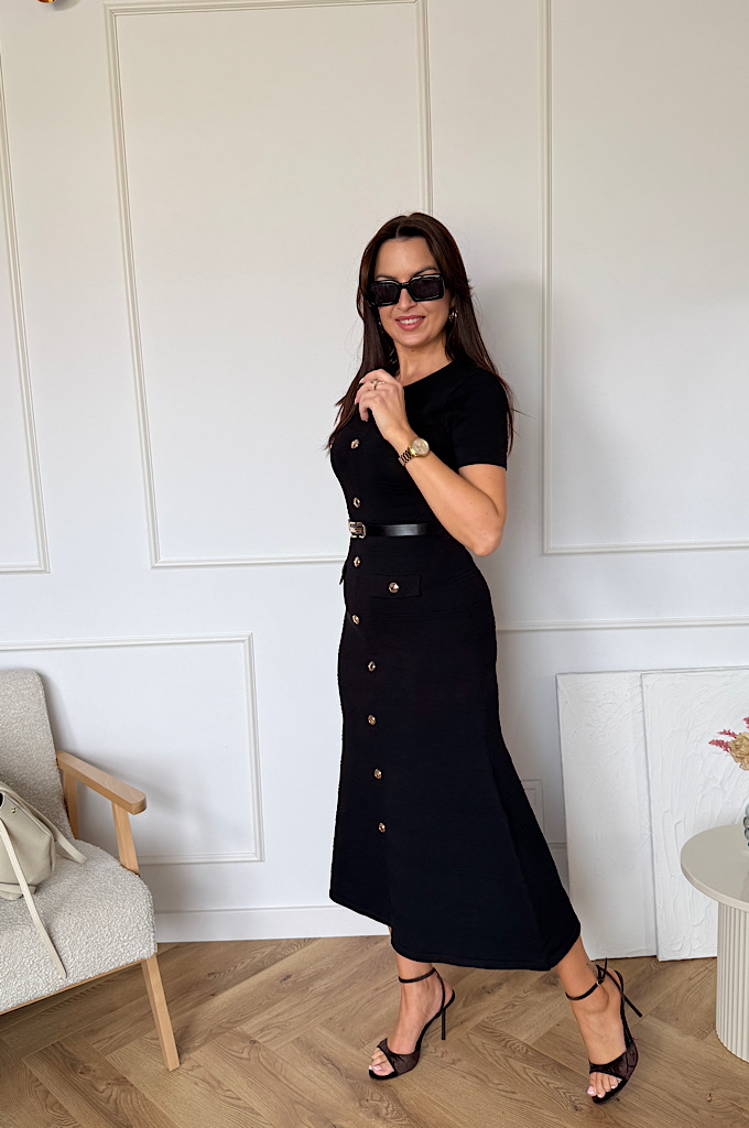 Stylowa i ponadczasowa sukienka o długości midi, która pięknie podkreśla sylwetkę i dodaje klasy każdej stylizacji. Dopasowana góra oraz delikatnie rozkloszowany dół tworzą kobiecy i bardzo elegancki efekt. Ozdobne guziki na całej długości oraz pasek w talii podkreślają figurę i nadają całości wyjątkowego charakteru.