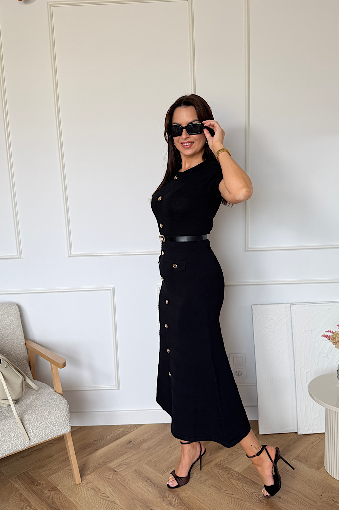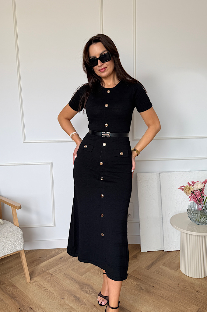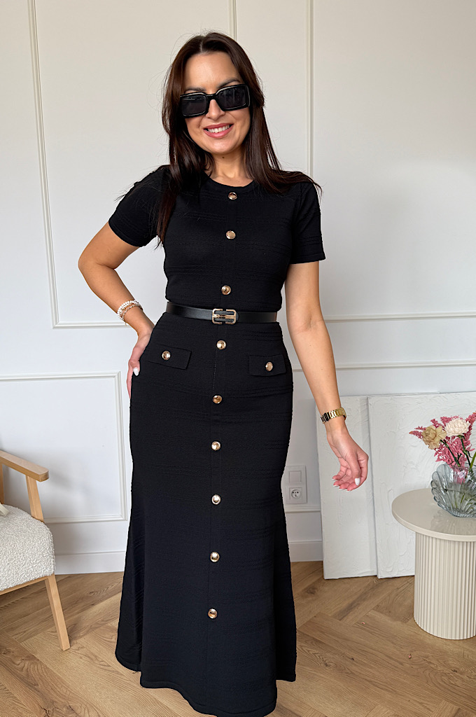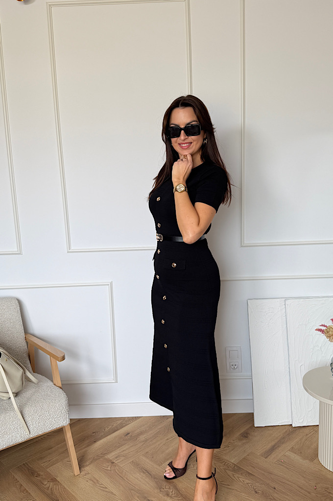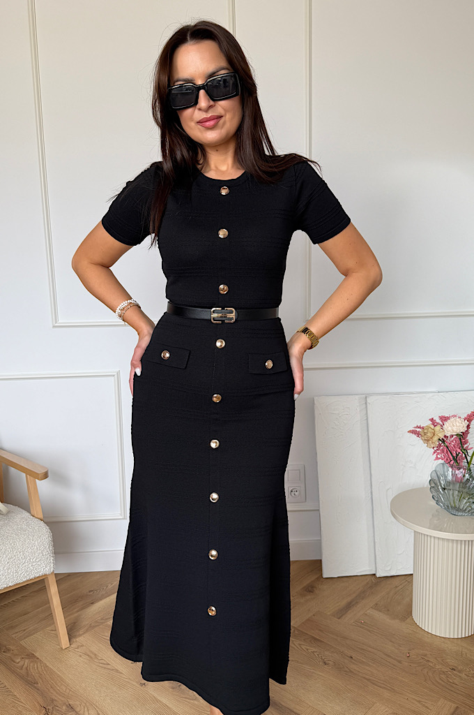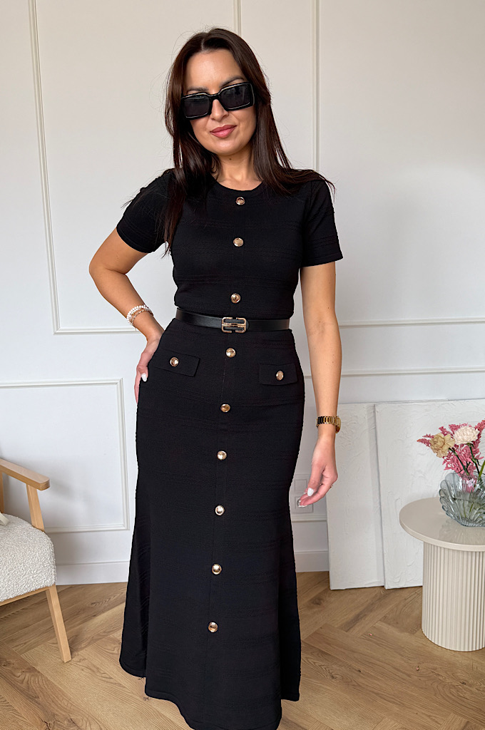 Stylowa i ponadczasowa sukienka o długości midi, która pięknie podkreśla sylwetkę i dodaje klasy każdej stylizacji. Dopasowana góra oraz delikatnie rozkloszowany dół tworzą kobiecy i bardzo elegancki efekt. Ozdobne guziki na całej długości oraz pasek w talii podkreślają figurę i nadają całości wyjątkowego charakteru.