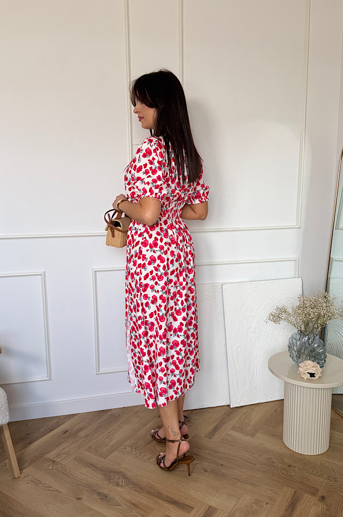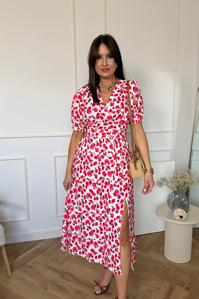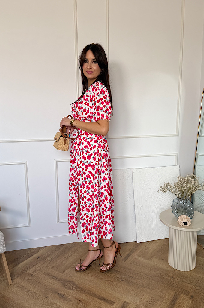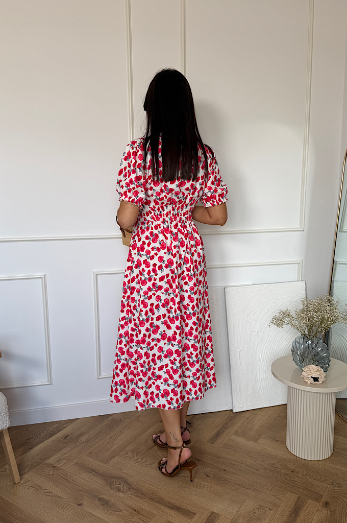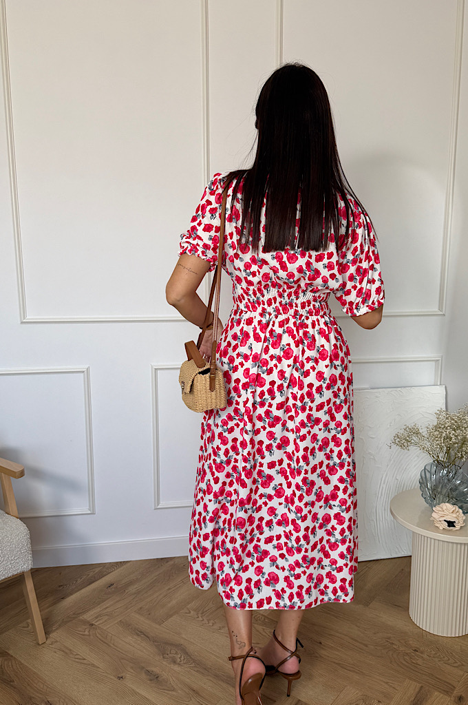 Sukienka midi Rozalia biała w czerwone kwiaty