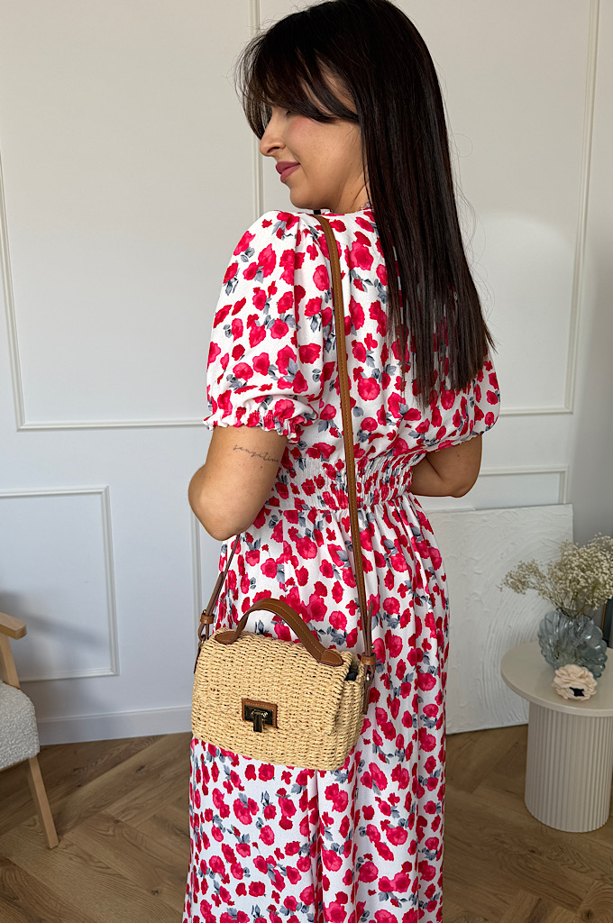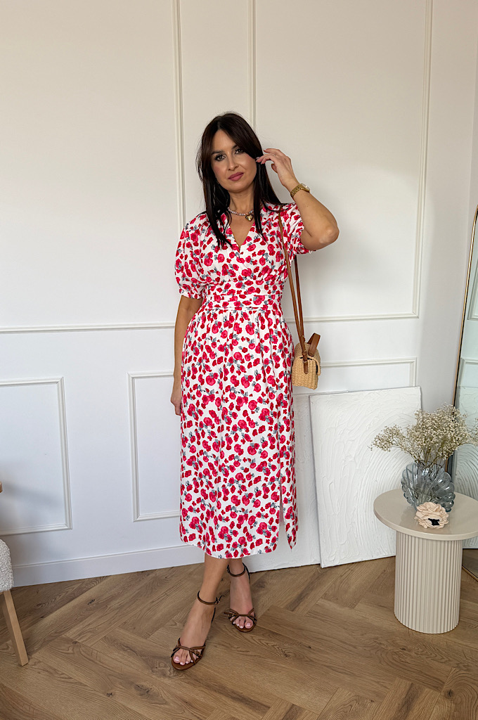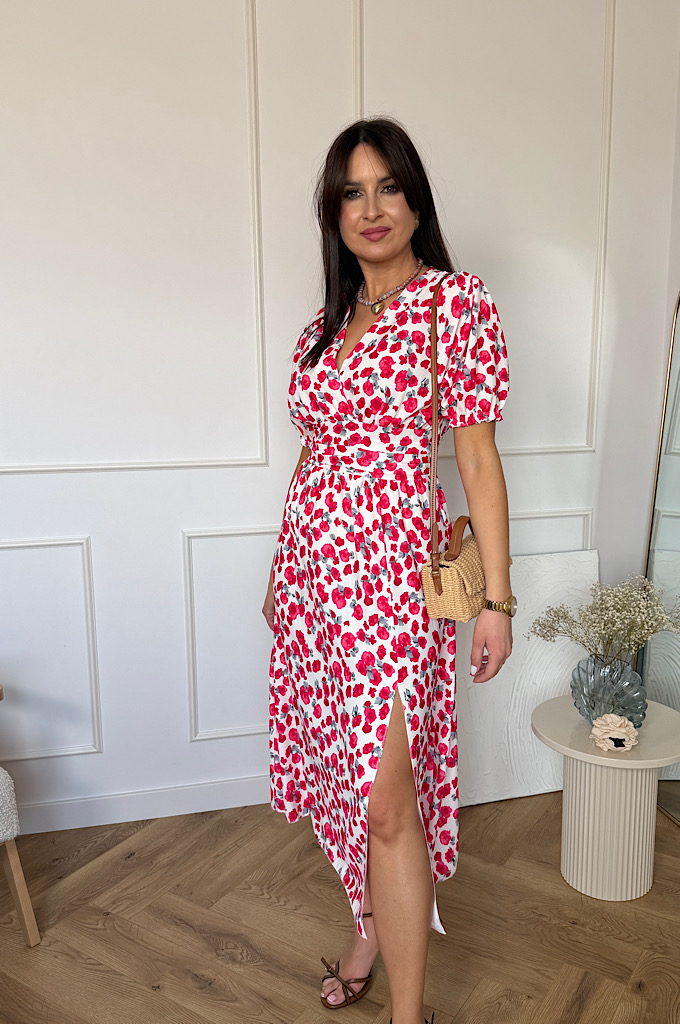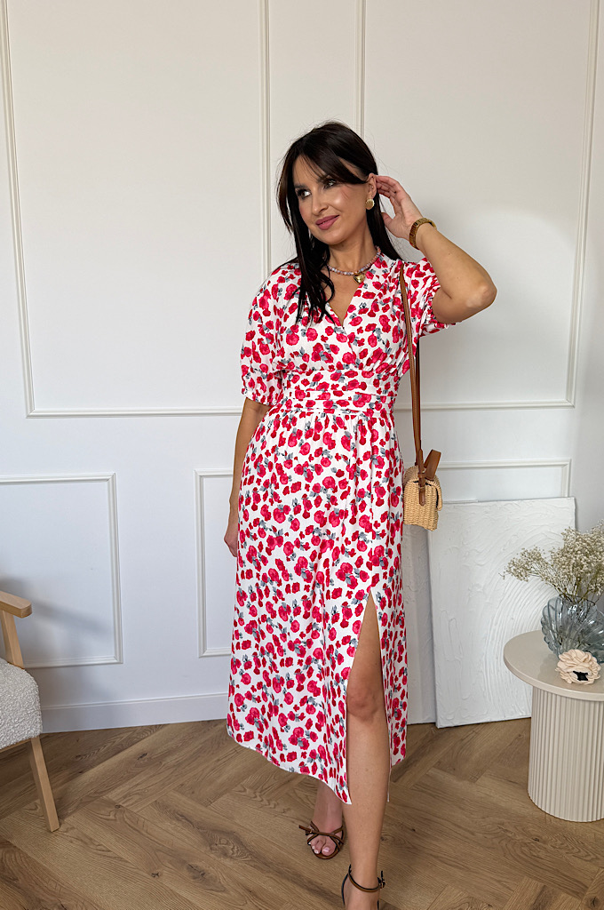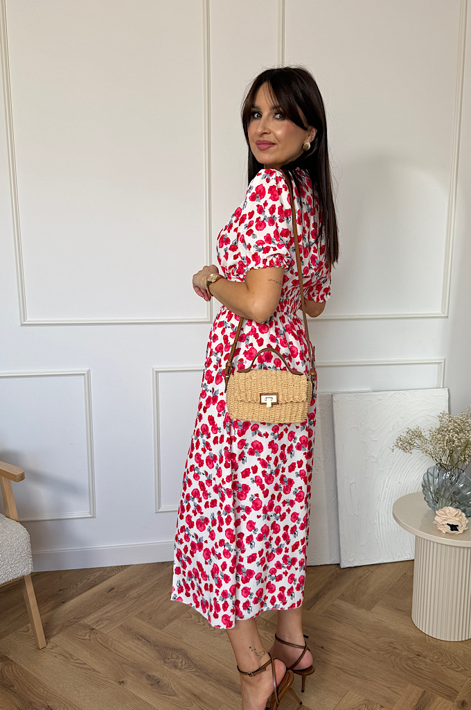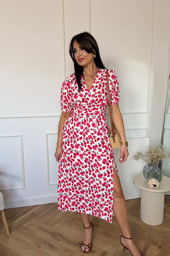 Sukienka midi Rozalia biała w czerwone kwiaty
