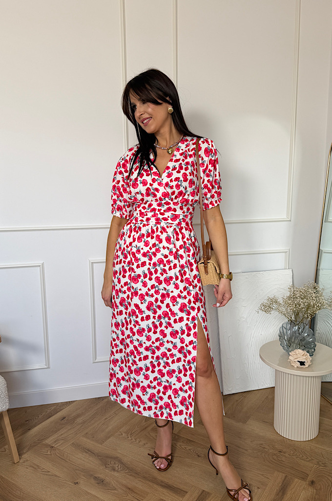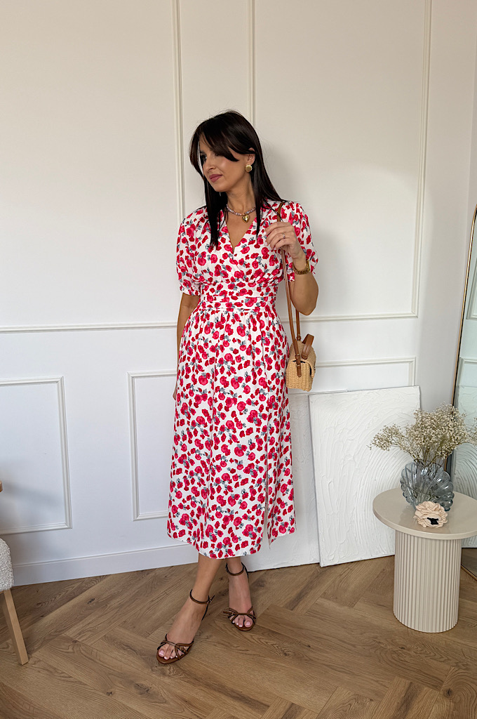 Biała sukienka w czerwone kwiaty to doskonały wybór jako sukienka na wesele, sukienka na przyjęcie, sukienka na randkę czy elegancka sukienka na lato. Świetnie komponuje się z sandałkami na obcasie lub lekkimi letnimi dodatkami.