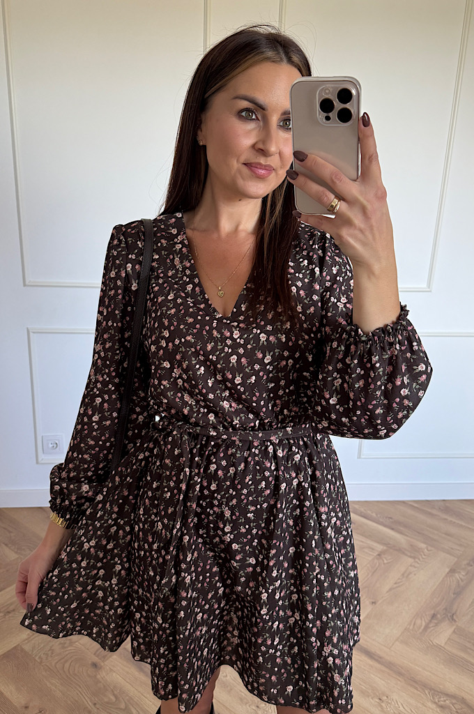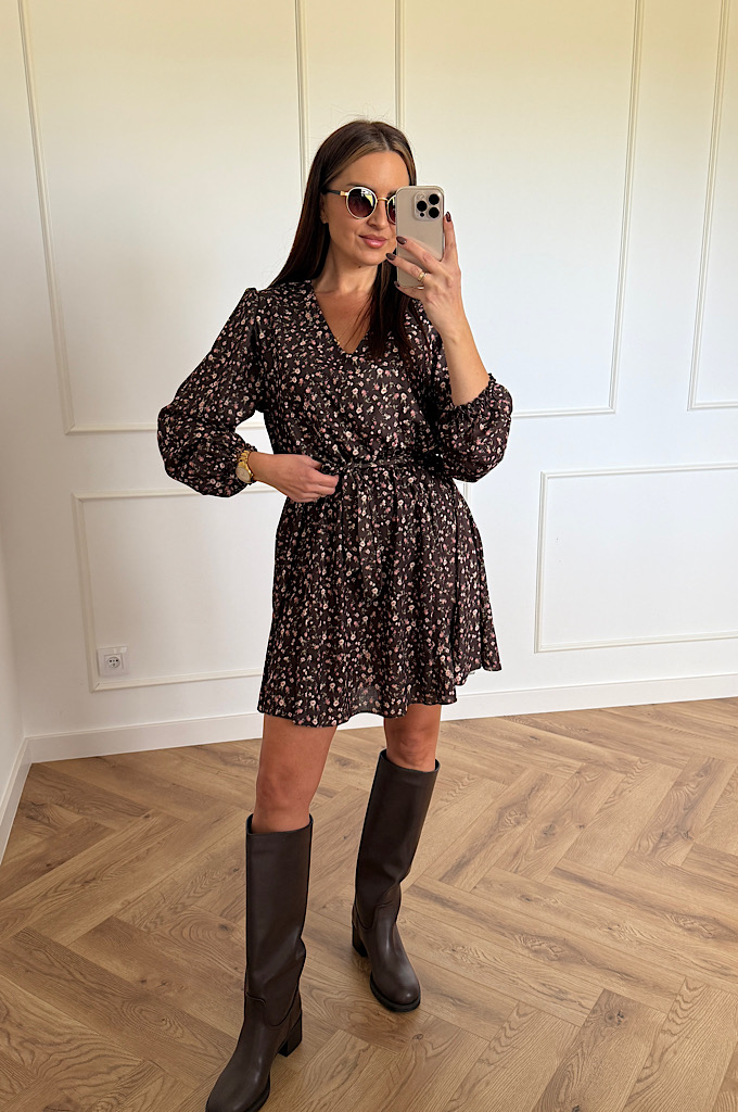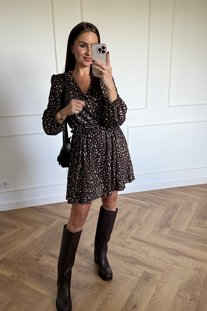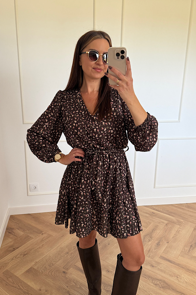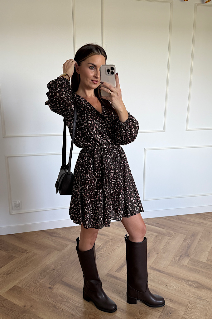 Sukienka mini Karina brązowa w drobne kwiatuszki
