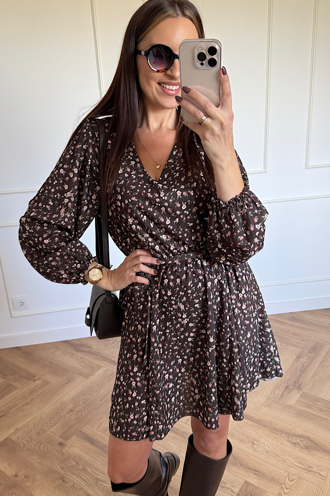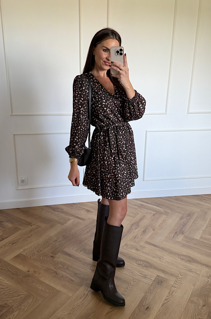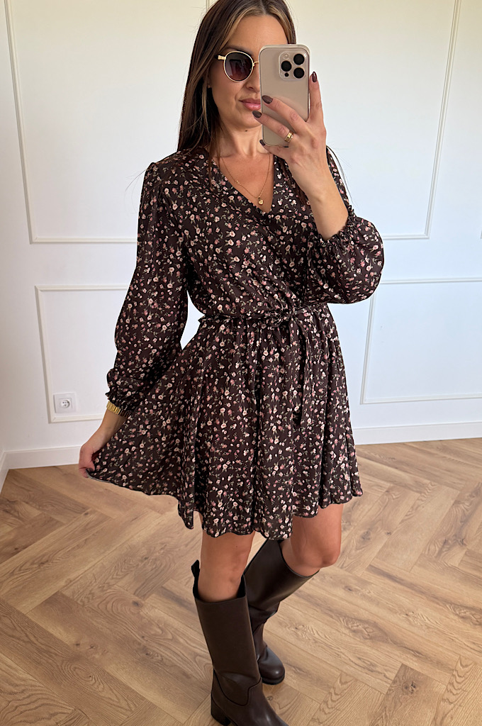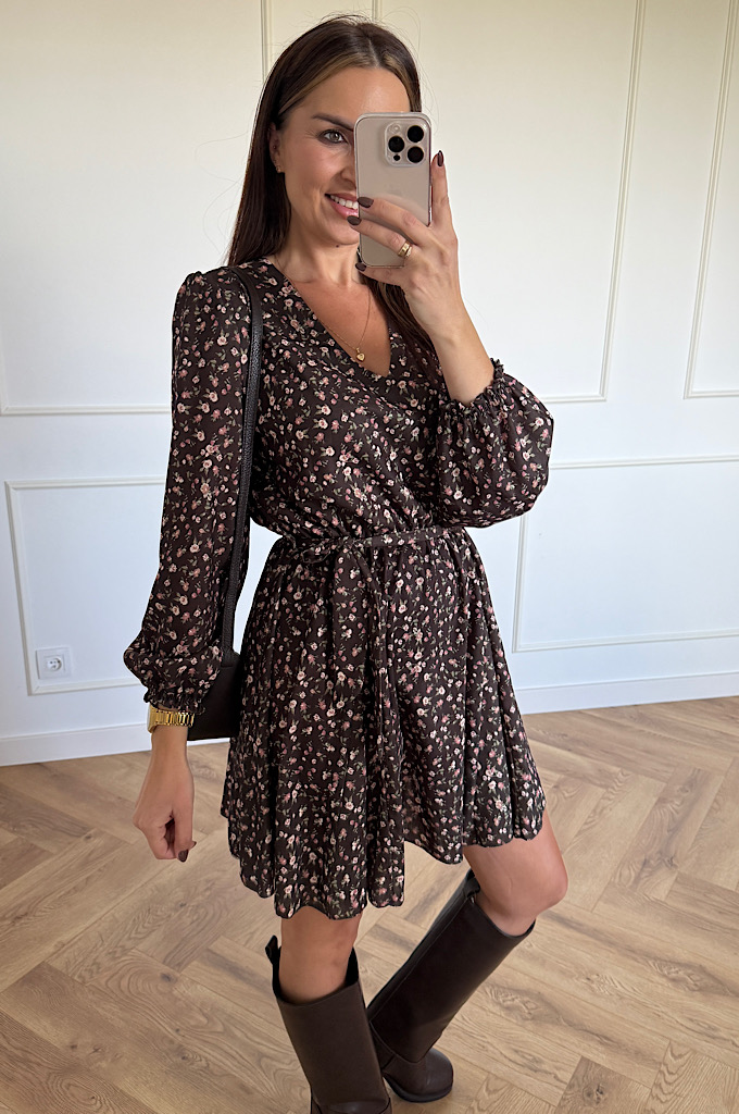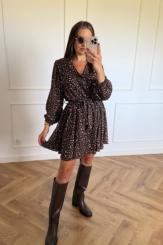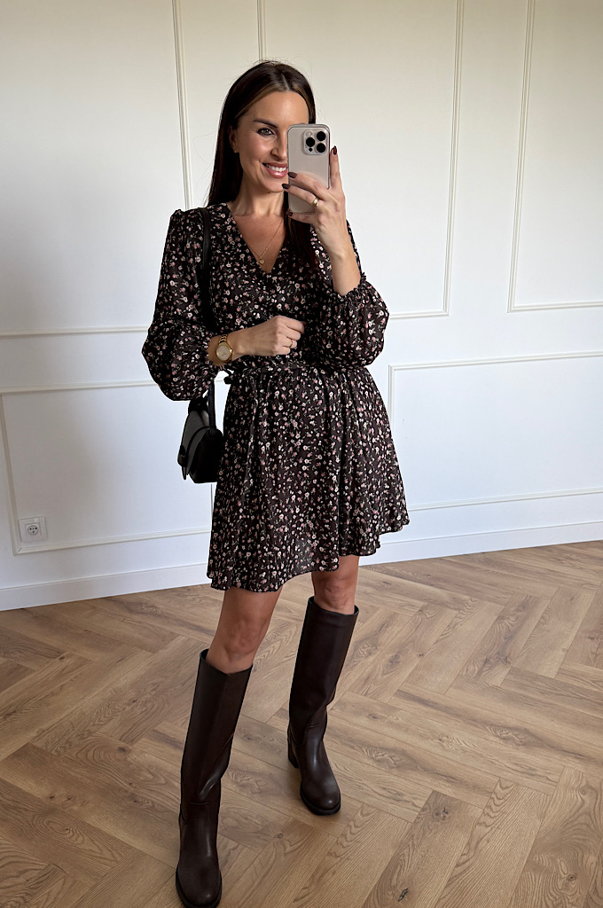 Sukienka mini Karina brązowa w drobne kwiatuszki