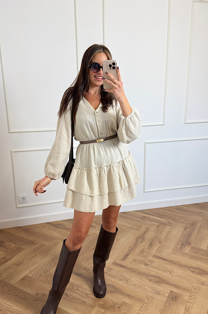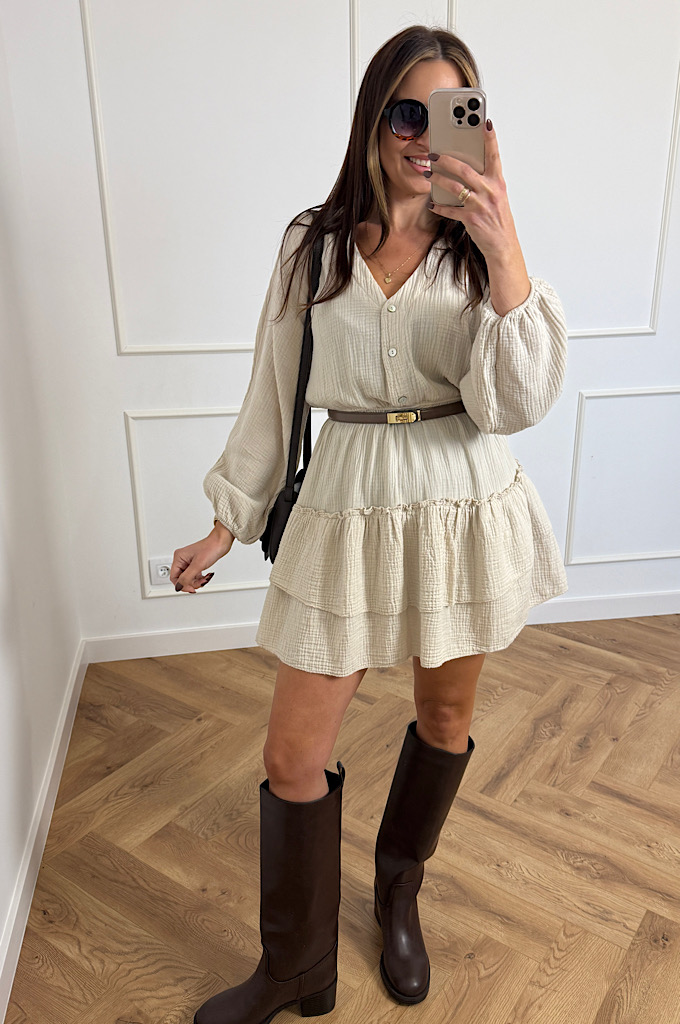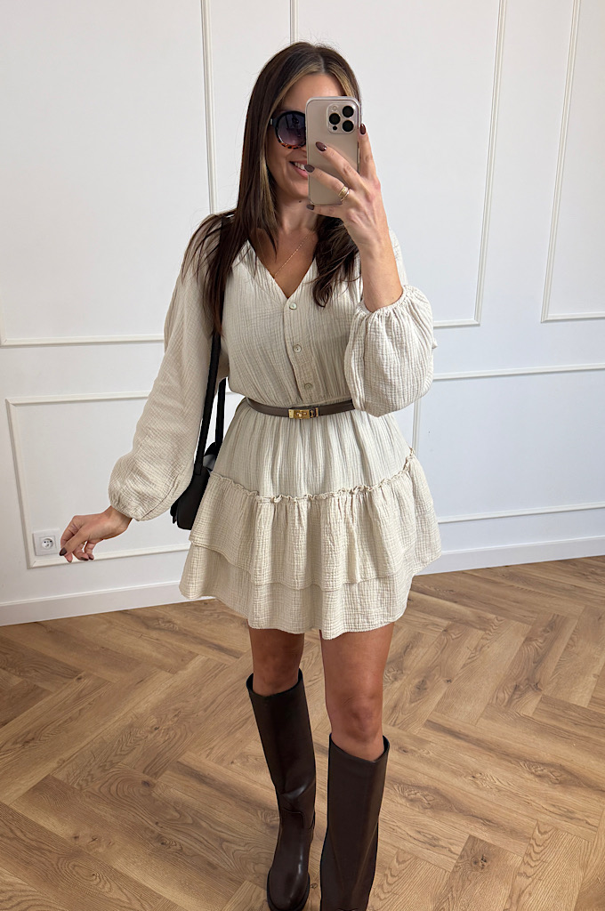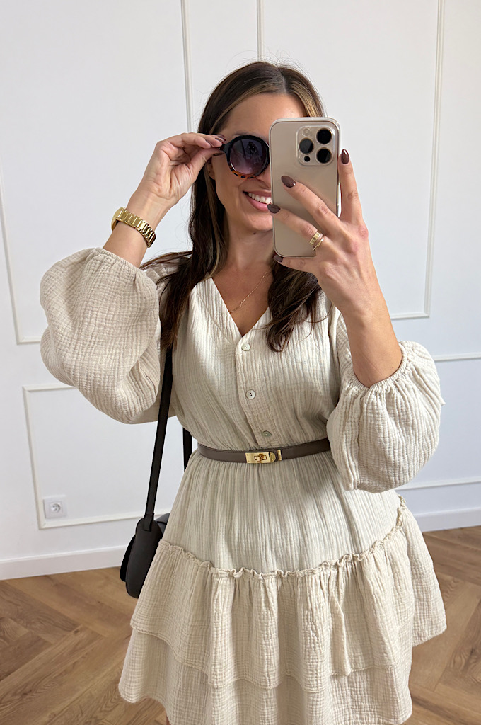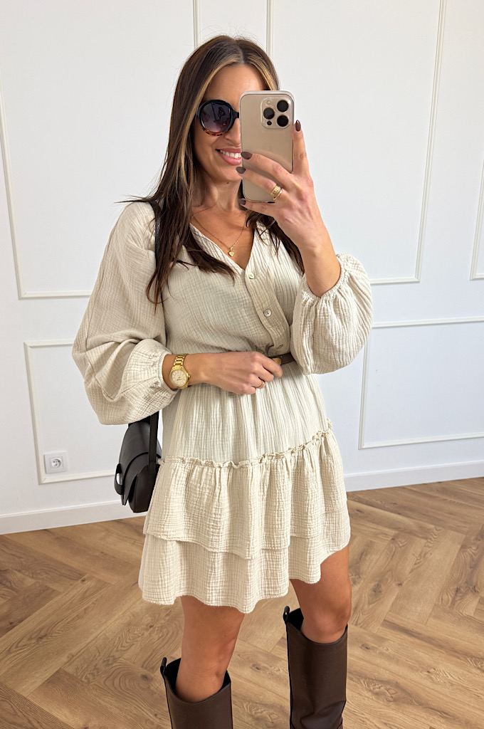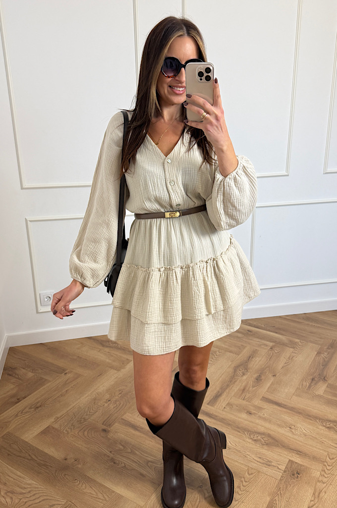 Sukienka muślinowa w rozmiarze uniwersalnym. Sukienka posiada odpinane guziczki na dekolcie oraz w pasie gumkę. Dół sukienki lekko rozkloszowany z falnbaną. Rękawy mają krój  nietoperza.