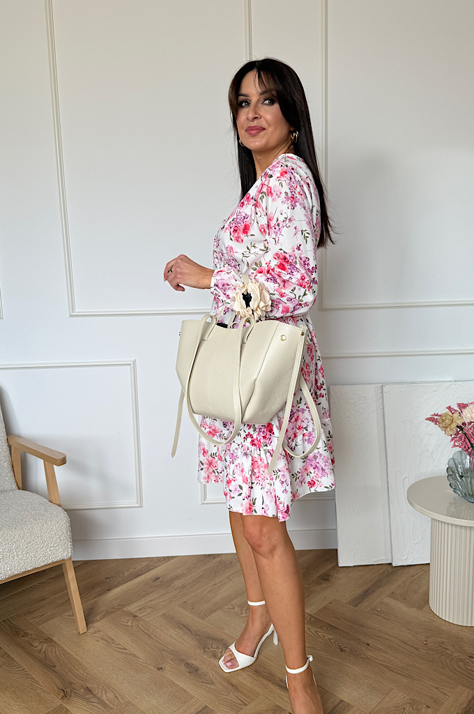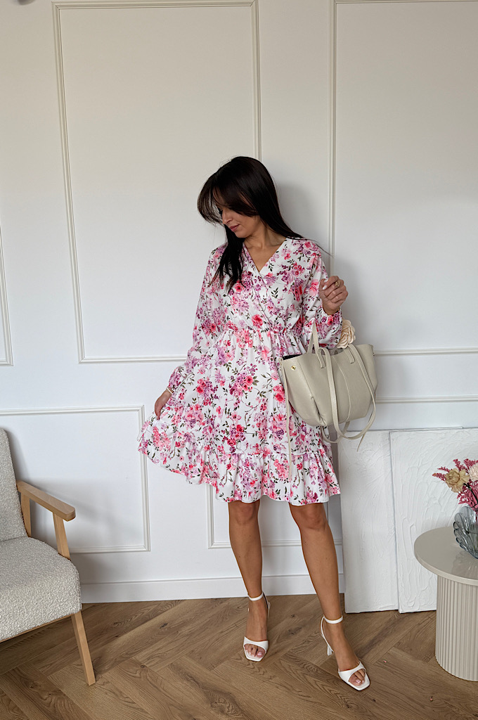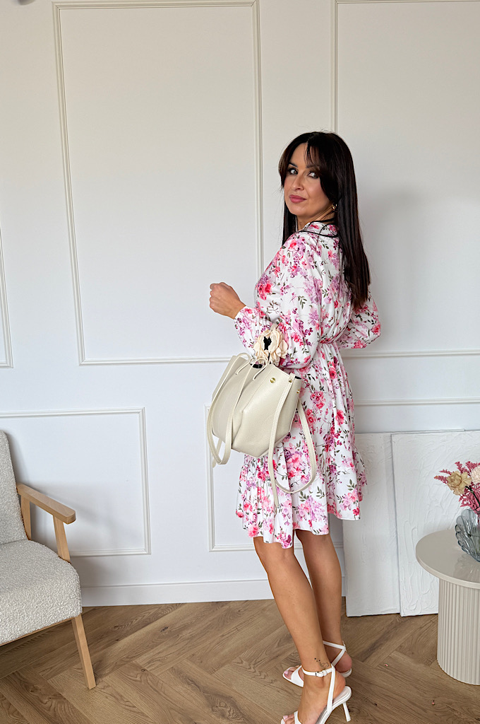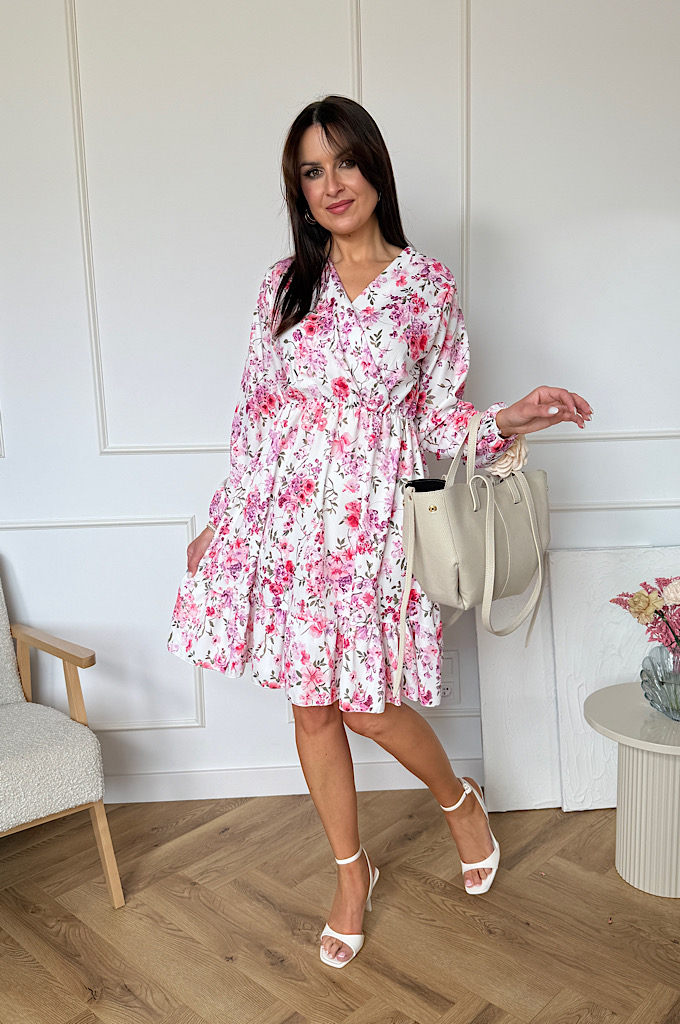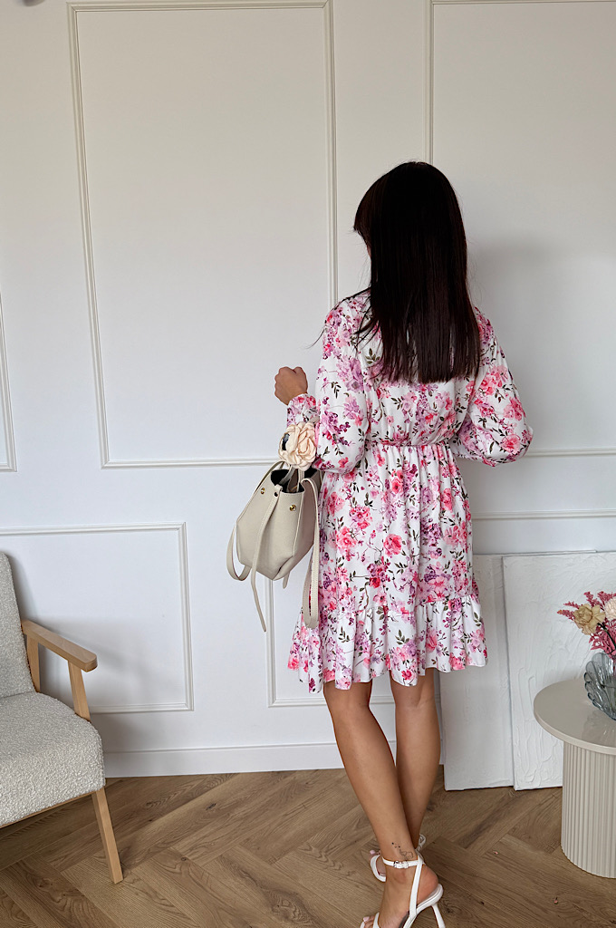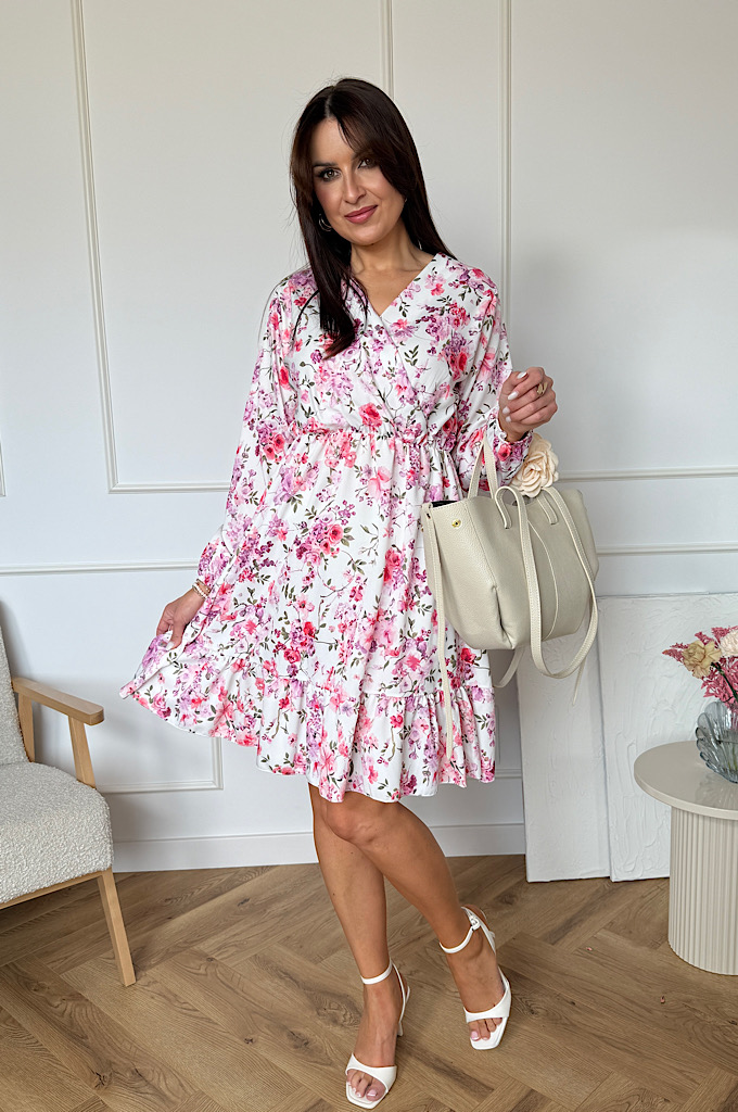 Sukienka Sara z falbaną biała w kwiaty