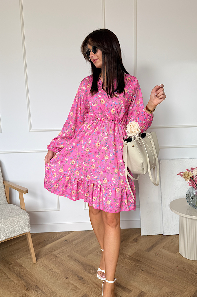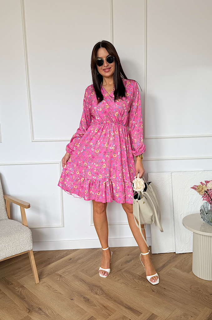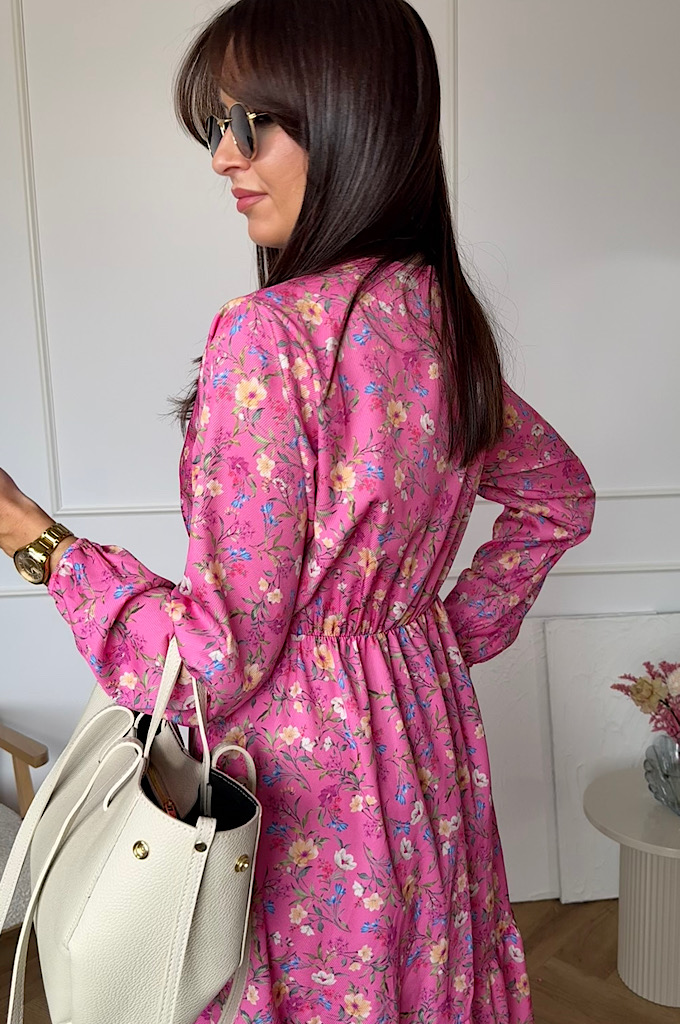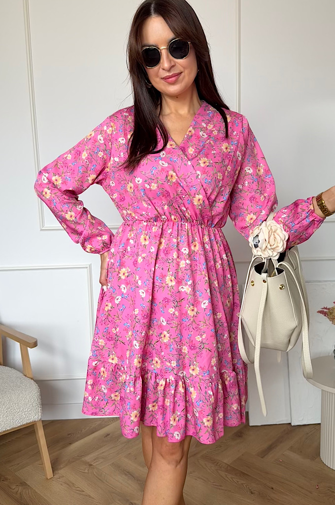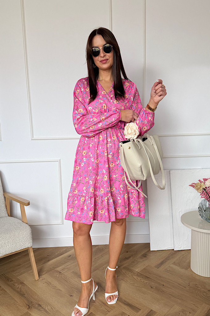 Sukienka Sara z falbaną różowa w kwiaty