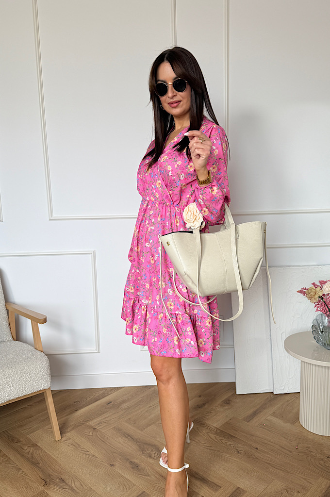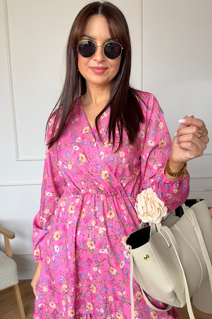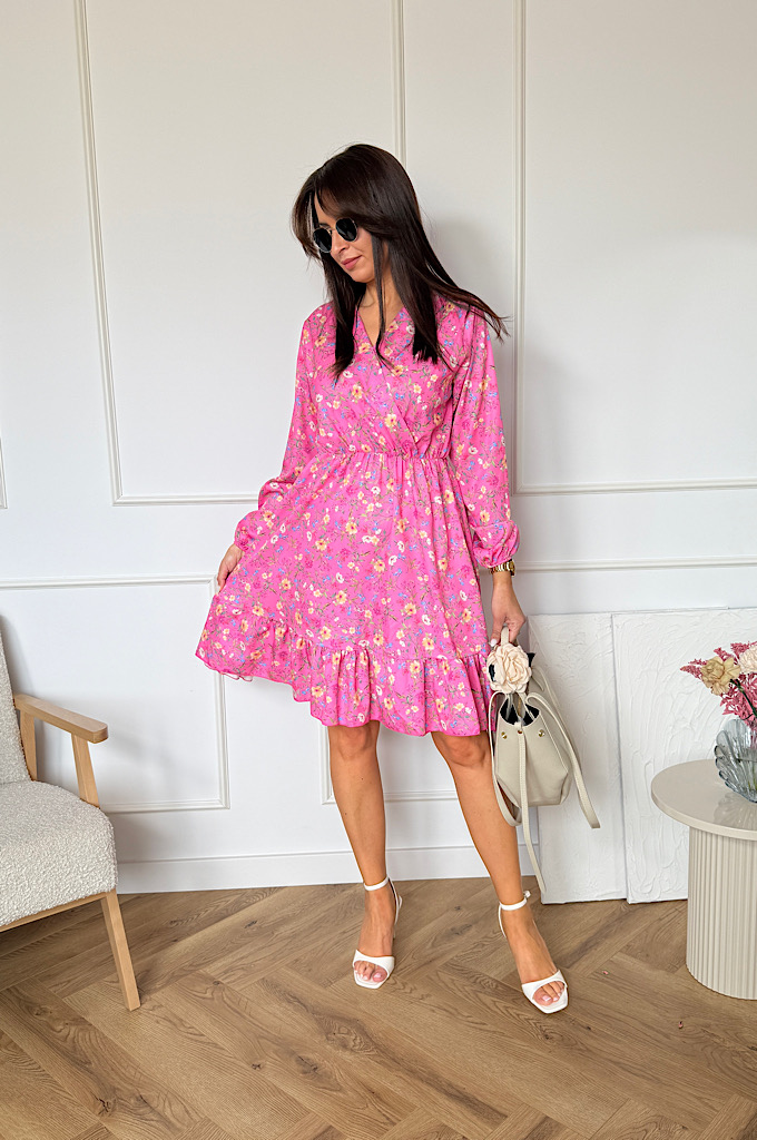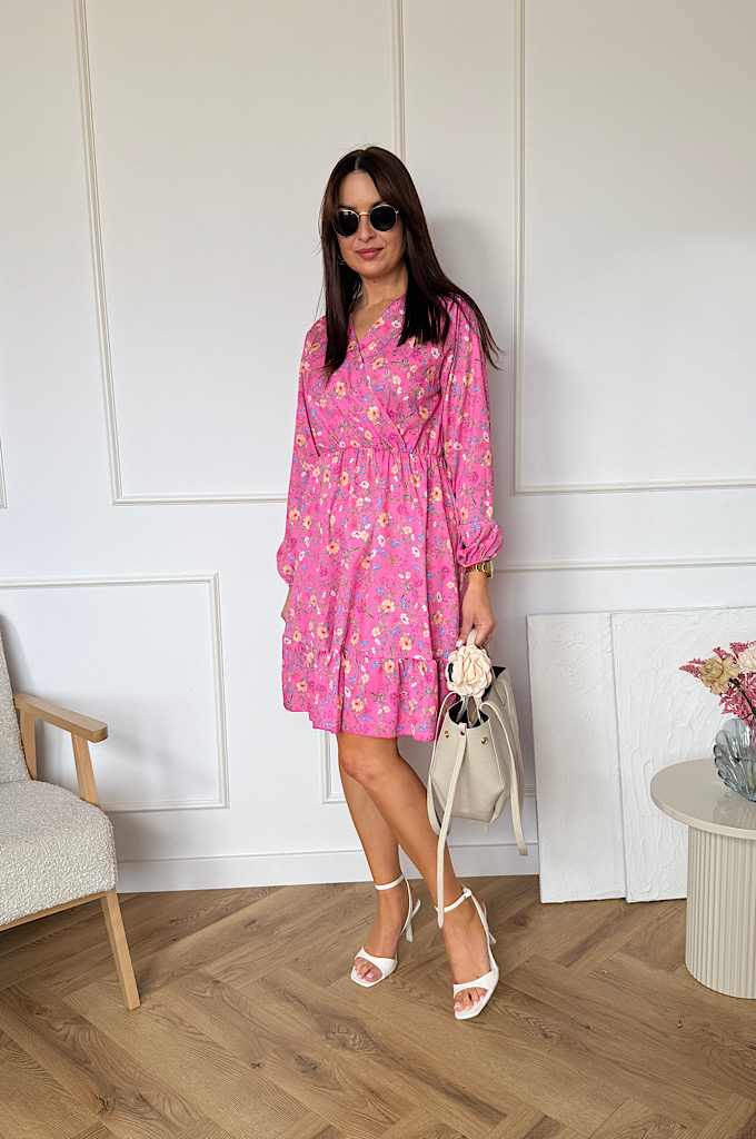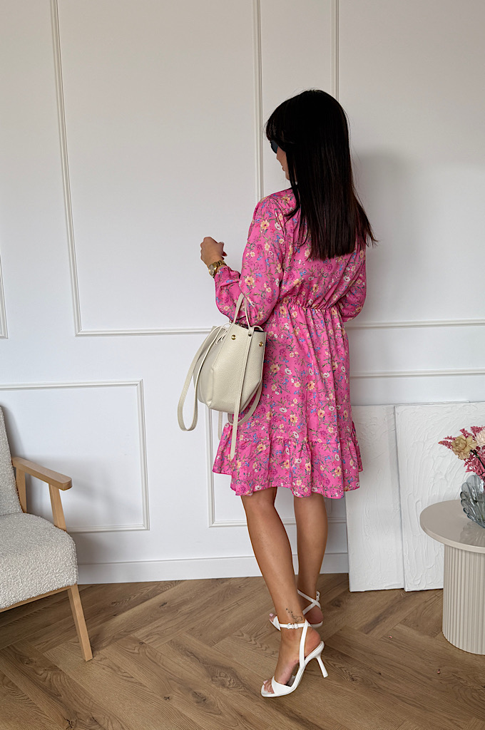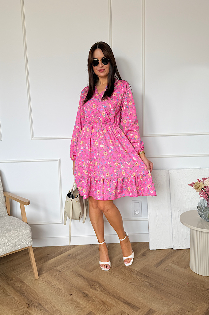 Sukienka Sara z falbaną różowa w kwiaty