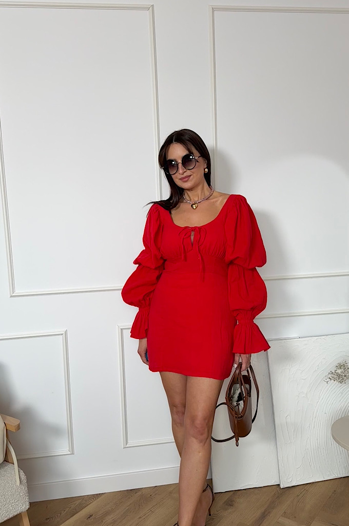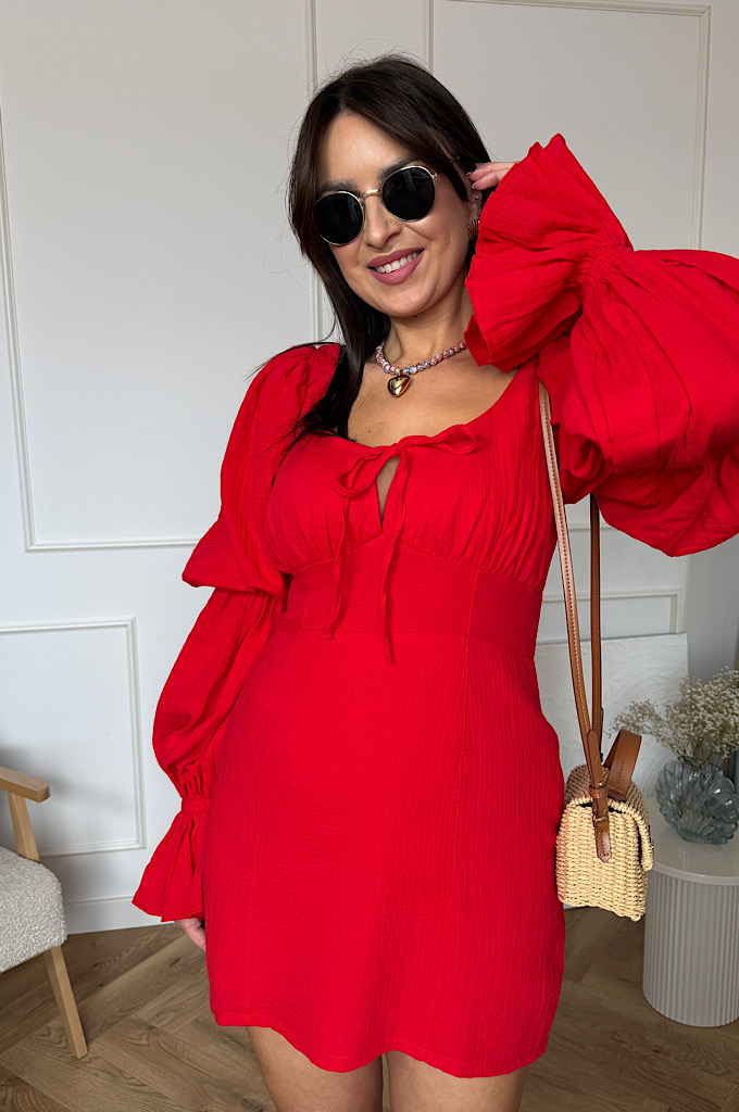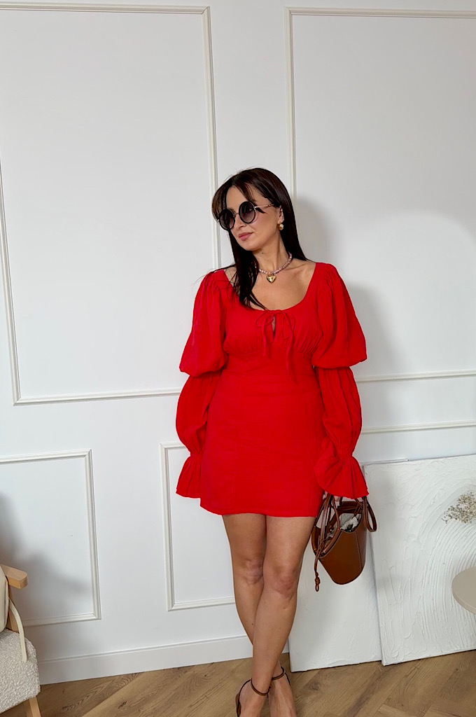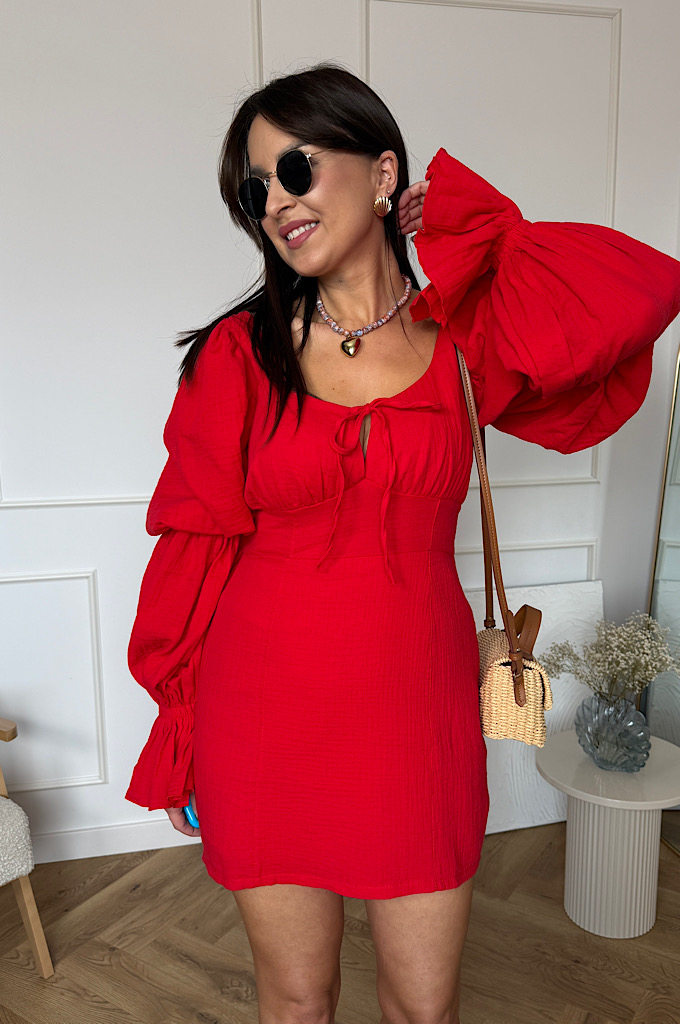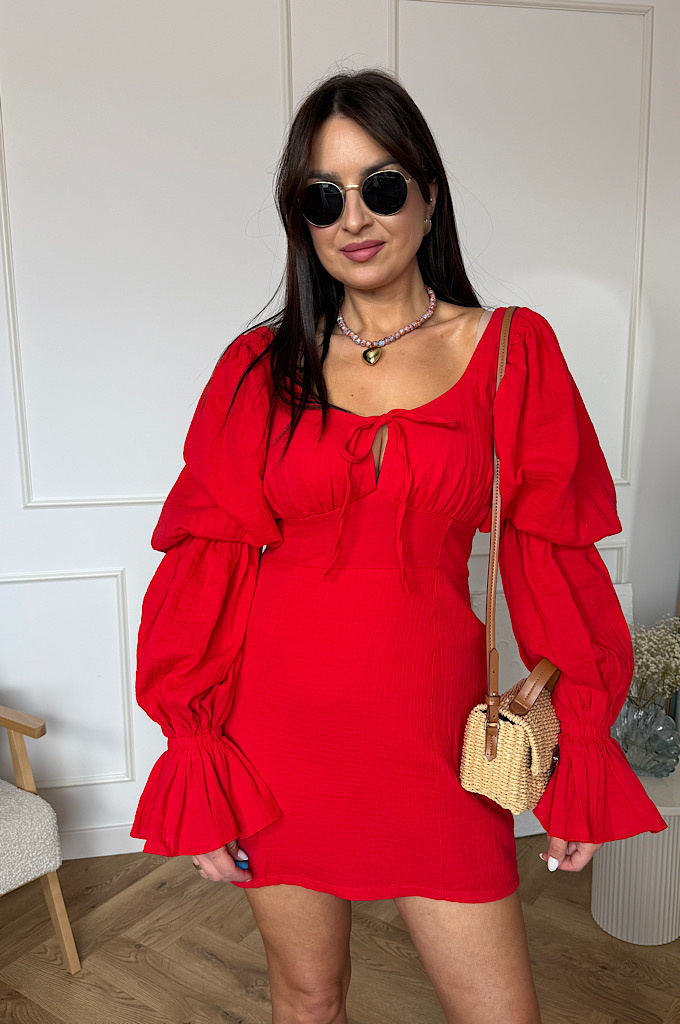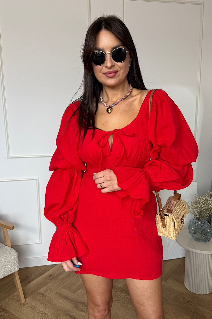 Wyjątkowo kobieca sukienka mini z bawełny muślinowej w intensywnym czerwonym kolorze, która przyciąga spojrzenia i pięknie podkreśla sylwetkę. Model posiada efektowne, bufiaste rękawy zakończone delikatną falbaną oraz subtelne wiązanie przy dekolcie, które dodaje całości romantycznego charakteru. Marszczenie w talii świetnie modeluje figurę i zapewnia komfort noszenia. Zapinana na zamek błyskawiczny.