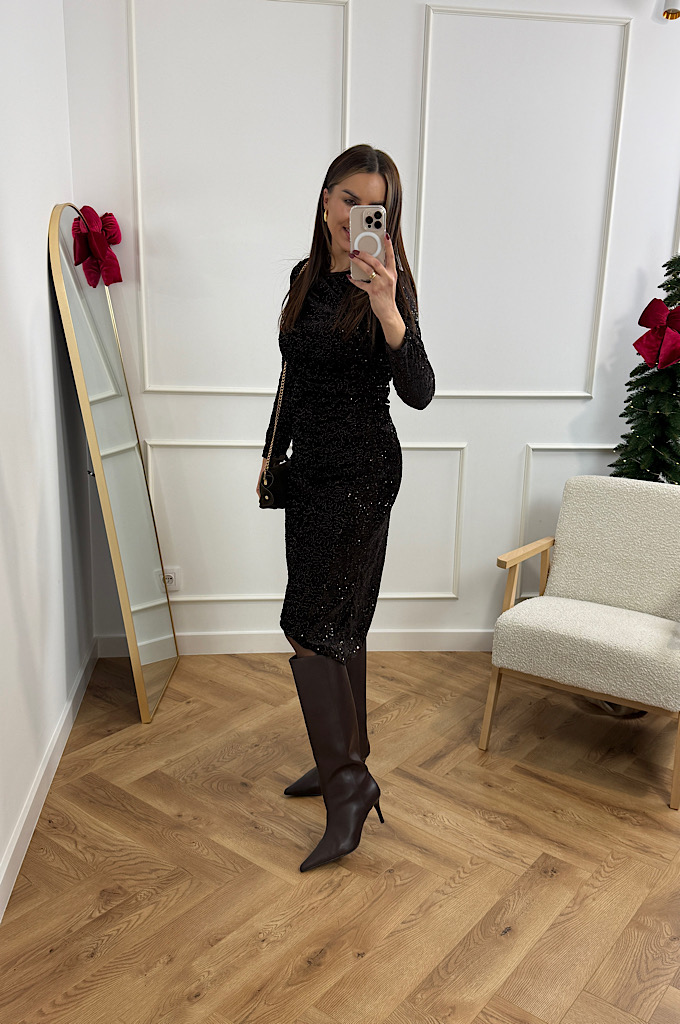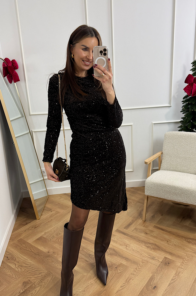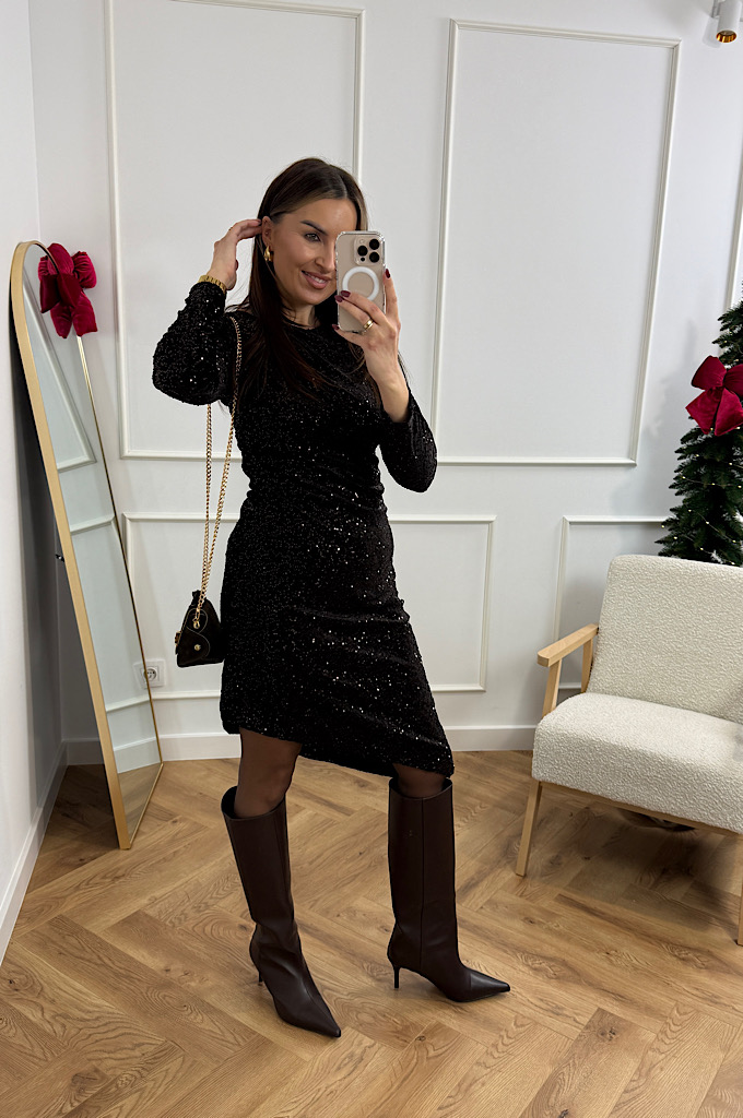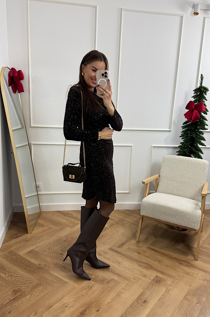 Ta czarna sukienka cekinowa to esencja wieczorowej elegancji połączonej z nowoczesnym szykiem. W całości pokryta drobnymi, połyskującymi cekinami pięknie odbija światło przy każdym ruchu, tworząc efekt luksusowej, ale wciąż bardzo kobiecej stylizacji. Model ma dopasowany krój, który podkreśla sylwetkę, a delikatne marszczenie przy dekolcie nadaje mu subtelnej finezji. Asymetryczny dół dodaje charakteru i sprawia, że sukienka prezentuje się niezwykle efektownie zarówno z klasycznymi szpilkami, jak i eleganckimi kozakami. To idealna propozycja na święta, sylwestra, studniówkę czy każde wieczorne wyjście, kiedy chcesz wyglądać olśniewająco.