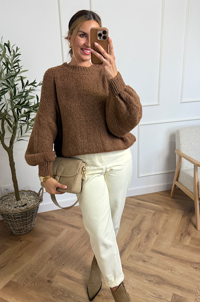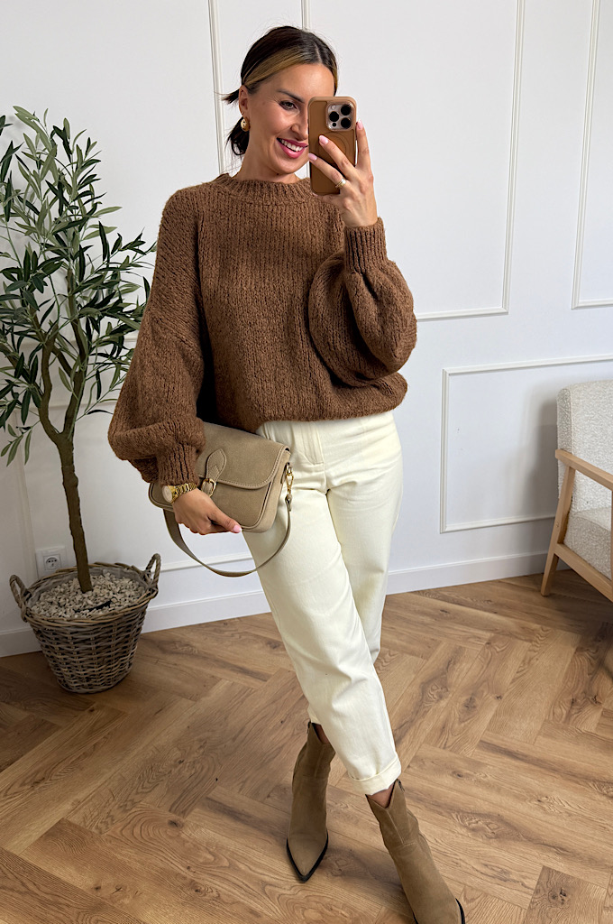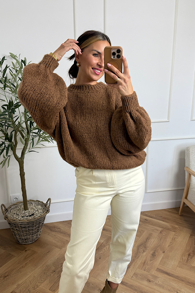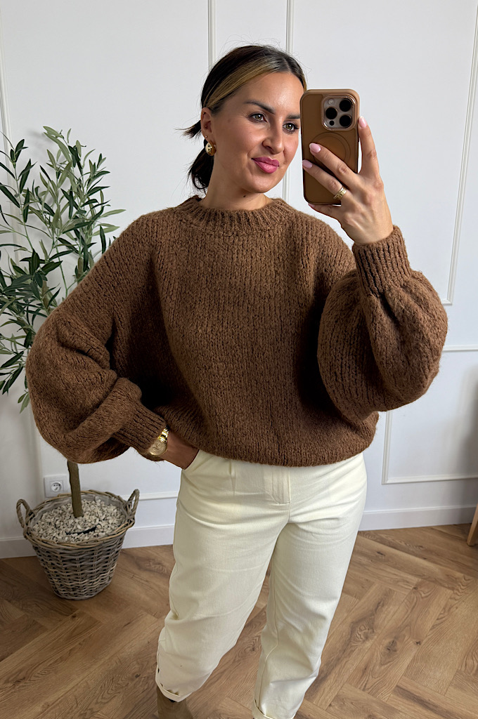 Wykonany z miękkiej, przyjemnej tkaniny, zapewnia komfort noszenia, a  bufiaste rękawy dodają charakteru  każdej stylizacji. Luźny krój, rękaw szeroki, z wełną i moherem to doskonały wybór na chłodniejsze dni, łącząc ciepło, miękkość i elegancję. Moher, pozyskiwany z sierści angorskich kóz, dodaje lekkości, połysku i wyjątkowej delikatności, podczas gdy wełna zapewnia izolację termiczną, co sprawia, że taki sweter jest zarówno ciepły, jak i przyjemny w dotyku.Swetry z tej mieszanki charakteryzują się nie tylko komfortem, ale również trwałością.