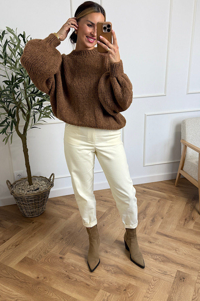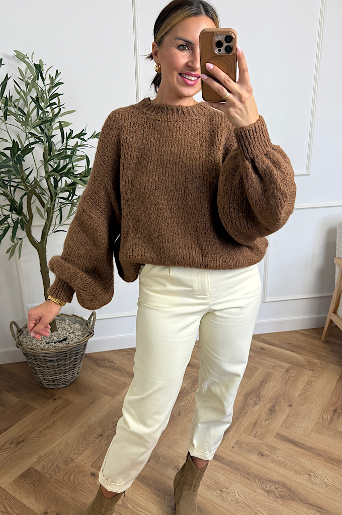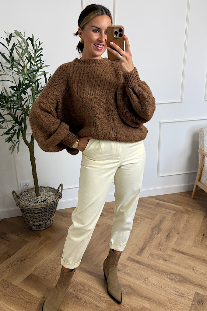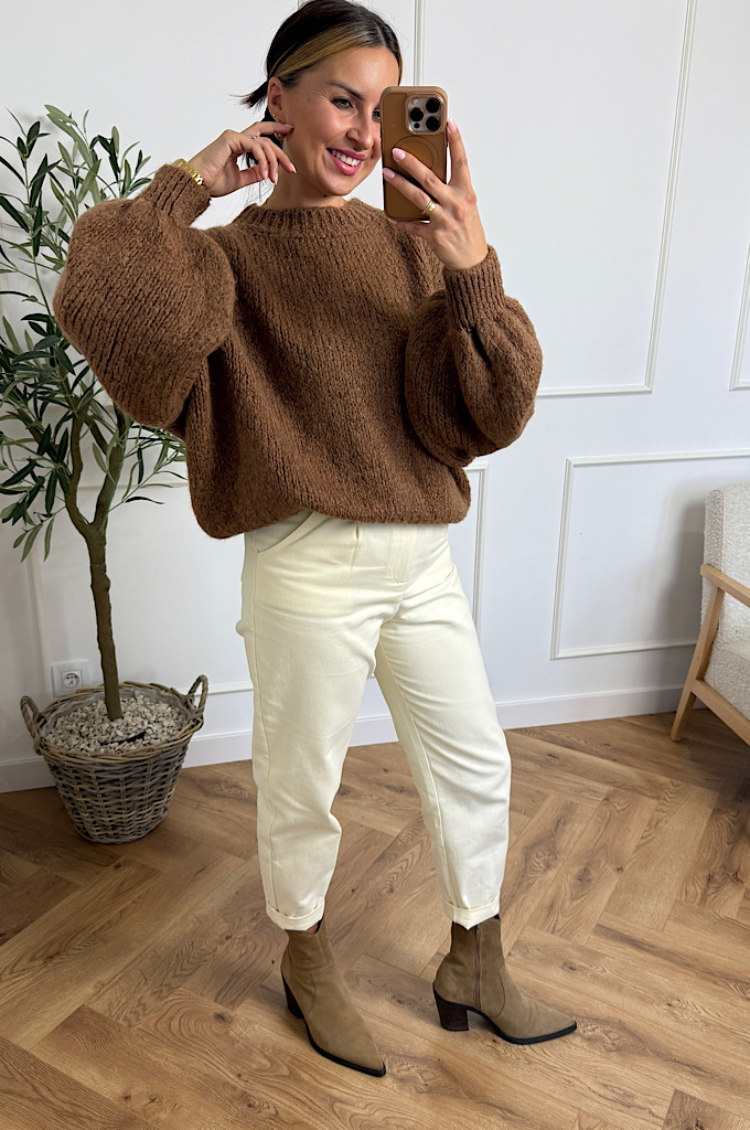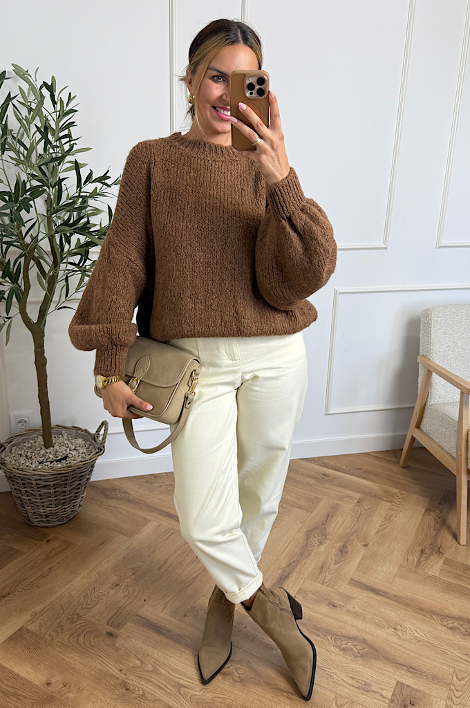 Wykonany z miękkiej, przyjemnej tkaniny, zapewnia komfort noszenia, a  bufiaste rękawy dodają charakteru  każdej stylizacji. Luźny krój, rękaw szeroki, z wełną i moherem to doskonały wybór na chłodniejsze dni, łącząc ciepło, miękkość i elegancję. Moher, pozyskiwany z sierści angorskich kóz, dodaje lekkości, połysku i wyjątkowej delikatności, podczas gdy wełna zapewnia izolację termiczną, co sprawia, że taki sweter jest zarówno ciepły, jak i przyjemny w dotyku.Swetry z tej mieszanki charakteryzują się nie tylko komfortem, ale również trwałością.
