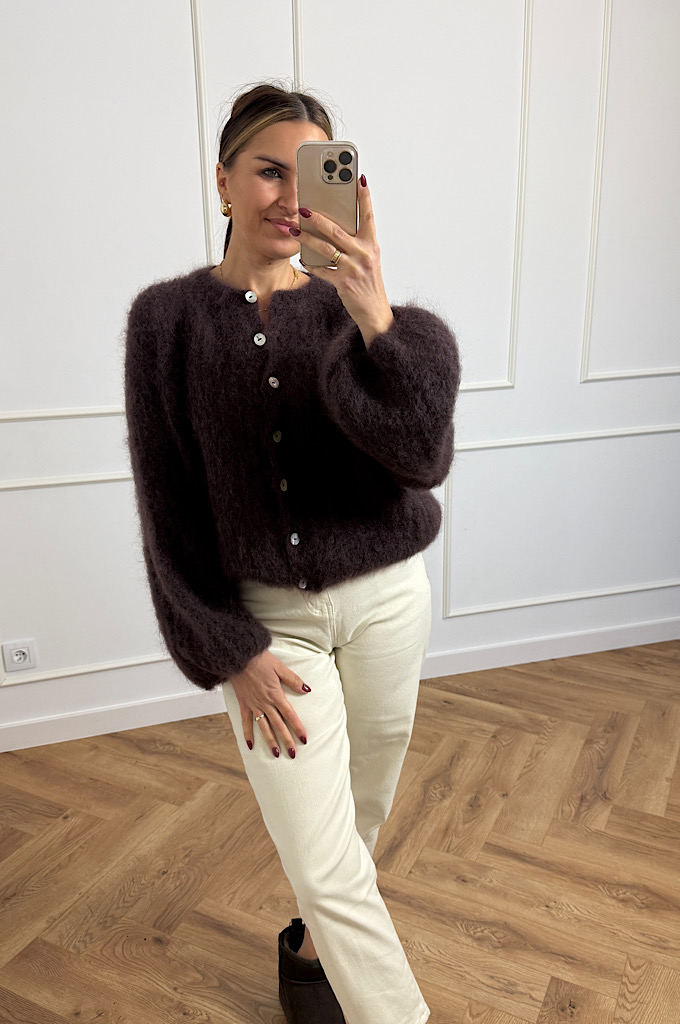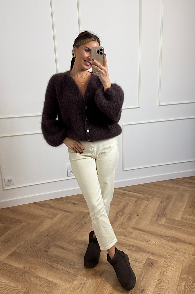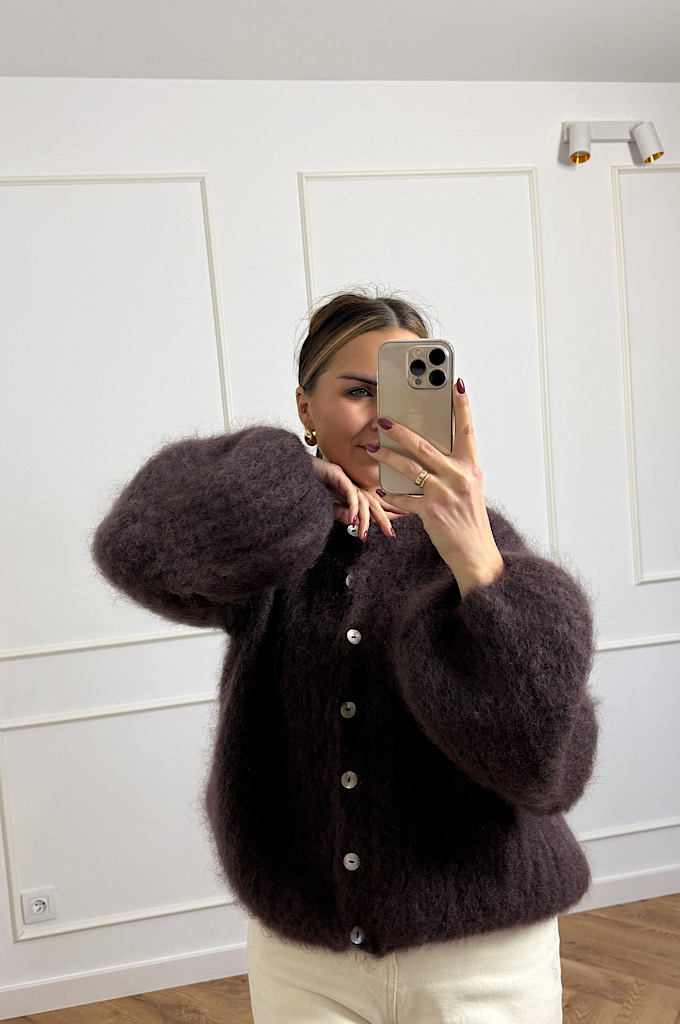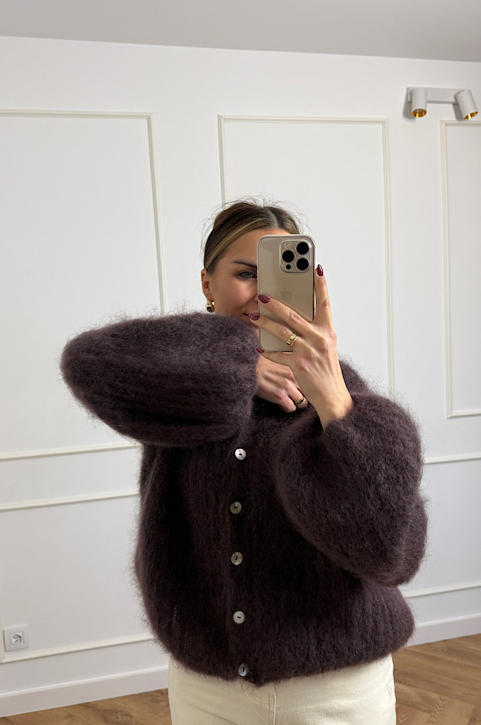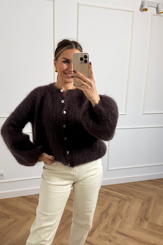 Wykonany z miękkiej, naturalnej  tkaniny, zapewnia komfort noszenia, a  bufiaste rękawy dodają charakteru  każdej stylizacji. Luźny krój, rękaw szeroki, z moherem to doskonały wybór na chłodniejsze dni, łącząc ciepło, miękkość i elegancję. Moher, pozyskiwany z sierści angorskich kóz, dodaje lekkości, połysku i wyjątkowej delikatności -jest zarówno ciepły, jak i przyjemny w dotyku.Swetry z tej mieszanki charakteryzują się nie tylko komfortem, ale również trwałością. Sweter zapinana na guziki.