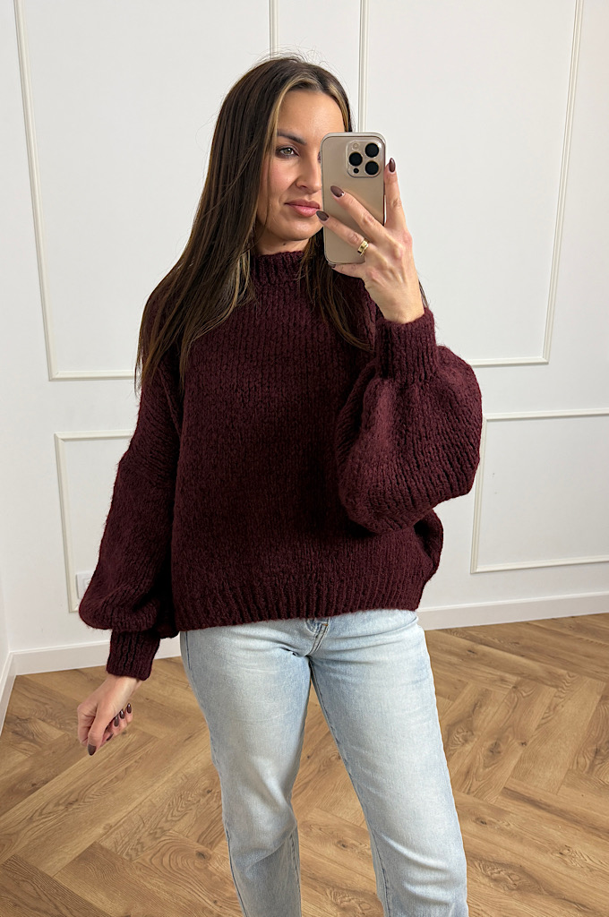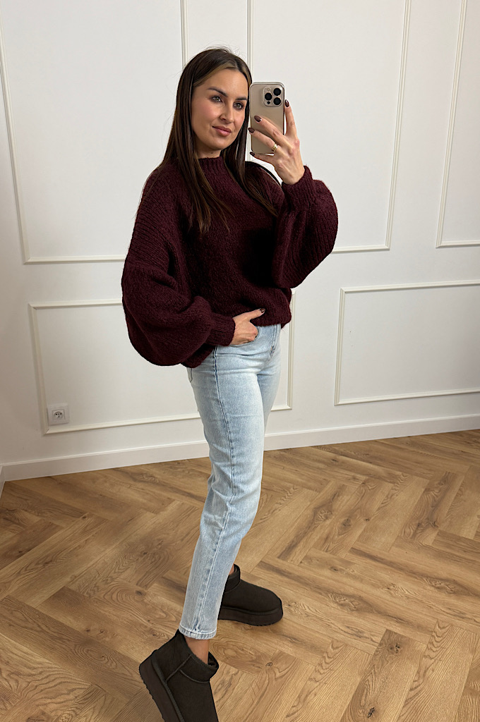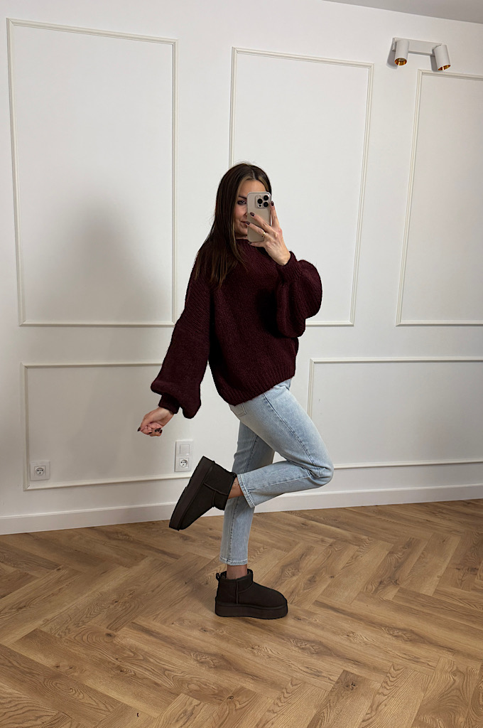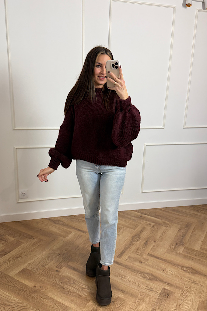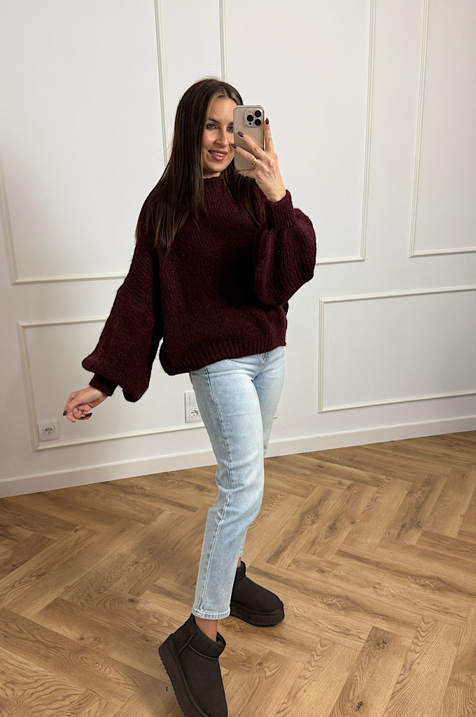 Wykonany z miękkiej, przyjemnej tkaniny, zapewnia komfort noszenia, a  bufiaste rękawy dodają charakteru  każdej stylizacji. Luźny krój, rękaw szeroki, z wełną i moherem to doskonały wybór na chłodniejsze dni, łącząc ciepło, miękkość i elegancję. Moher, pozyskiwany z sierści angorskich kóz, dodaje lekkości, połysku i wyjątkowej delikatności, podczas gdy wełna zapewnia izolację termiczną, co sprawia, że taki sweter jest zarówno ciepły, jak i przyjemny w dotyku.Swetry z tej mieszanki charakteryzują się nie tylko komfortem, ale również trwałością.