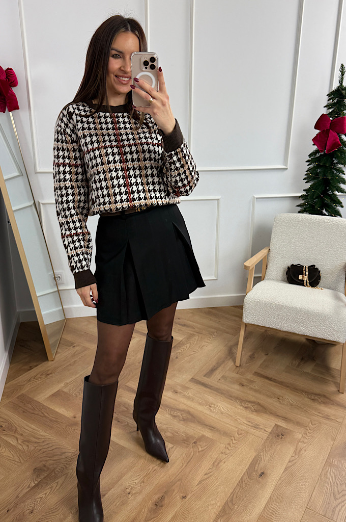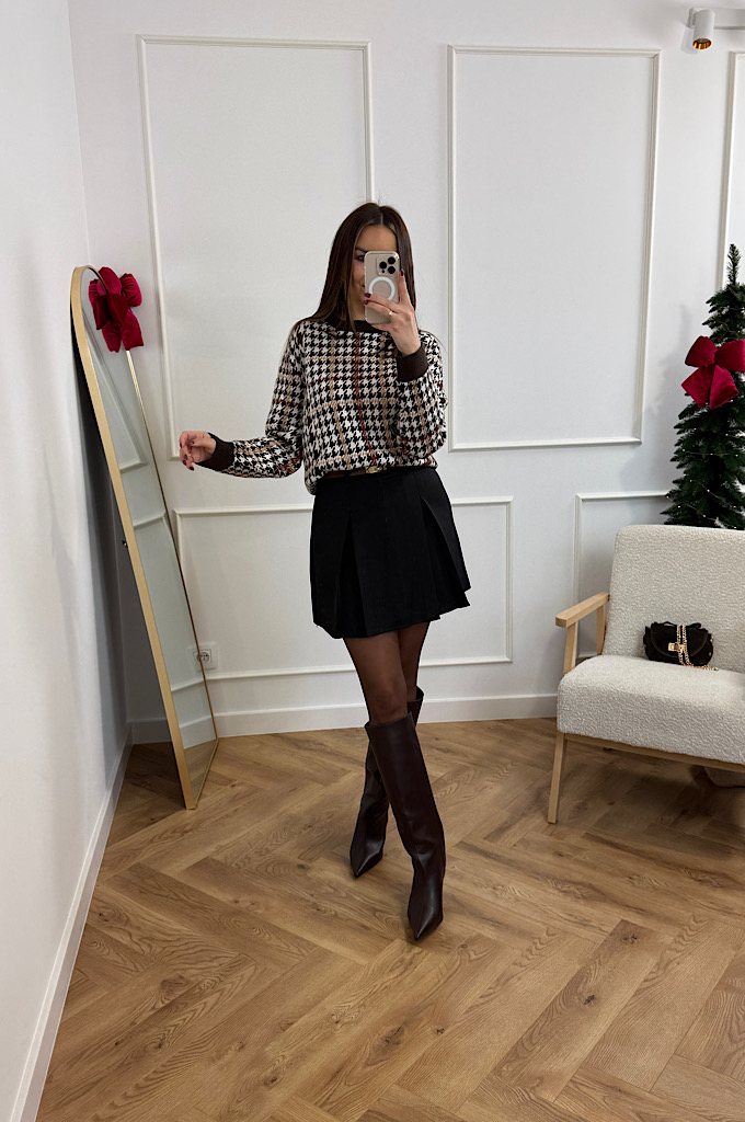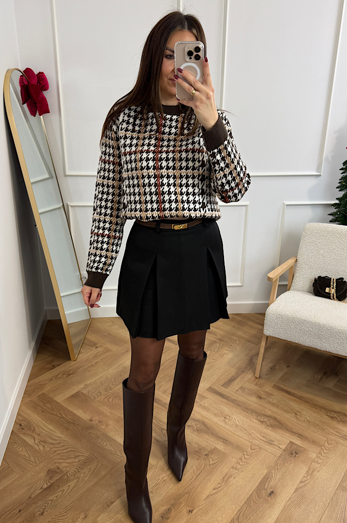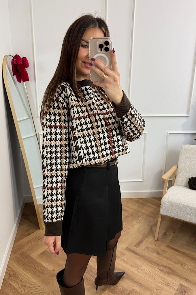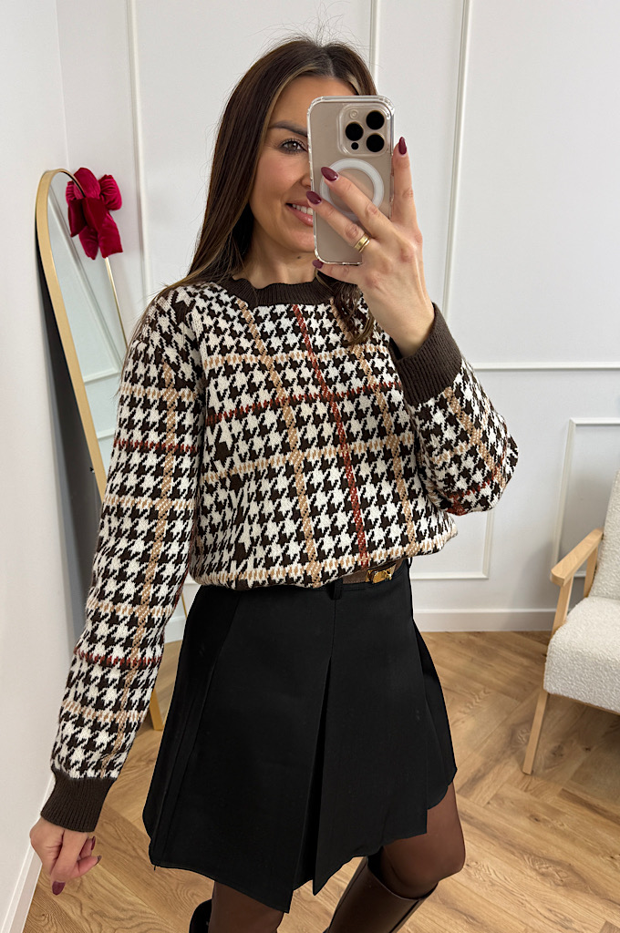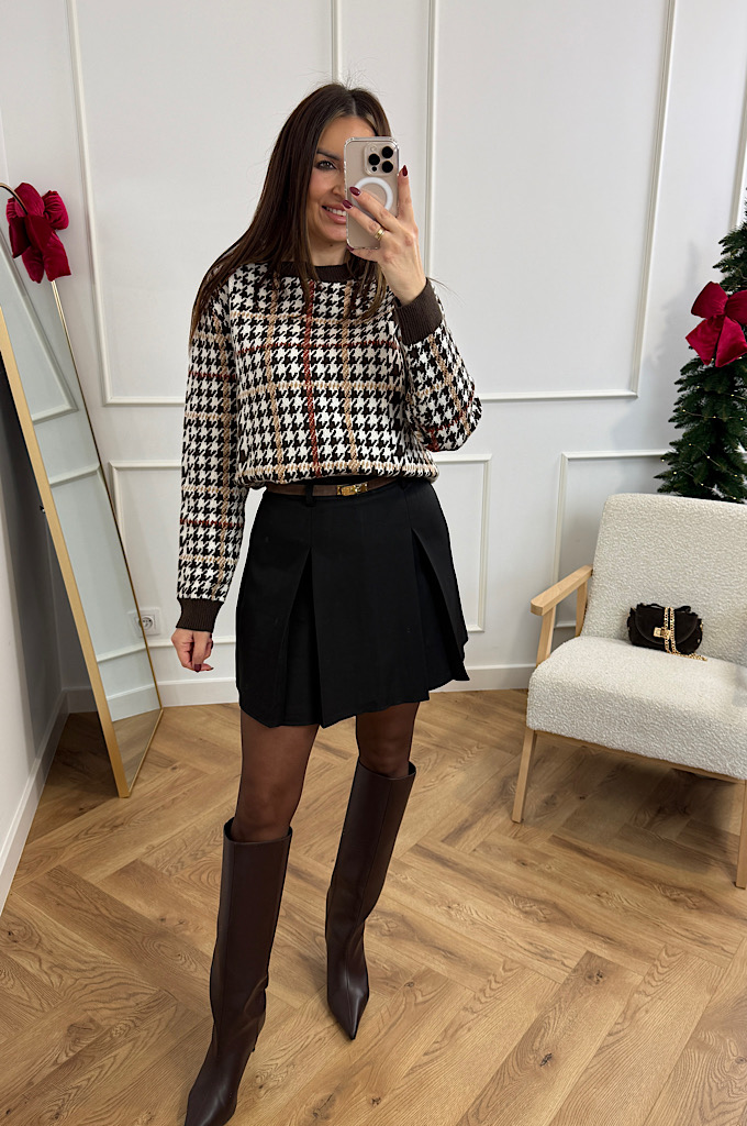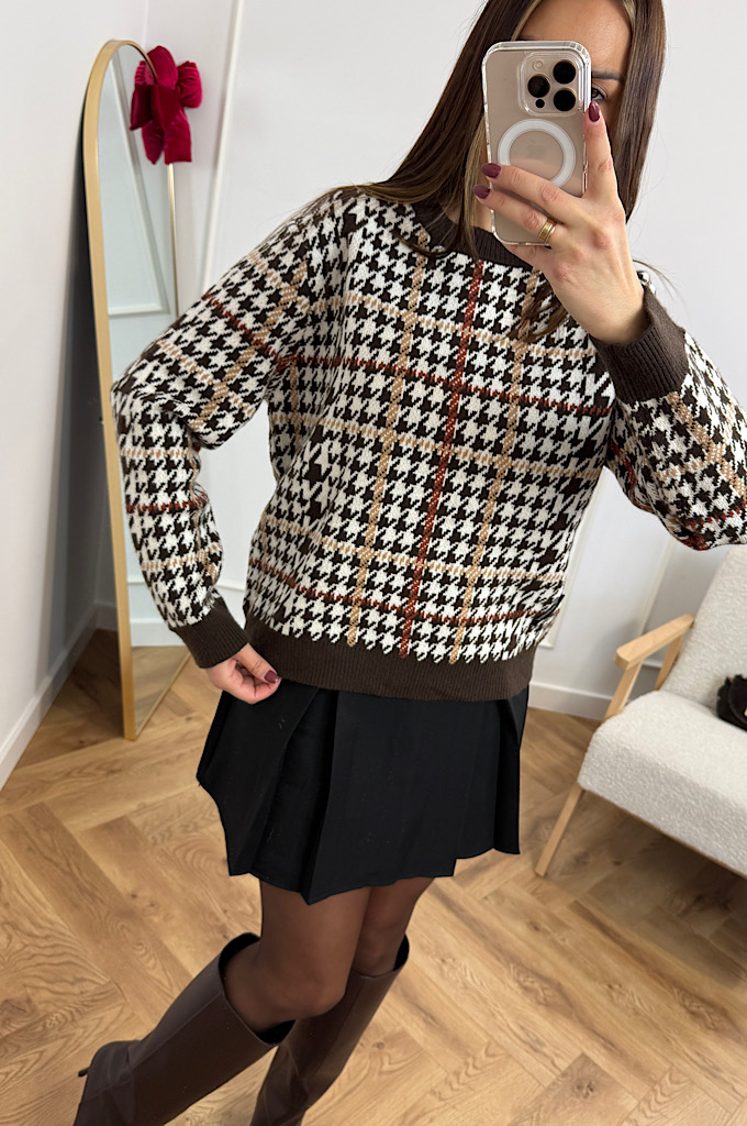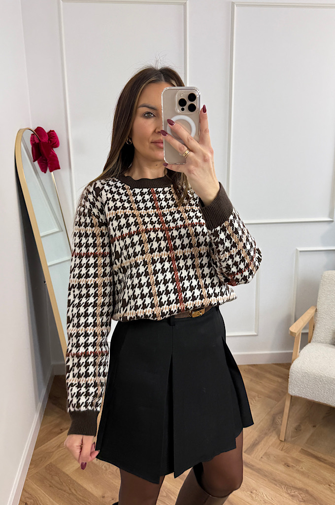 Stylowy sweter, który łączy ponadczasowy wzór z nowoczesną paletą kolorów. Model wykonany z miękkiej, przyjemnej w dotyku dzianiny o średniej grubości — idealnej na sezon jesień–zima. Motyw pepitki przełamany jest delikatnymi brązowymi i karmelowymi akcentami, które dodają mu ciepła i elegancji. Ściągacze przy rękawach, dekolcie i dole swetra sprawiają, że świetnie trzyma fason i pięknie układa się na sylwetce.