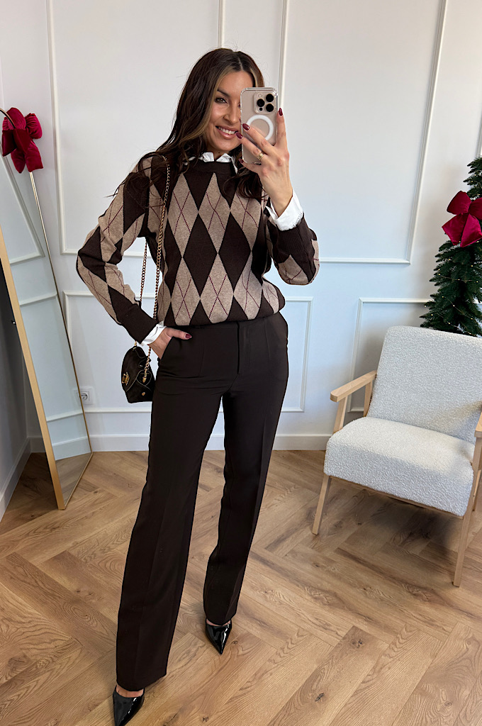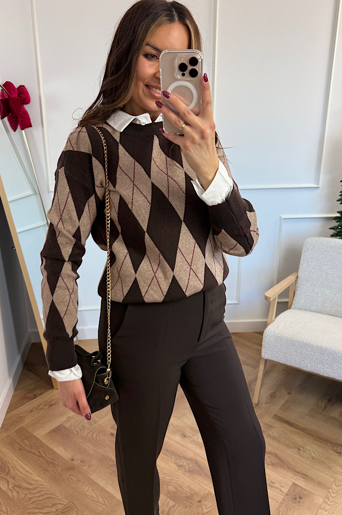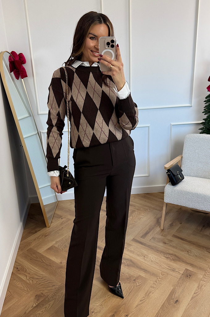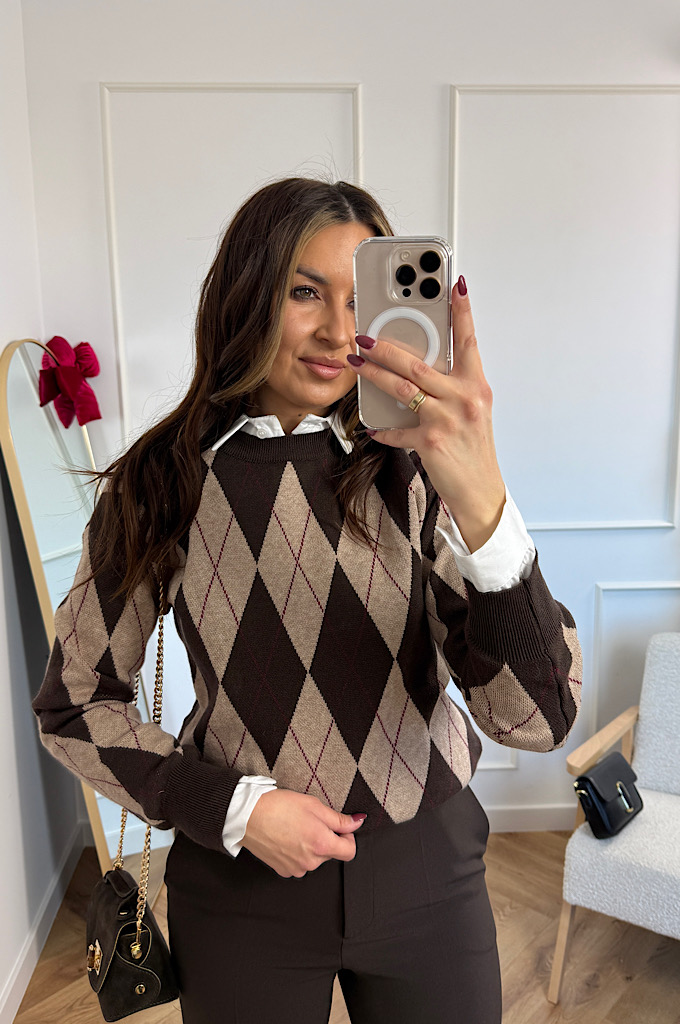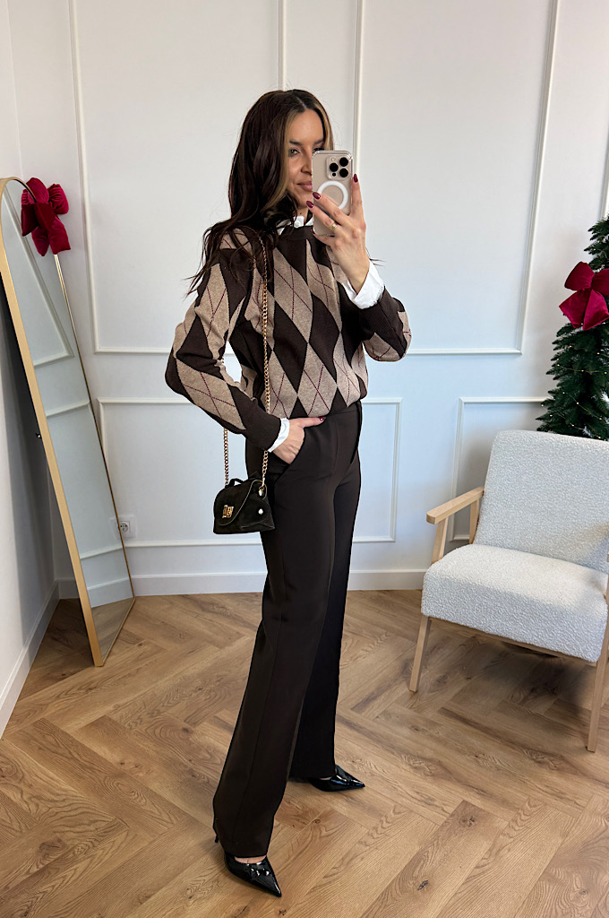 Stylowy sweter w ponadczasowy wzór rombów (argyle), który idealnie wpisuje się w eleganckie, a jednocześnie codzienne stylizacje. Utrzymany w ciepłej palecie brązów i czerni, świetnie podkreśla urodę i dodaje stylizacji charakteru. Wykonany z miękkiej, przyjemnej w dotyku dzianiny, która zapewnia komfort noszenia przez cały dzień. Klasyczne wykończenia przy dekolcie, rękawach i dole swetra pięknie utrzymują fason i sprawiają, że model prezentuje się bardzo schludnie i kobieco.