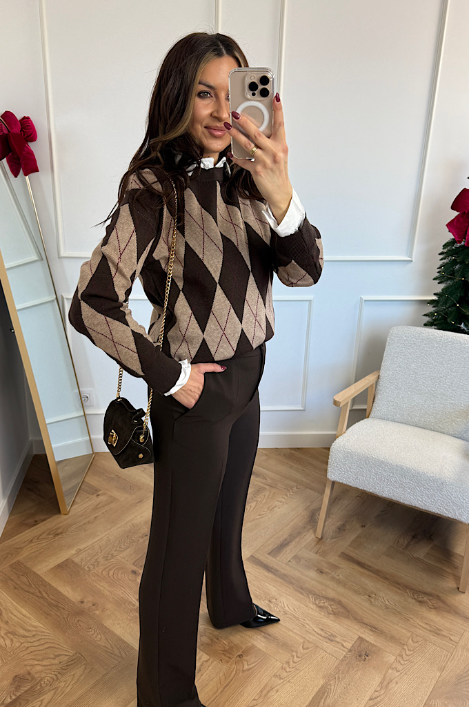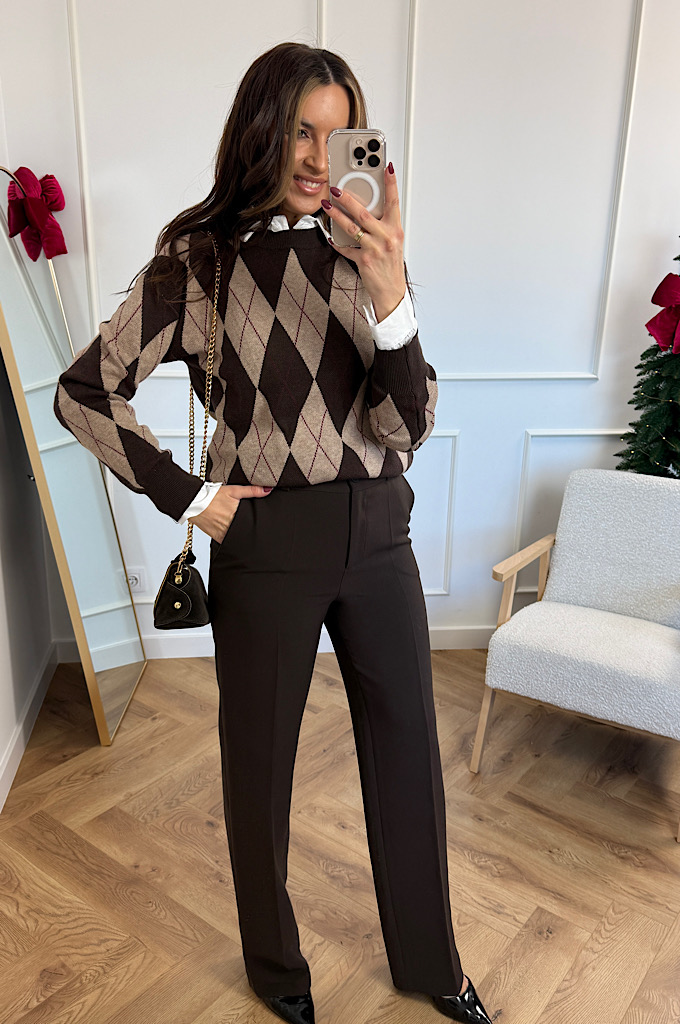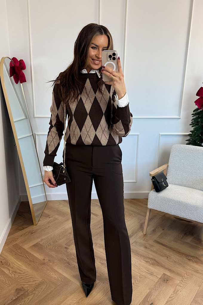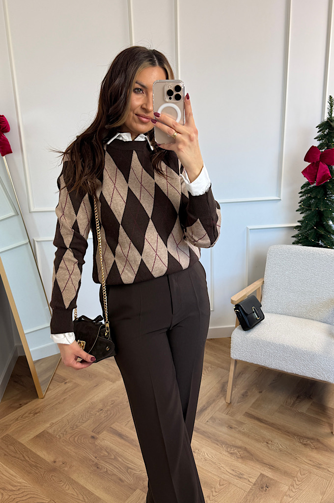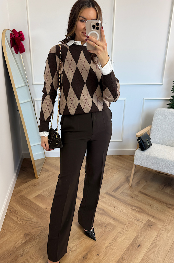 Stylowy sweter w ponadczasowy wzór rombów (argyle), który idealnie wpisuje się w eleganckie, a jednocześnie codzienne stylizacje. Utrzymany w ciepłej palecie brązów i czerni, świetnie podkreśla urodę i dodaje stylizacji charakteru. Wykonany z miękkiej, przyjemnej w dotyku dzianiny, która zapewnia komfort noszenia przez cały dzień. Klasyczne wykończenia przy dekolcie, rękawach i dole swetra pięknie utrzymują fason i sprawiają, że model prezentuje się bardzo schludnie i kobieco.
