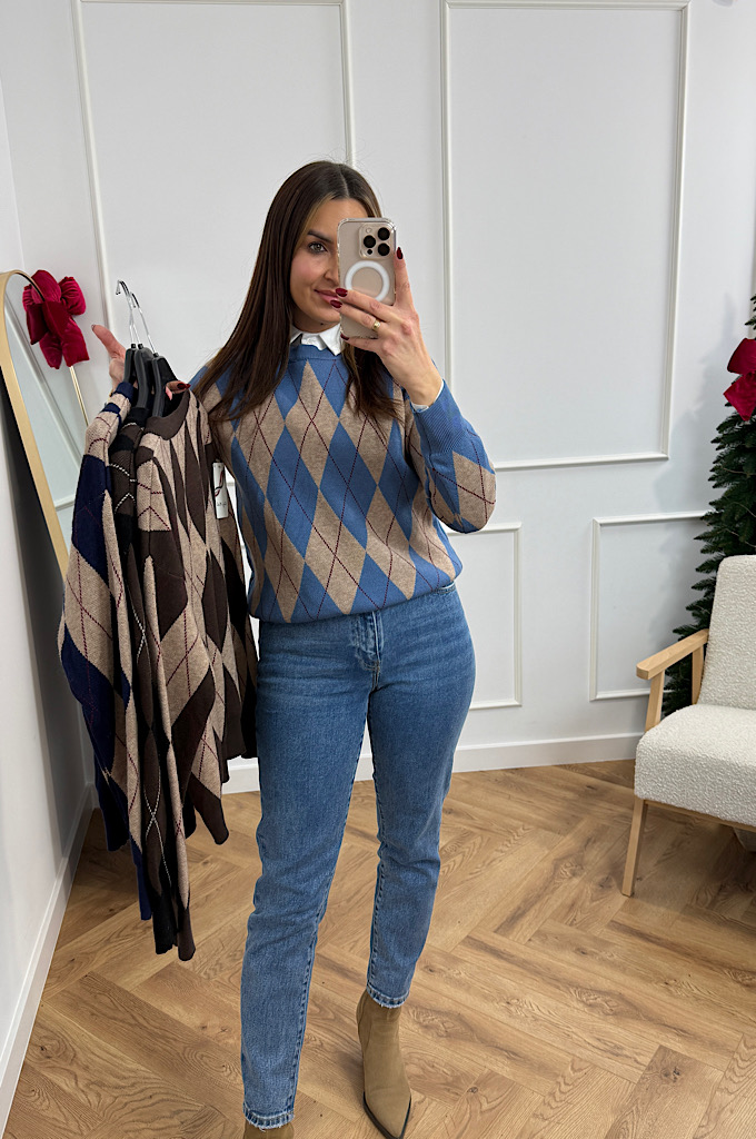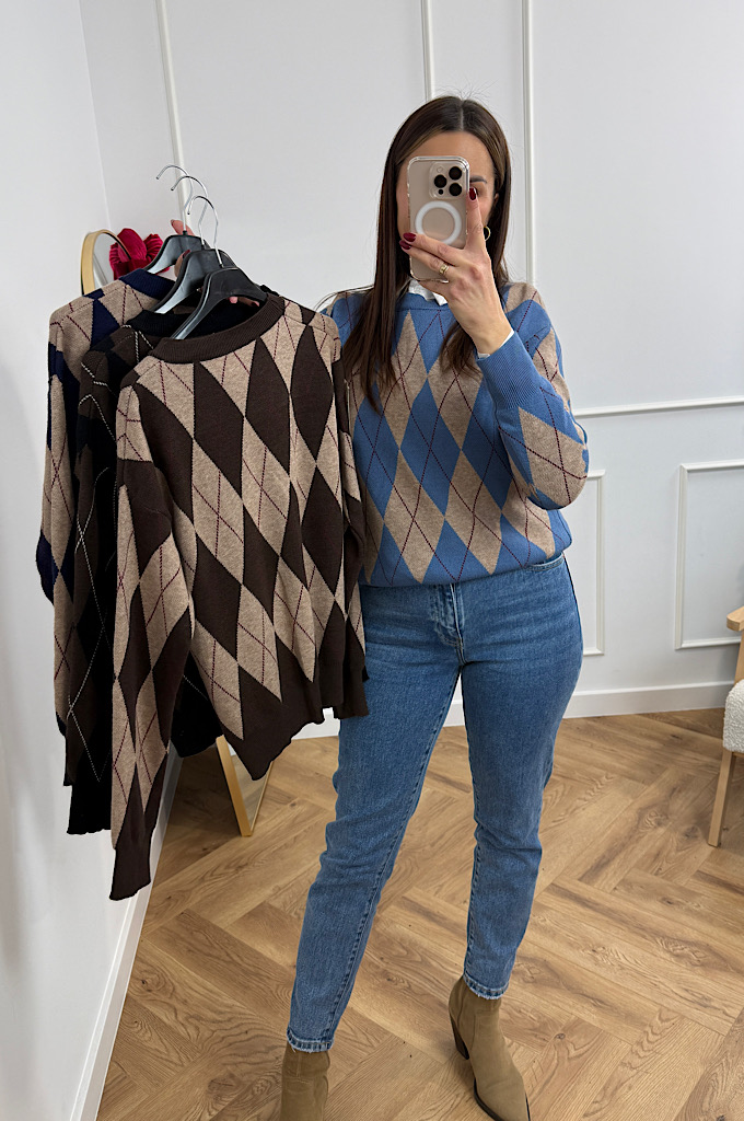 Stylowy sweter w ponadczasowy wzór rombów (argyle), który idealnie wpisuje się w eleganckie, a jednocześnie codzienne stylizacje. Utrzymany w ciepłej palecie brązów i czerni, świetnie podkreśla urodę i dodaje stylizacji charakteru. Wykonany z miękkiej, przyjemnej w dotyku dzianiny, która zapewnia komfort noszenia przez cały dzień. Klasyczne wykończenia przy dekolcie, rękawach i dole swetra pięknie utrzymują fason i sprawiają, że model prezentuje się bardzo schludnie i kobieco.