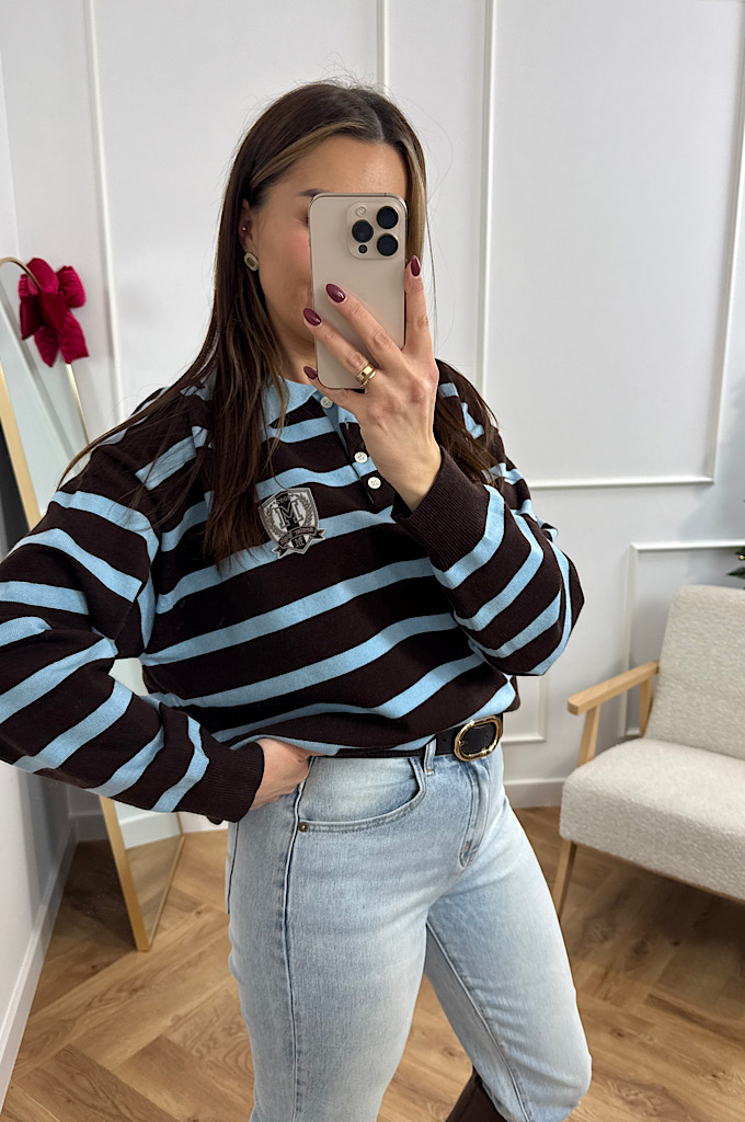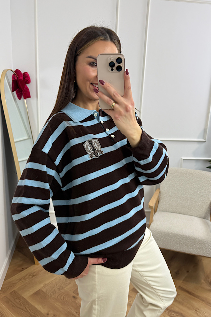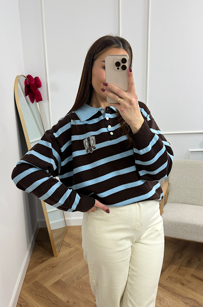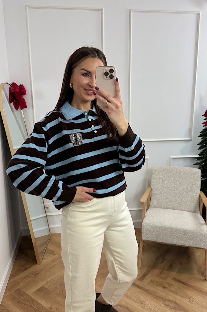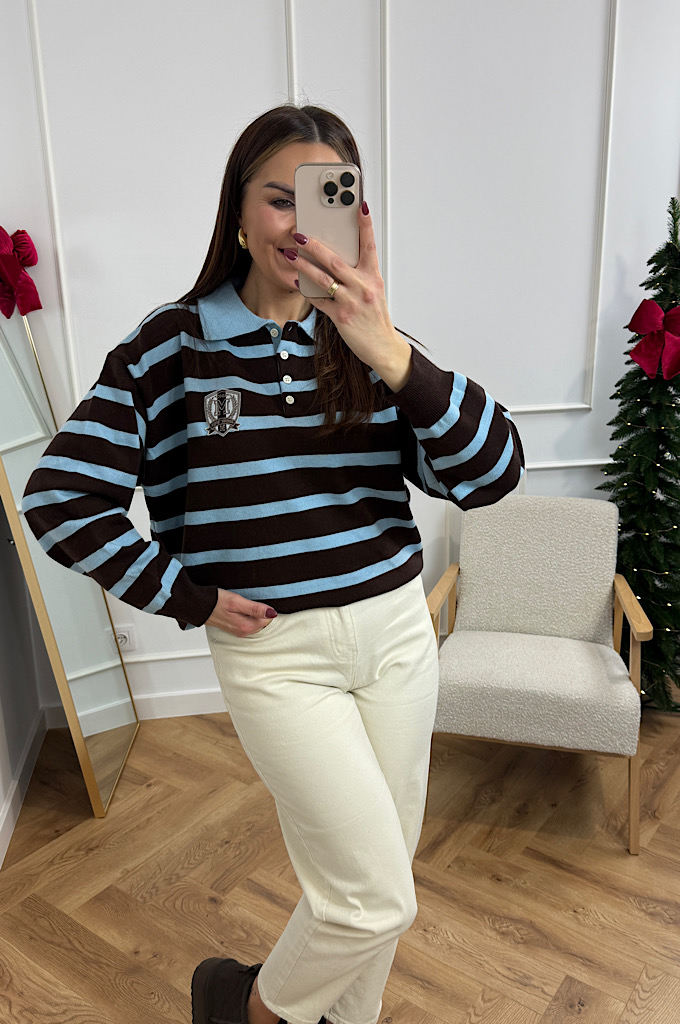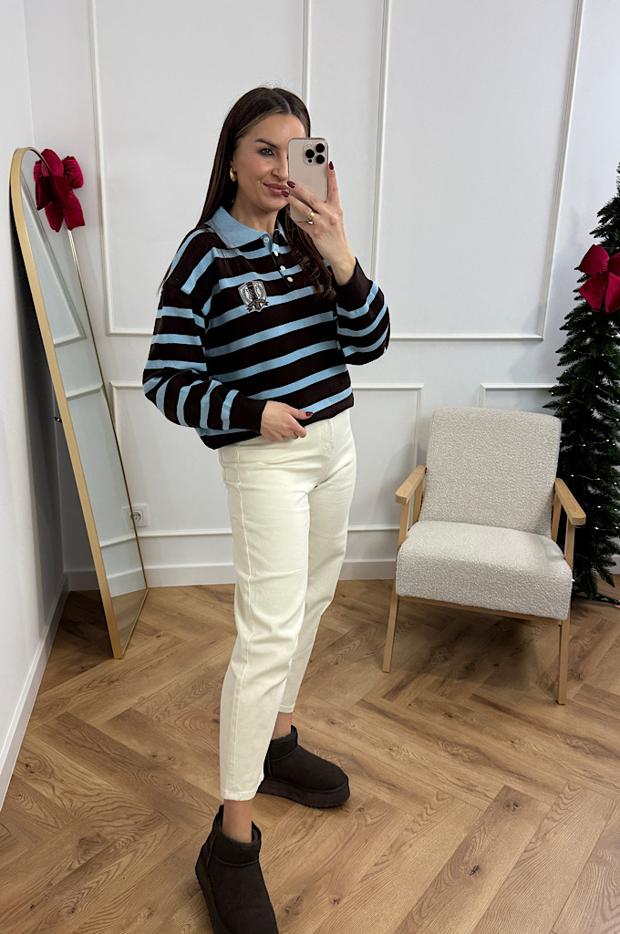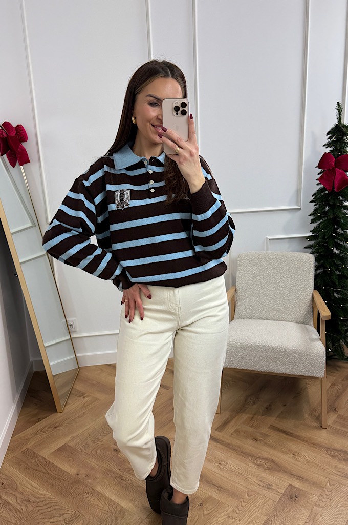 Stylowy, prążkowany sweterek o sportowym charakterze, utrzymany w modnym połączeniu czekoladowego brązu i błękitu. Model wyróżniają szerokie, poziome pasy oraz kołnierzyk zapinany na trzy guziki, dzięki czemu sweter zyskuje lekko „college’owy” vibe. Na piersi znajduje się ozdobna aplikacja, która dodaje całości unikatowego wyrazu. Sweter ma luźniejszy krój i miękką, przyjemną w dotyku dzianinę, zapewniając komfort przez cały dzień.