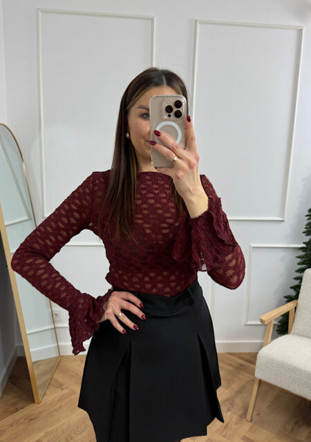 Ta burgundowa bluzka wykonana z delikatnej, ażurowej koronki to model, który podkreśla kobiecość w najpiękniejszym wydaniu. Jej dopasowany fason w połączeniu z transparentnymi, długimi rękawami tworzy efekt subtelnej zmysłowości, a jednocześnie pełnej klasy elegancji. Wyjątkowym detalem są efektowne, rozszerzane mankiety z falbaną, które dodają lekkości i modowego charakteru. Bluzka świetnie układa się na sylwetce i…