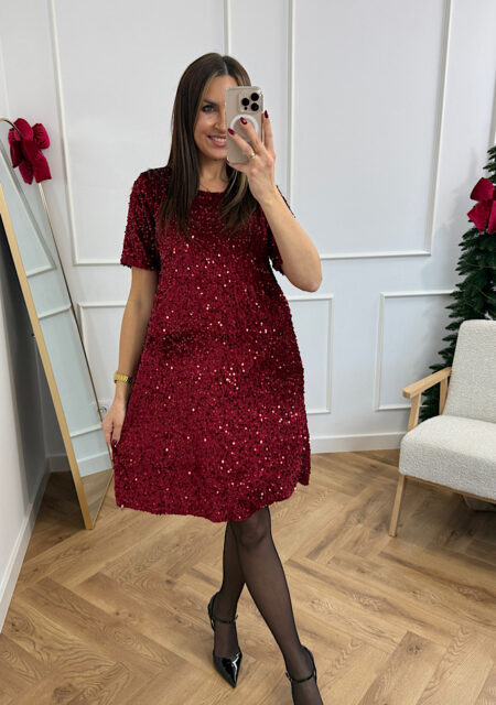 Cekinowa sukienka z krótkim rękawem – elegancka sukienka na święta, sylwestra i wesele. Ta efektowna czerwona sukienka z cekinami to model, który natychmiast przyciąga spojrzenia. Wykonana z połyskującego materiału, pięknie odbija światło i podkreśla sylwetkę, jednocześnie zapewniając komfort noszenia. Luźniejszy fason typu A świetnie sprawdzi się u kobiet, które cenią wygodę i chcą subtelnie zatuszować…