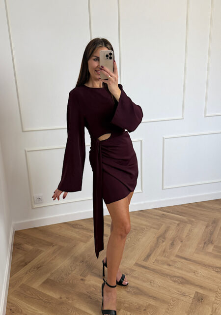 Elegancka sukienka mini w kolorze głębokiego burgundu to idealna propozycja na wyjątkowe okazje — wesela, przyjęcia czy romantyczne kolacje. Model zachwyca prostotą i nowoczesnym krojem. Długie, luźne rękawy nadają jej lekkości, a delikatne wycięcie w talii subtelnie podkreśla kobiecą sylwetkę. Drapowanie i wiązanie po boku pięknie modelują figurę, tworząc efekt optycznego wysmuklenia. Uszyta z przyjemnego…